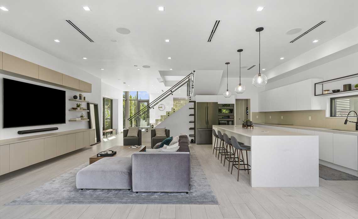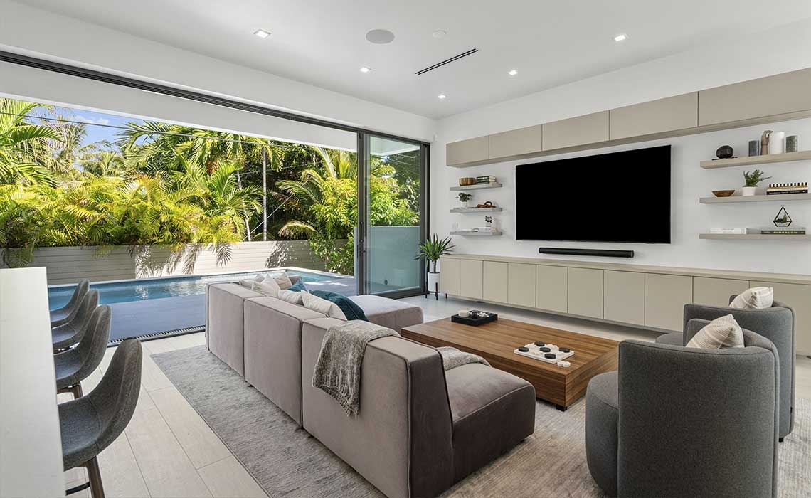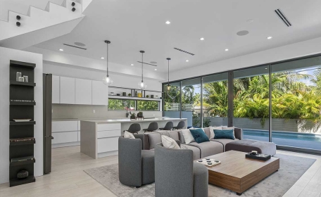Upon entering, an elevated foyer slab opens into the formal living and dining area. A stair splits the family room and kitchen, leading to the full width sliding doors that open onto the covered patio and elevated pool.