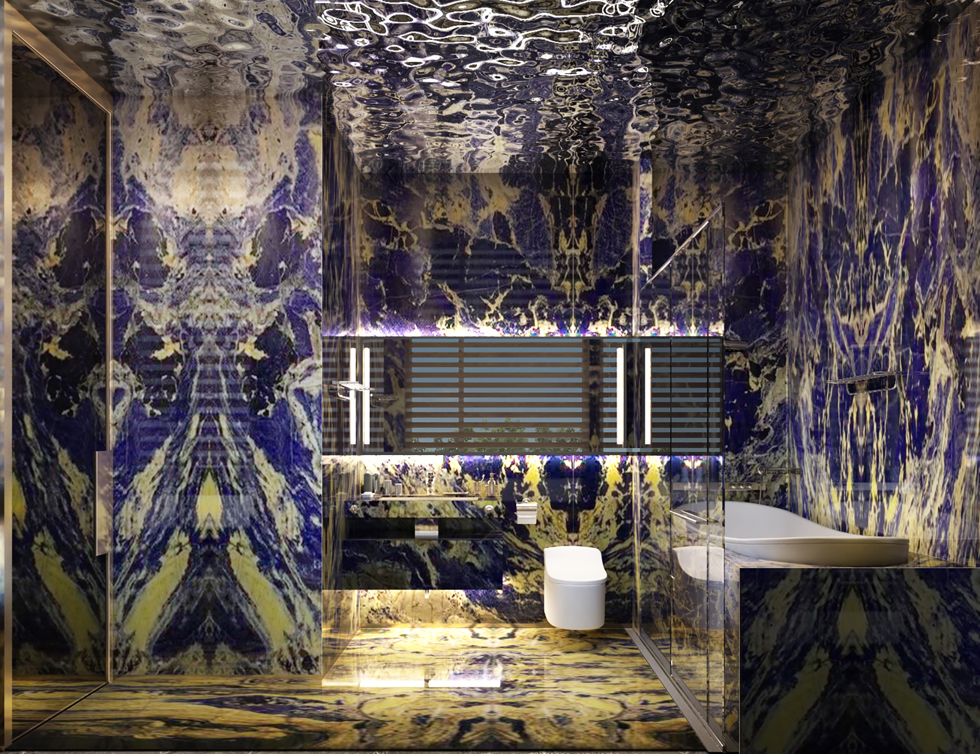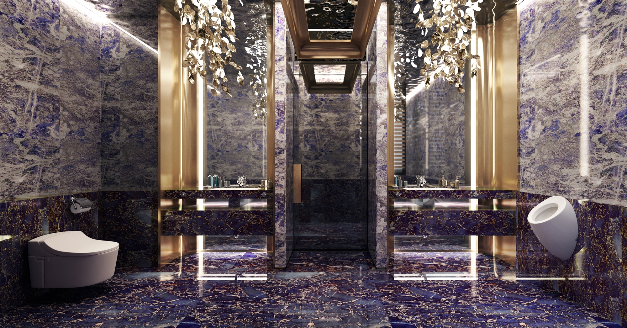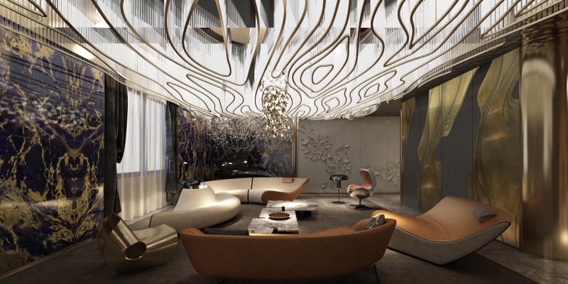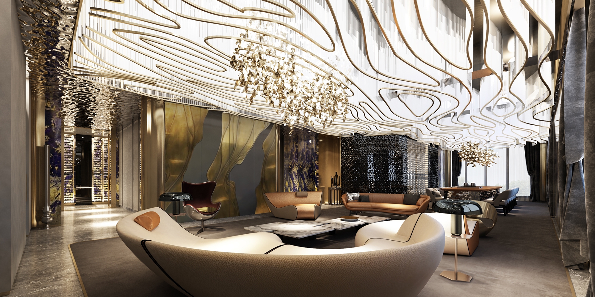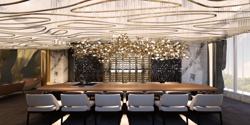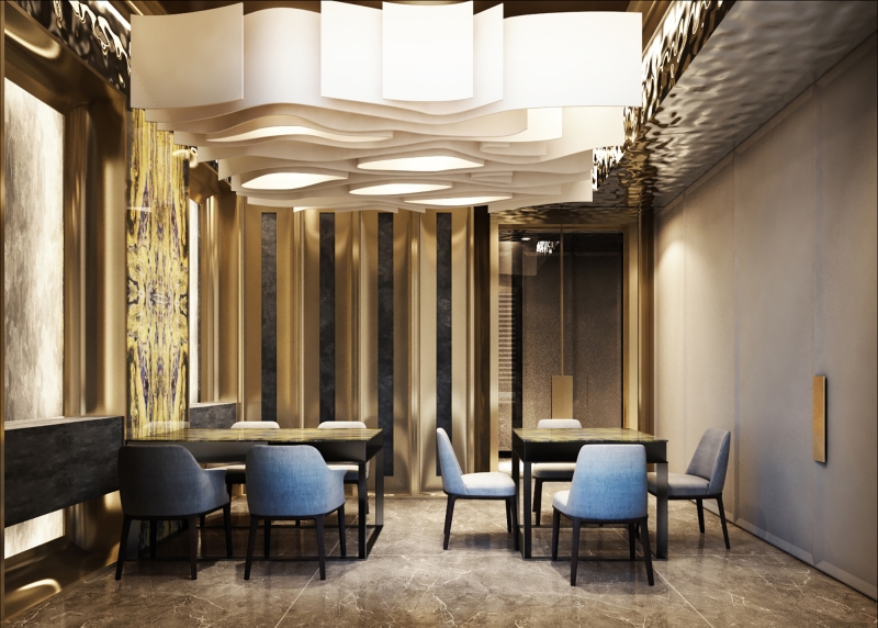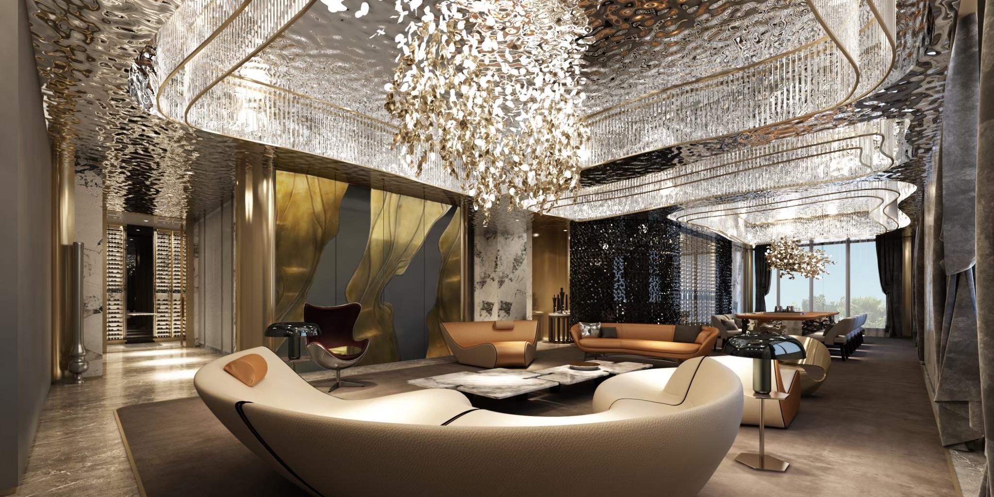 The most remarkable aspects of this space are the exquisite interior design elements, which include stainless steel water ripples, curved shapes, and metal accents.