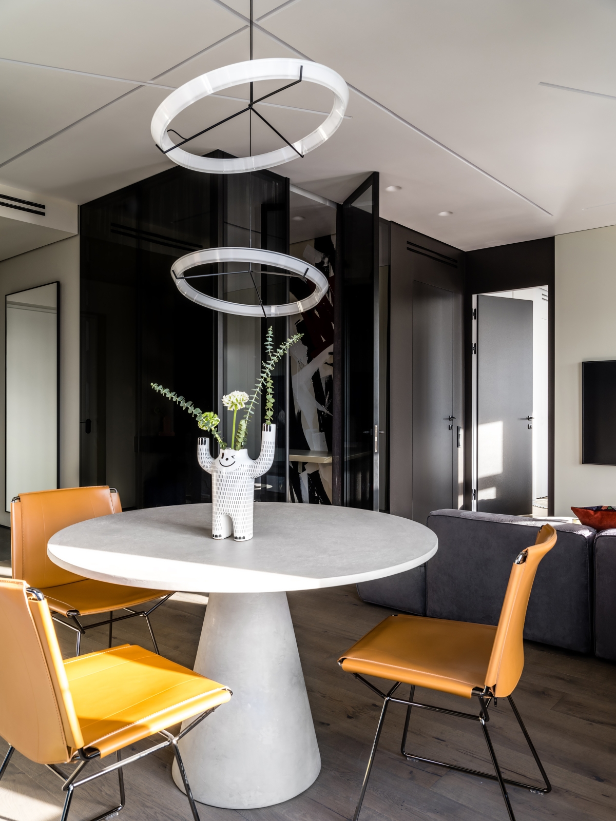 The two main colors in the interior are beige and black. The apartment is divided into “blocks” thanks to the furniture pieces and finishing.