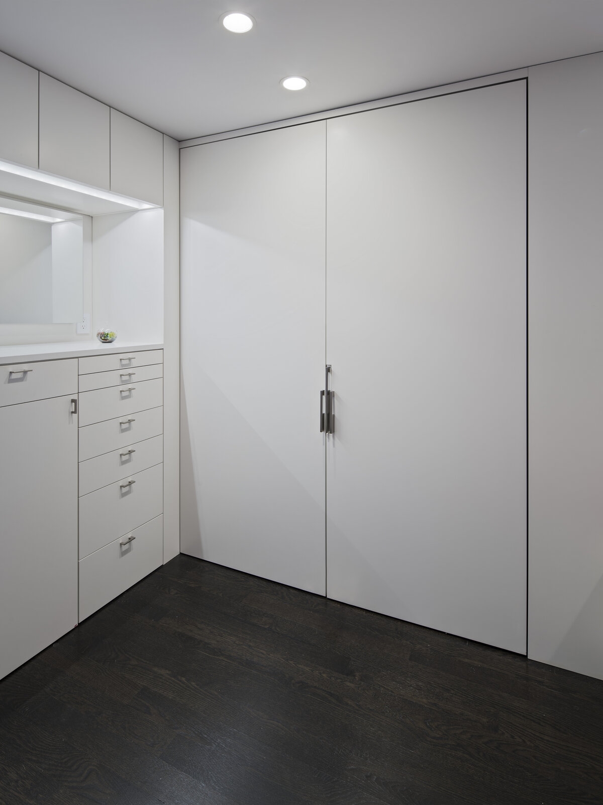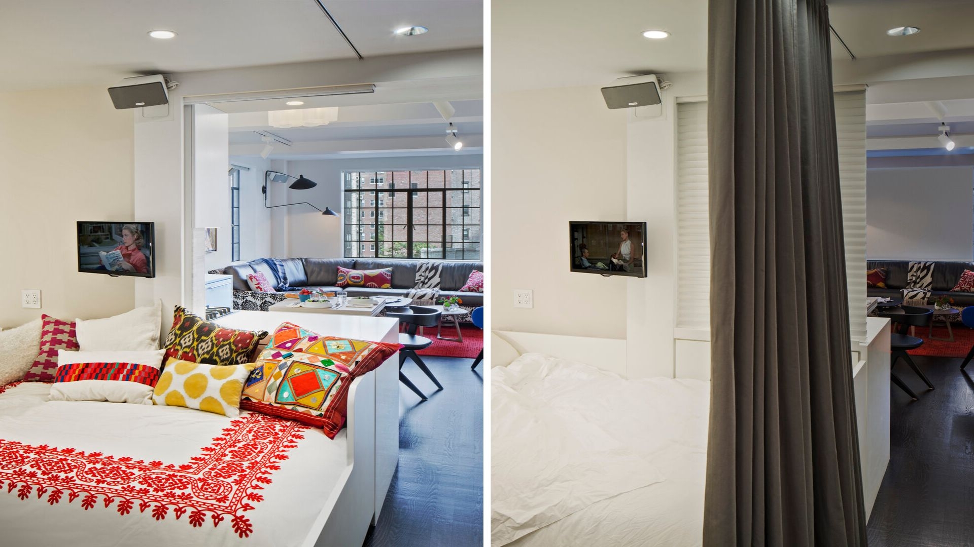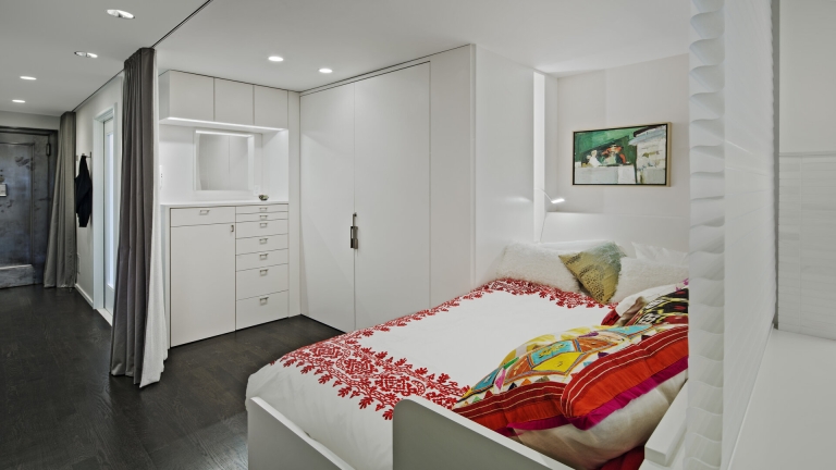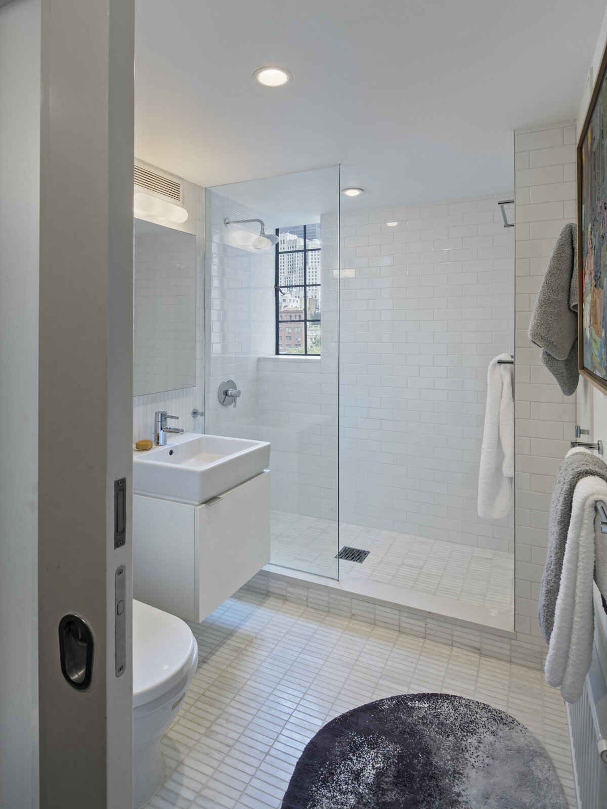 THE TRANSFORMATION: This 450sf studio acts bigger than it is. We maximized space and light and eliminated unnecessary elements. The large window now offers city views from every corner. We uncluttered the Kitchen, reused the cabinets, and moved everything below the counter. We carefully selected furniture to accommodate entertaining guests, and intimate dinners for two. We devised a spacious closet with a dressing room experience, a smart night-time configuration, and under-bed storage. Some new bathroom finishes and new art lighting elevated the studio to match its posh surroundings.