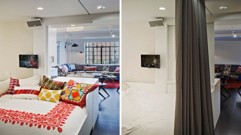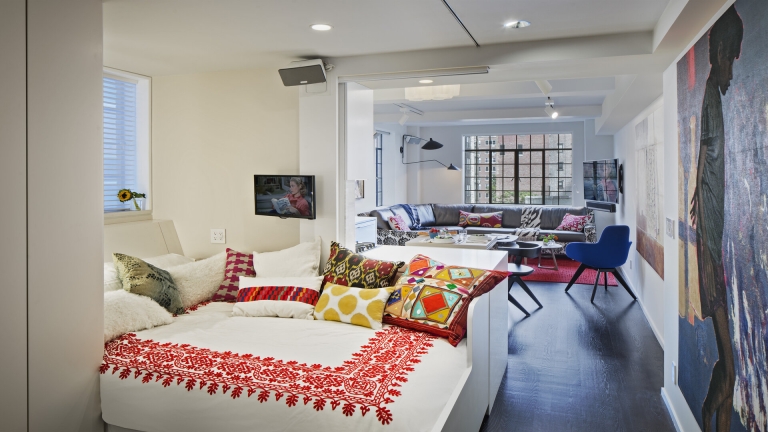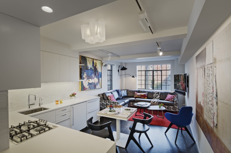 THE CHALLENGE: This 450 SF studio apartment in the fashionable Gramercy NYC neighborhood was small! The charming and large casement window was advantageous but only visible from half the apartment. There was insufficient closet space and outdated finishes. All of the solutions needed to be eco-friendly, cost-sensitive, and reuse what we could.