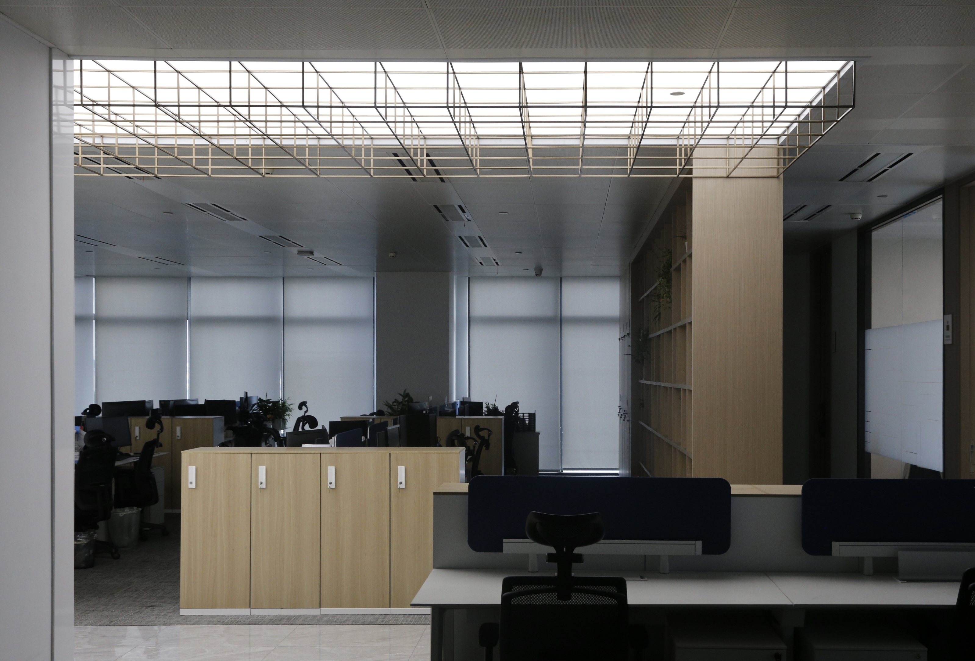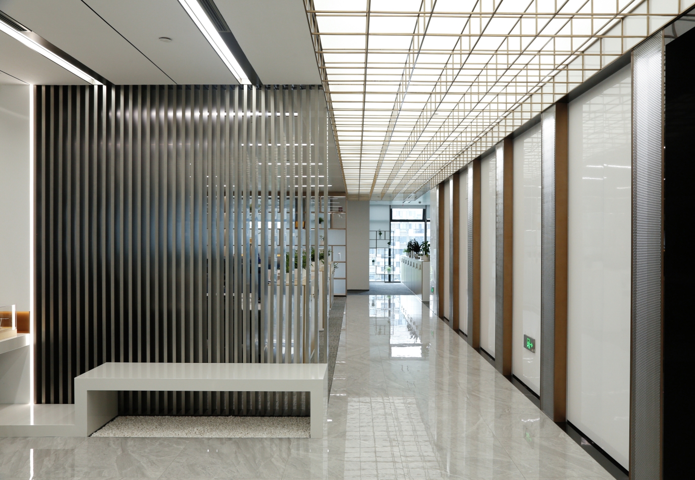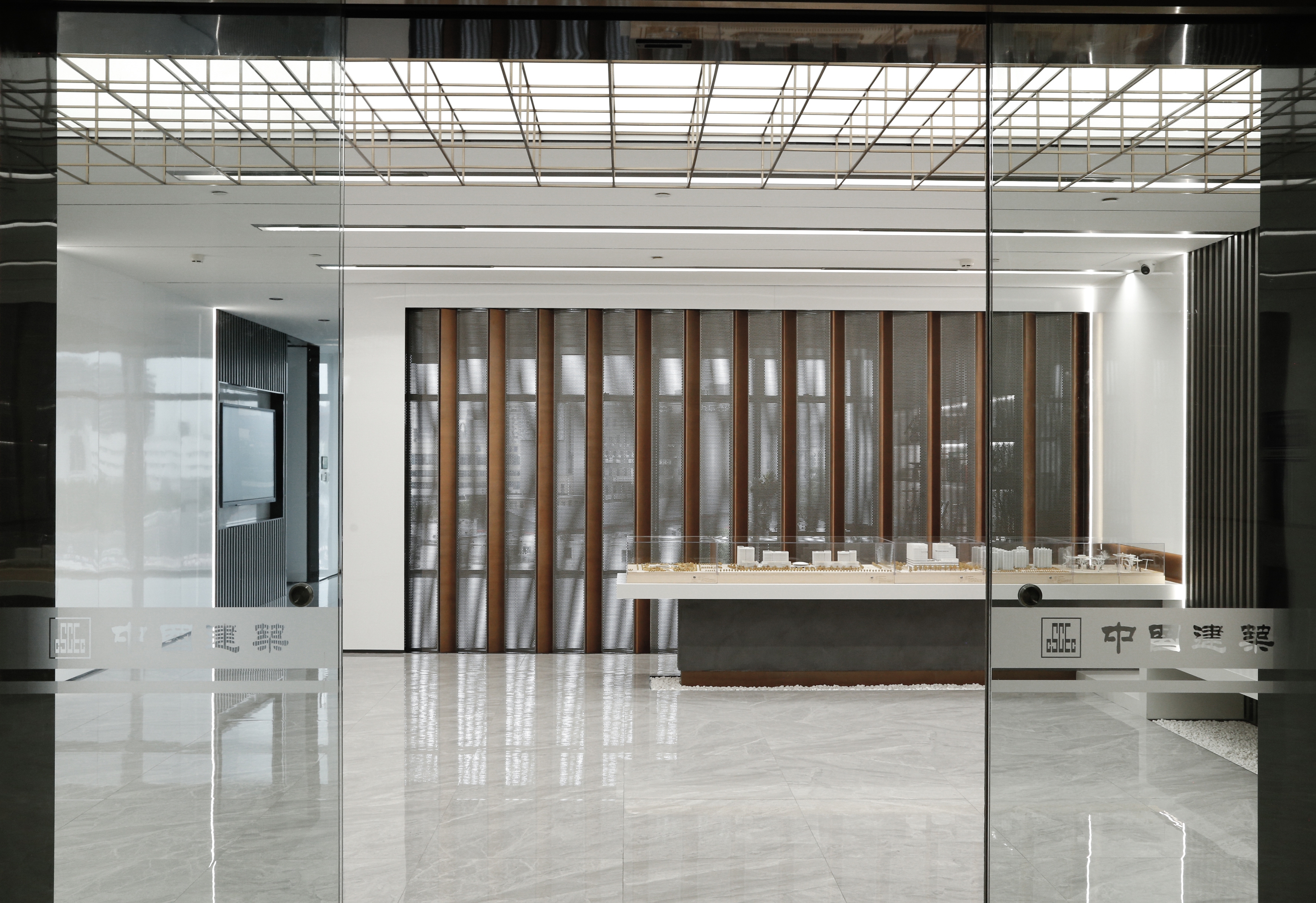 Located in Zhongjian Square, Pudong New Area, Shanghai?the whole project of CSCEC8B (SH) Design Institute Office covers an area of 1400 square meters. The unique office space is designed by a Chinese local architectural design firm, whose design team draws inspirations from ancient Chinese buildings and gardens by extracting the four elements of “hall”, “screen”, “corridor” and “frame”, and, with modern materials, translating them into a space filled with light and vitality.The design covers four main functional areas, including the main lobby, meeting room, lounge area and office area. In terms of hue, the design chooses white and brown as the main color of the space to shape a clean and bright atmosphere.