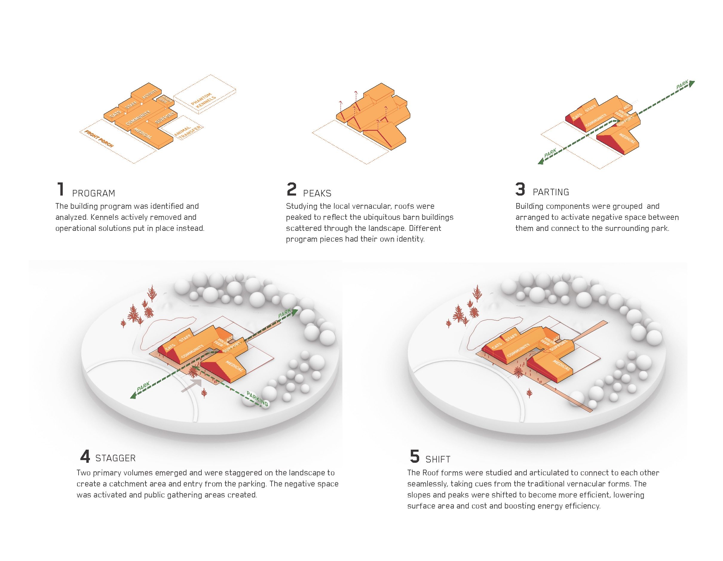 During Covid many shelters were shut down and as a result, a large network of foster parents emerged. Best Friends capitalized on this and halfway through design, we decided that the kennels had to go: The goal was to build a shelter of the future: