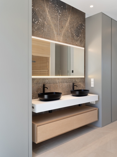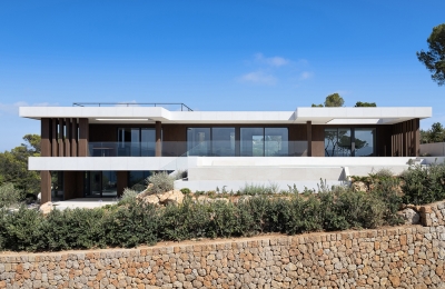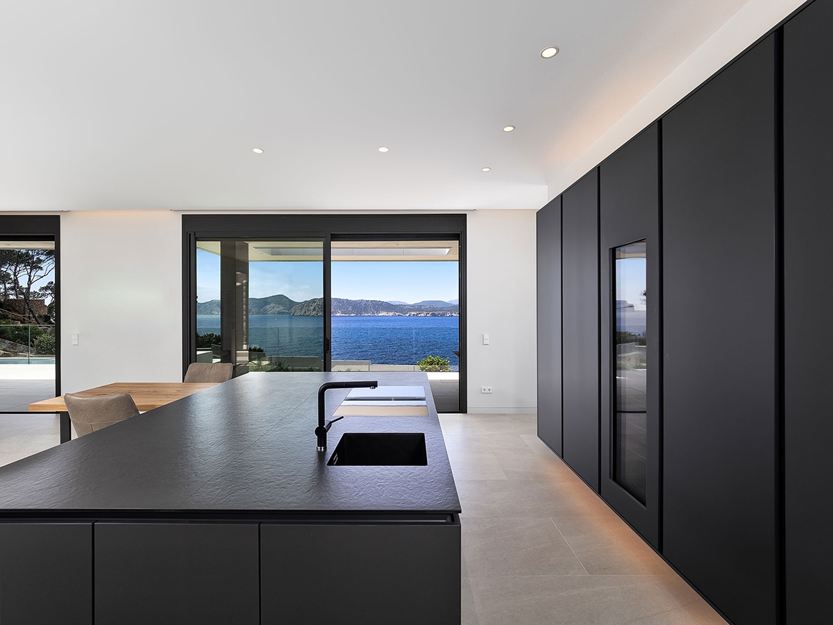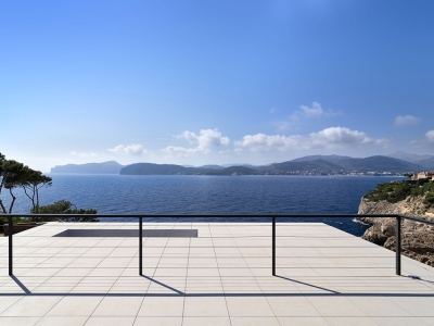 On a plot with a certain unevenness and beautiful views of the Mediterranean Sea, this custom-made 3-storey house is located. The volume of the house closes on its rear façade, which overlooks the public access road, and opens the views of all the rooms towards the sea. The large glass panels allow the spaces to establish a harmonious dialogue with the environment and blur the boundaries between interior and exterior.