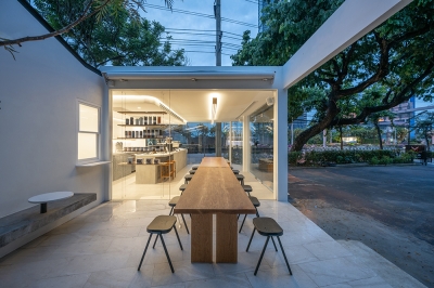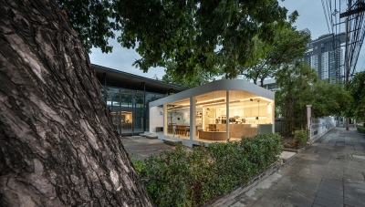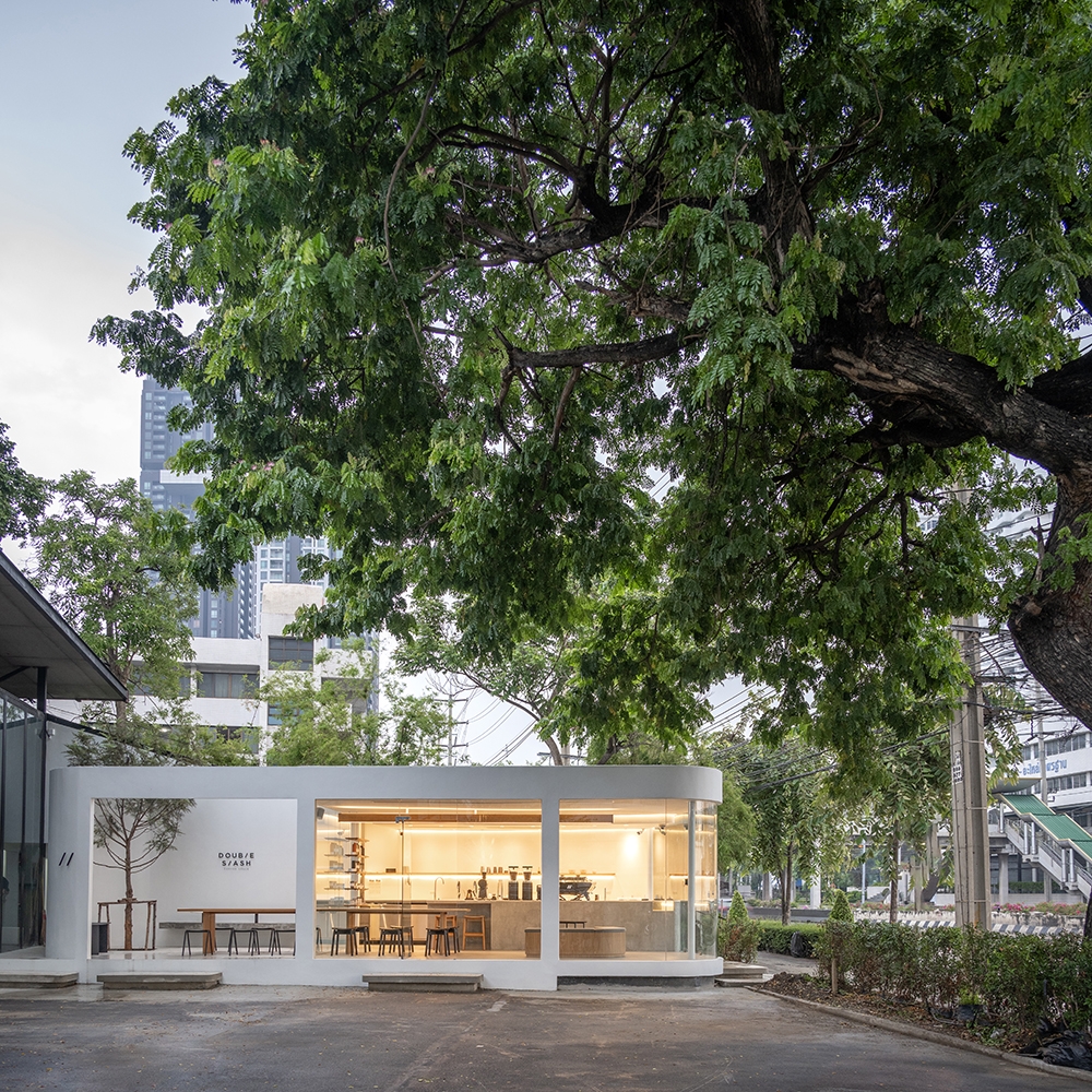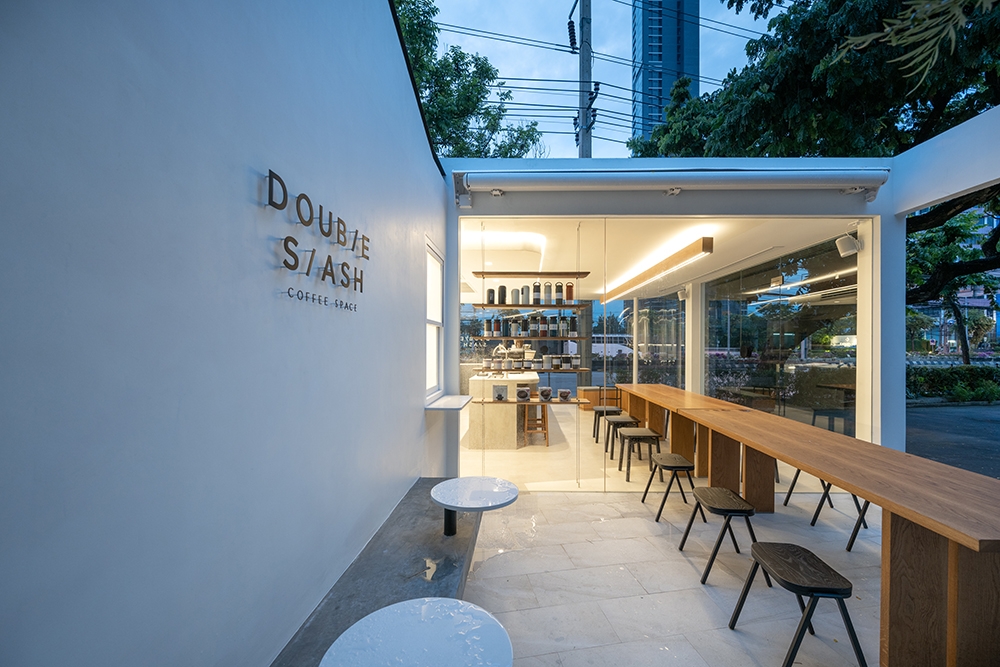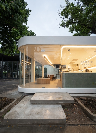 Double Slash's architectural identity was influenced by streamline moderne style during Art Deco period, when aerodynamic design was basically applied to household products and architectures. Without excess ornamentation, both curving form and angled planning orientation build flow and visual movement to the building. Under flat roof structure, the long horizontal framework with minimal distraction humbly accommodates plain space that enhances the essence of stillness and elevates artisan coffee experience within. The interior space somewhat allows customers to contemplate whatever sensation arising amidst the city of Bangkok.