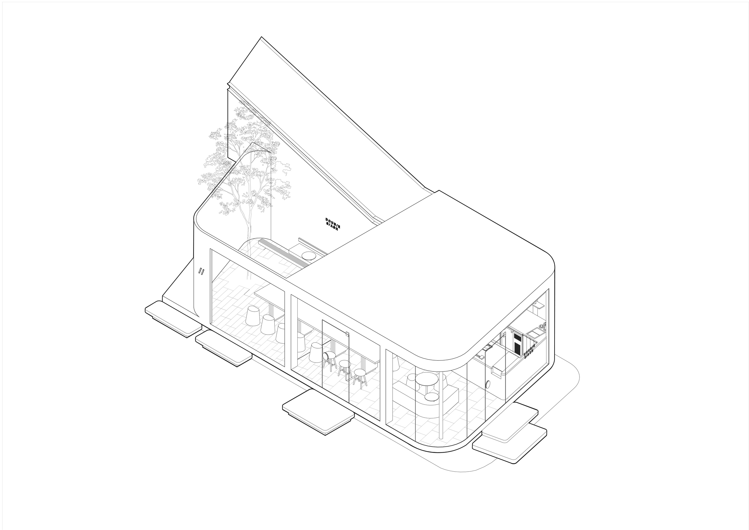 Glass panels on the architecture establish clear visibility and connectivity between interior and exterior. Curved wall and floating rounded glass corner welcome visitors from every direction and increase movement throughout the footprint. Two-toned oblique floor pattern emphasizes Double Slash’s identity and blurs the interior-exterior boundary from glass panel placed in the middle. Connected wooden tables visually link indoor space with enclosed outdoor surroundings. Concrete finishing on the counter reflects truth to materials and acceptance of nature.