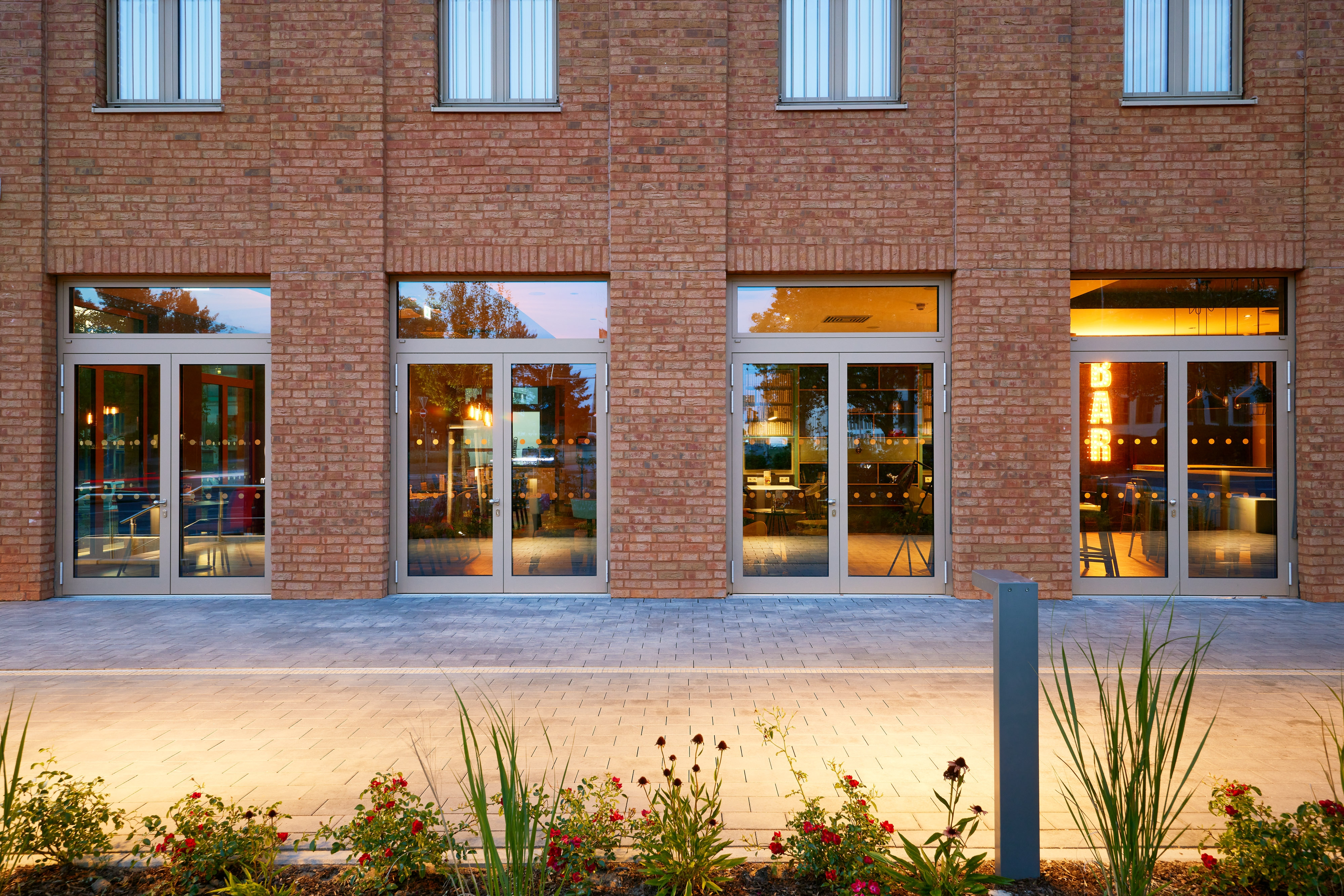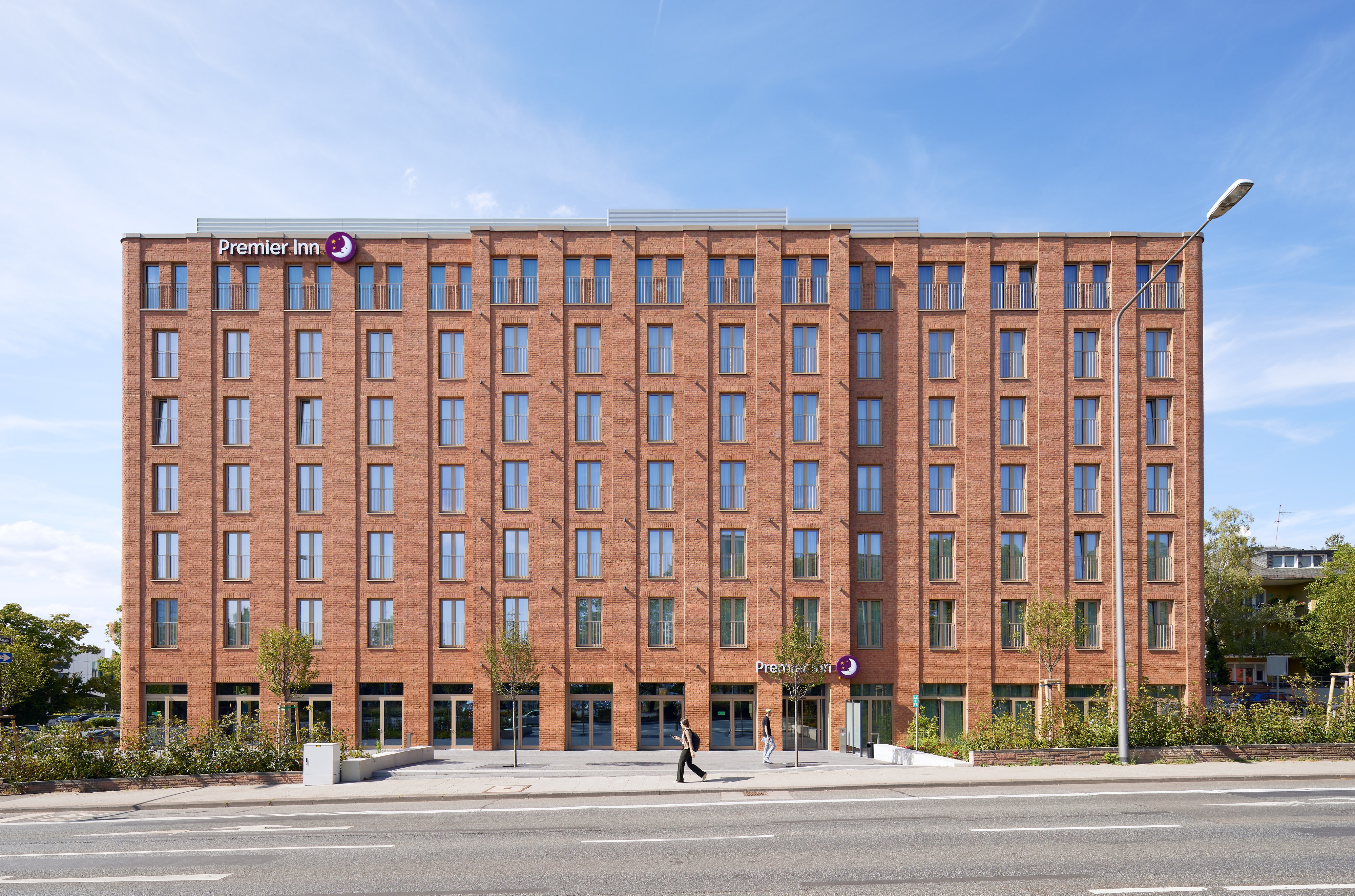 The Premier Inn Wiesbaden City Centre Hotel occupies a site at one of the most important city entrances to the state capital. By taking up the building lines along the surrounding buildings, the clear seven-storey volume strengthens the heterogeneous urban situation. A façade cladding of red clinker bricks makes the building a new landmark building in Wiesbaden.