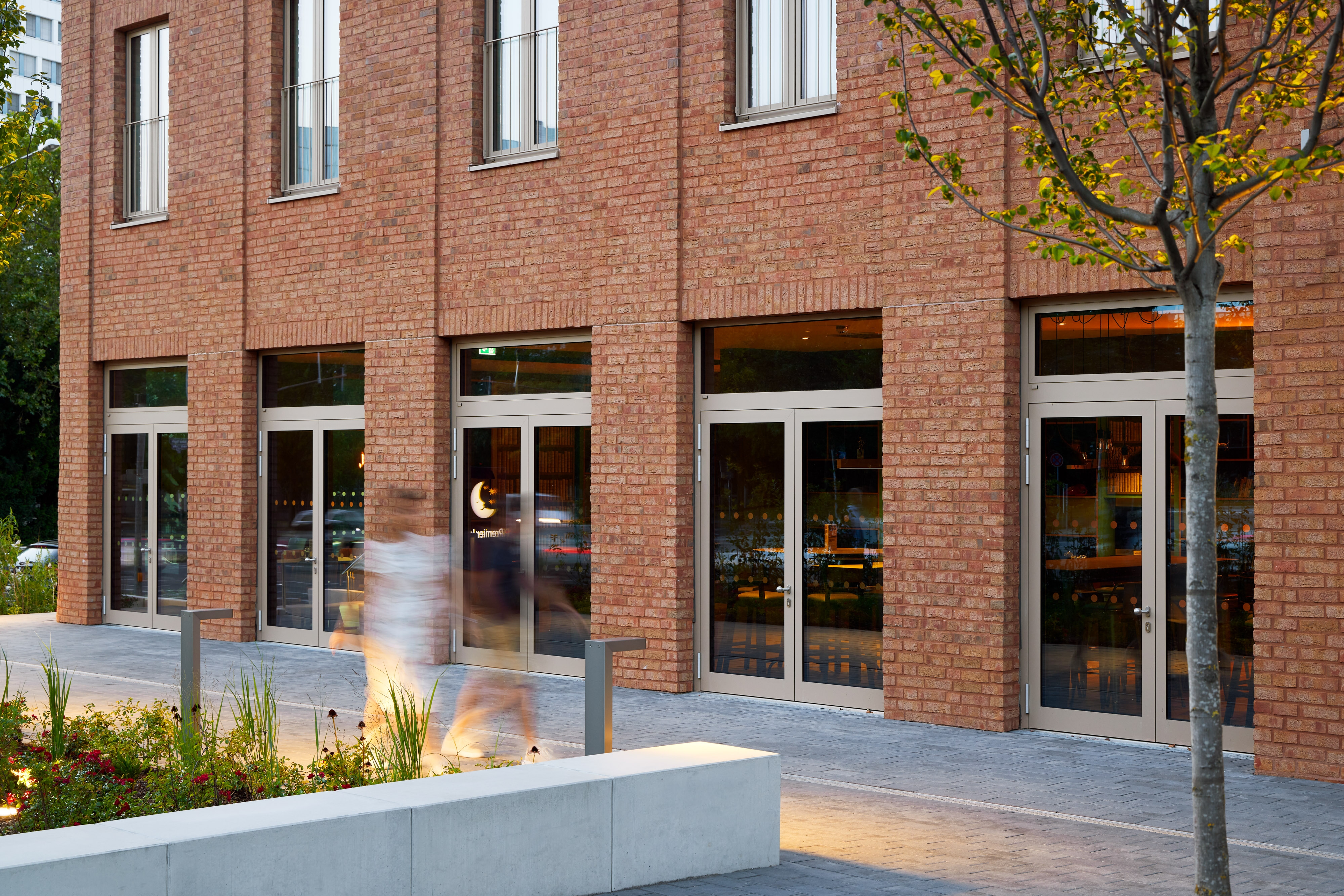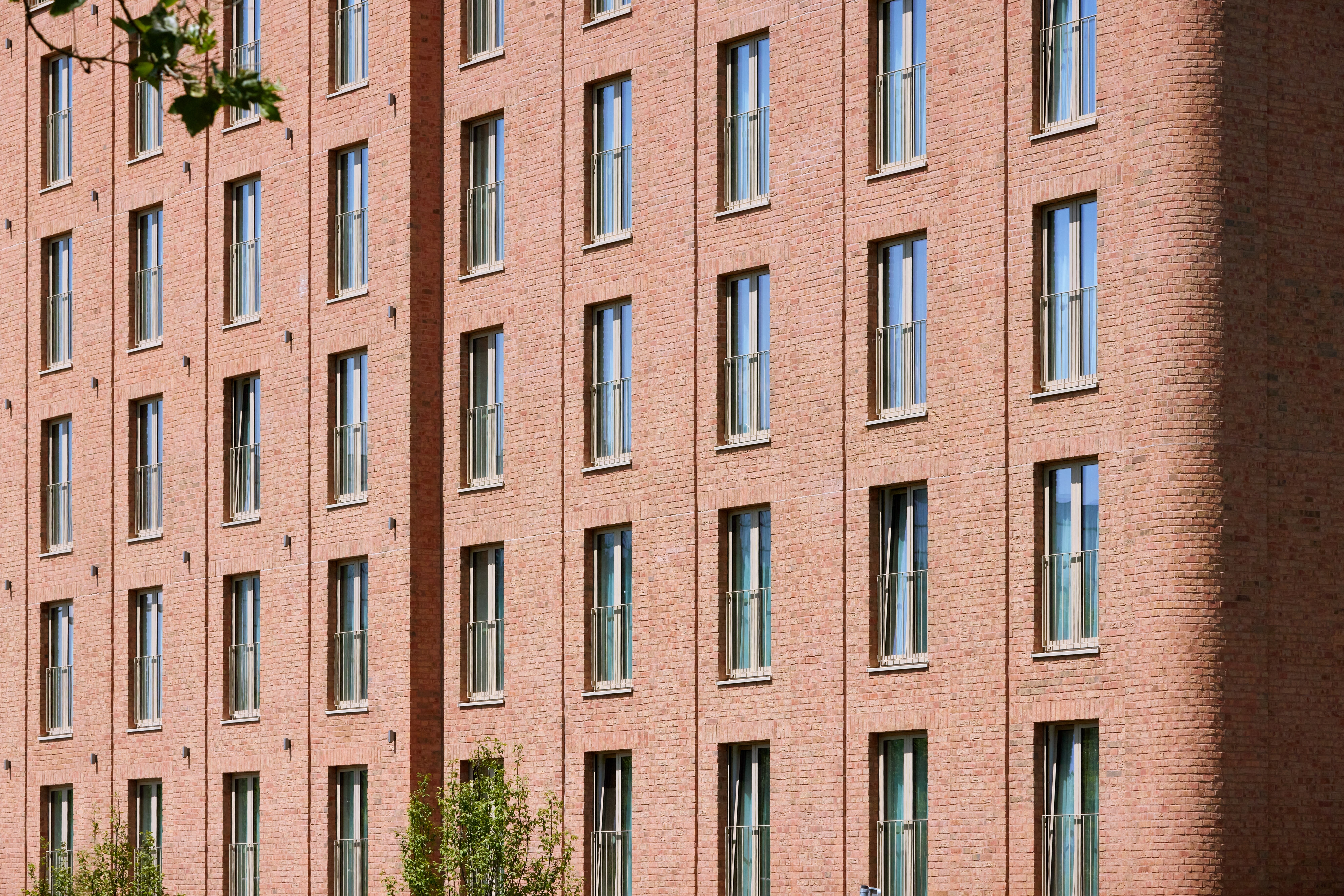 The façade of red brick slips wrapped around the building. With the regularly structure and sculpturally elaborated details, the façade forms a unique and smooth garment, profiled with proportioned projections and recesses around the double-wing windows and the rounded corners of the building. To emphasise the base and the top, the window openings there are larger designed than on the regular floors.
