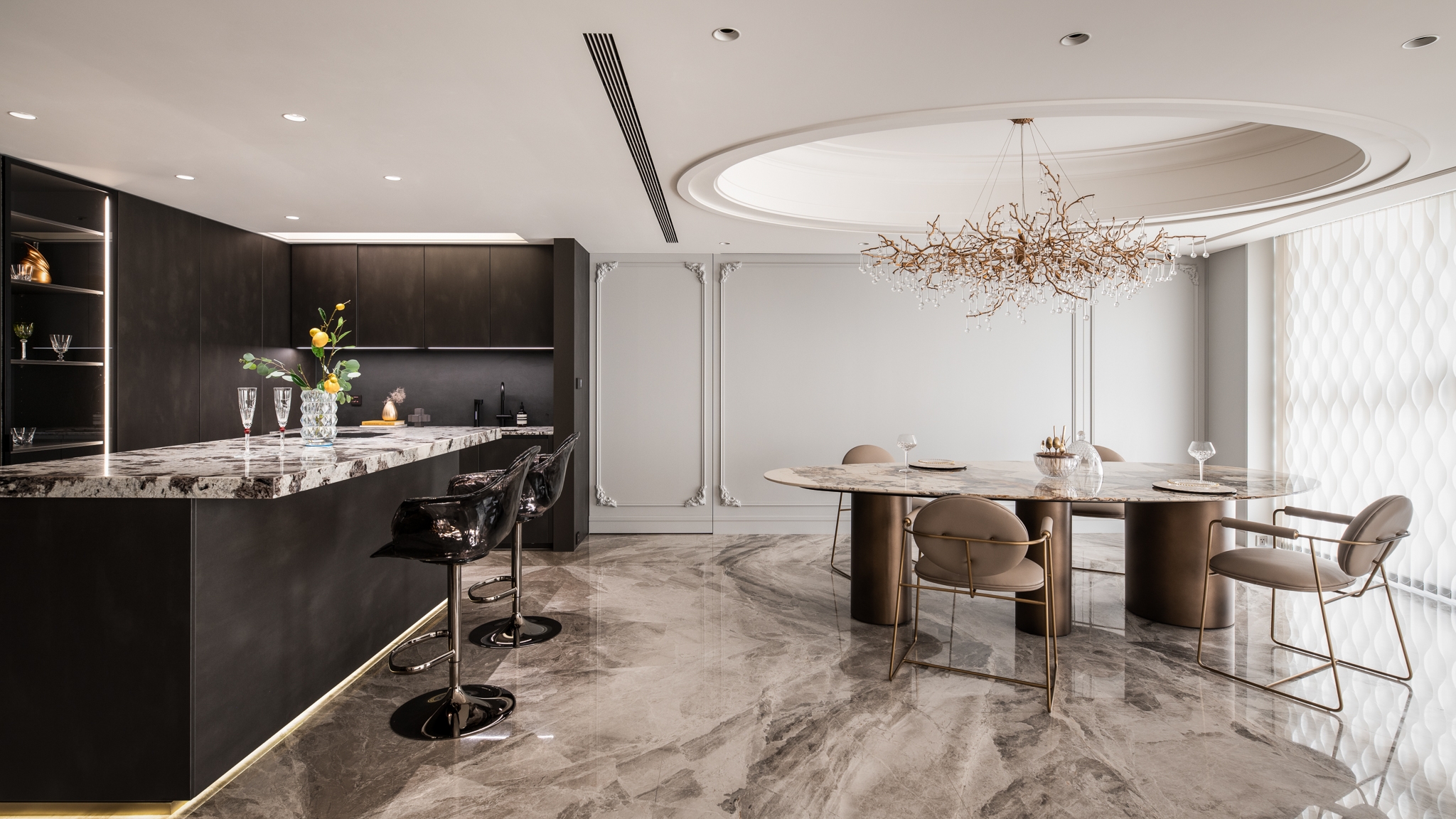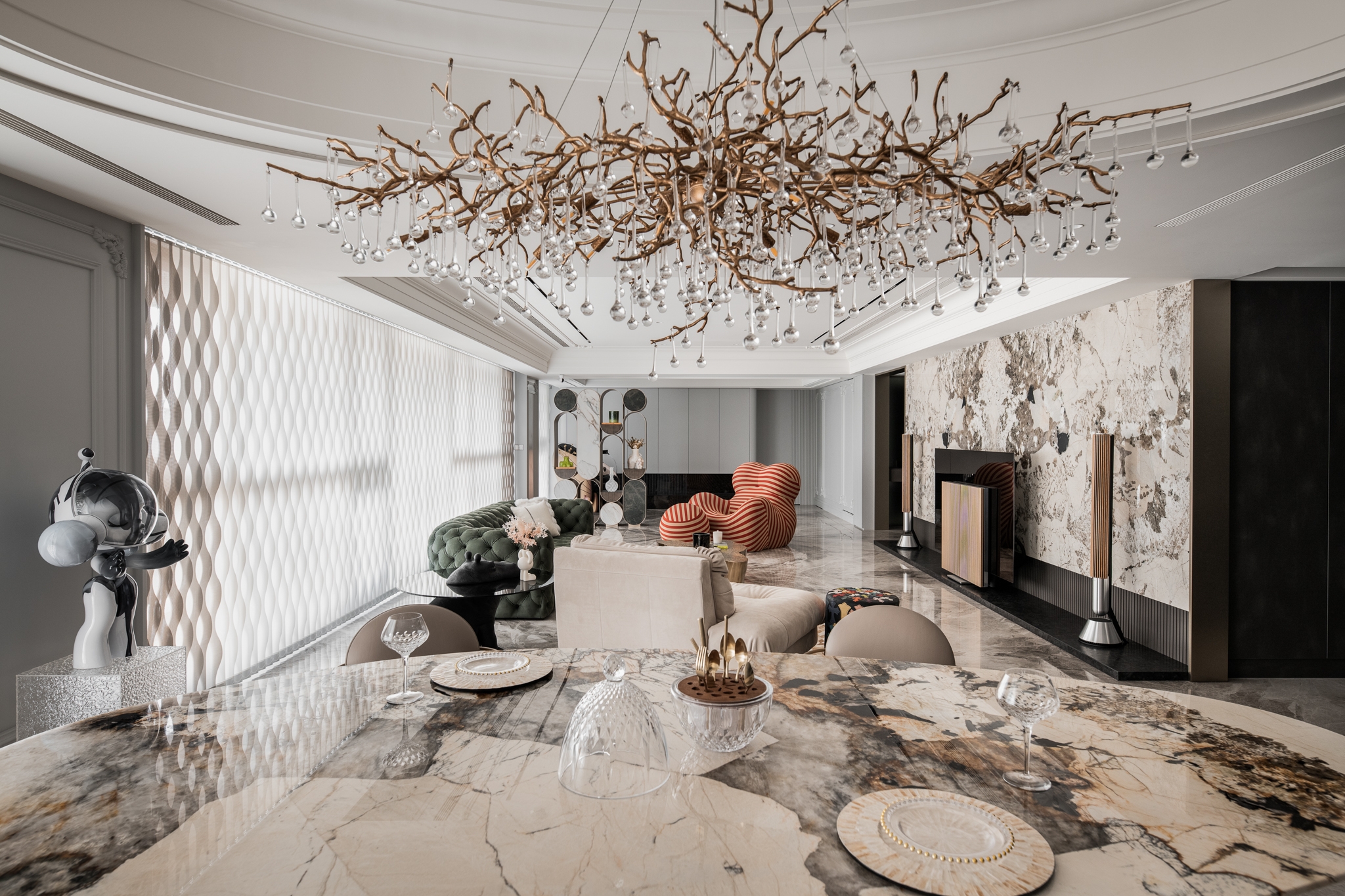 The dining table is selected from Italian Baxter thin marble table, with large yellow crystalline veins, metal cylinder legs and craft pendant lamps to create a luxurious atmosphere.