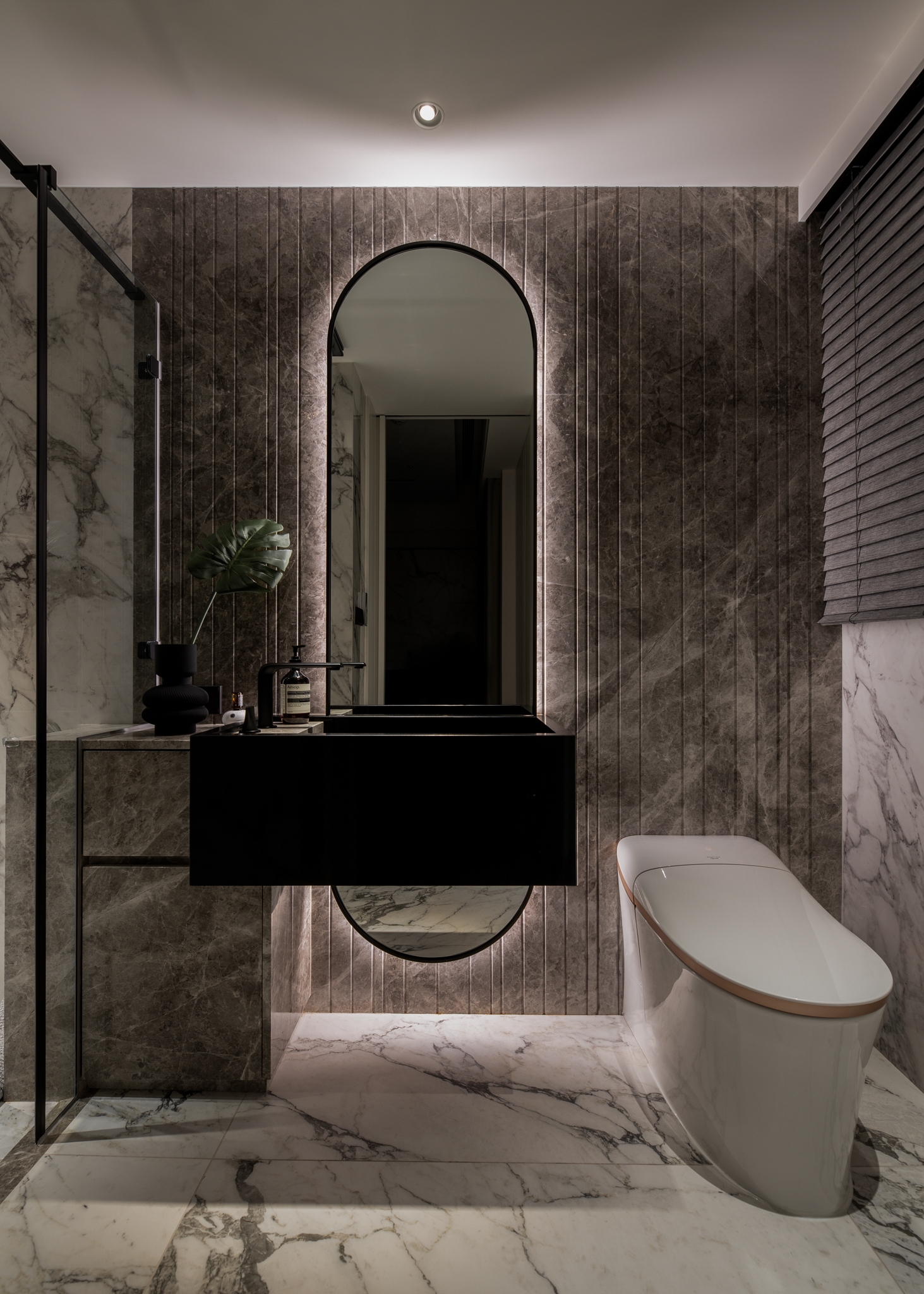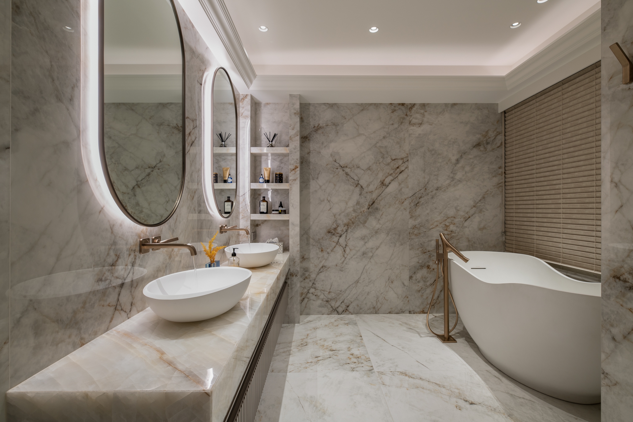 The main bathroom is made of quartz tiles imported from Spain with a rich golden color, which echoes with jade countertops and titanium-plated hardware.