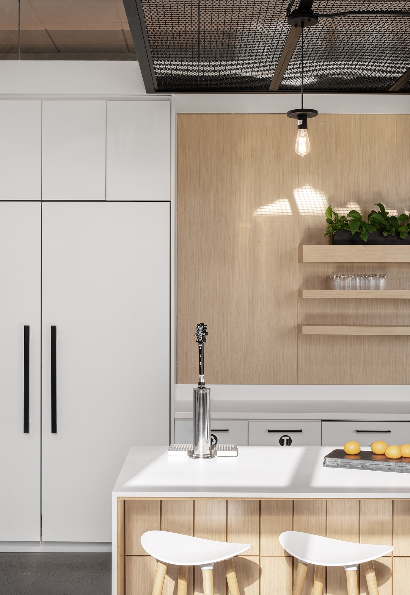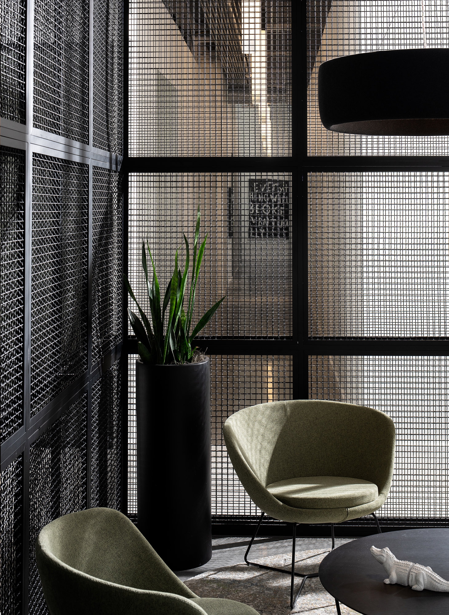 Industrial elements - metal mesh, plate steel and vintage-inspired lighting connect the interiors to the building's steel structure.