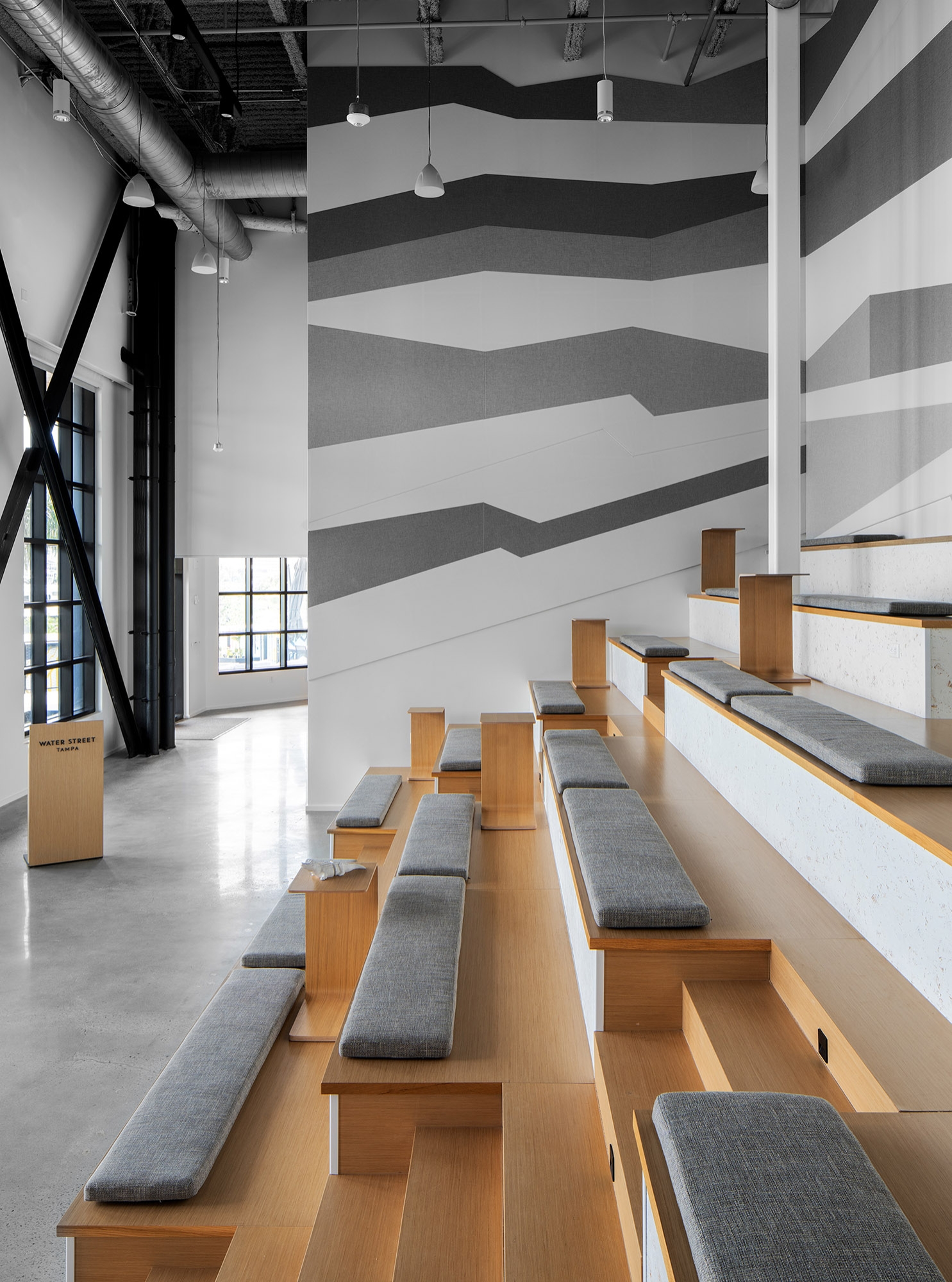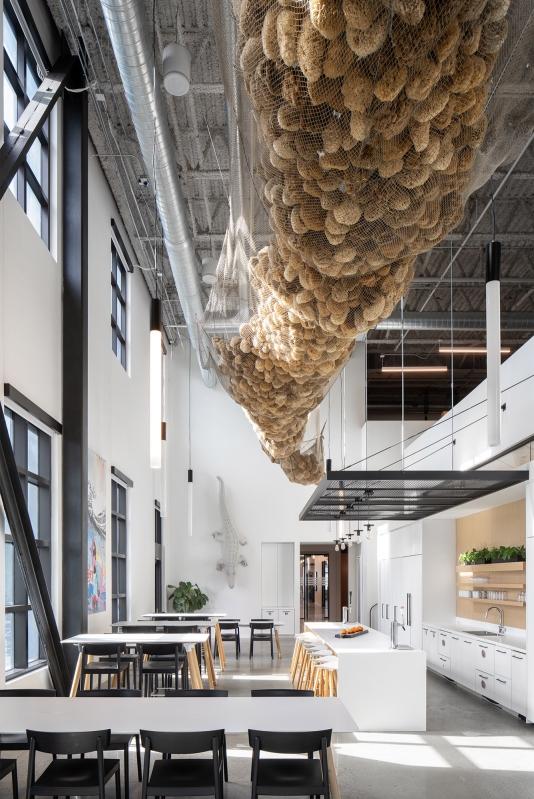 The town hall has tiered seating for meetings/community events. The cafe has a kitchen and a lounge. A suspended sculpture with sponges in reclaimed fishing nets weaves its way through the space.