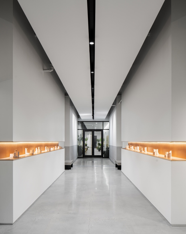The reception gallery is a long, narrow entry. Two-toned brick walls and polished concrete floors with wood niches display models.