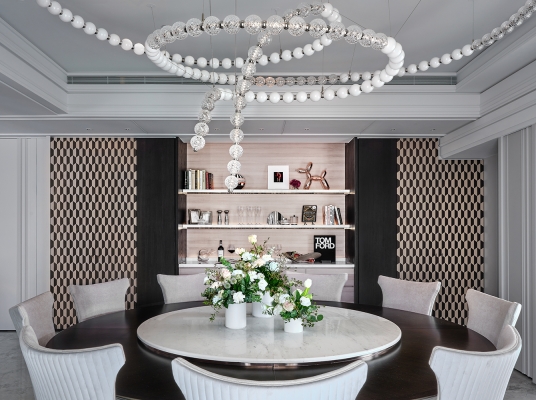 Marrying her luxury hospitality mastery, the designer infuses The Luxury Residential Escape with refined aesthetics. The living room is a symphony of a home theater, chess table, whimsical furnishings, and curated art. The dining room blends pink lacewood cabinets, intricate glass pendants, and geometric patterns for a lavish atmosphere. This artistic symposium, merging with the homeowners' essence, transcends living standards.