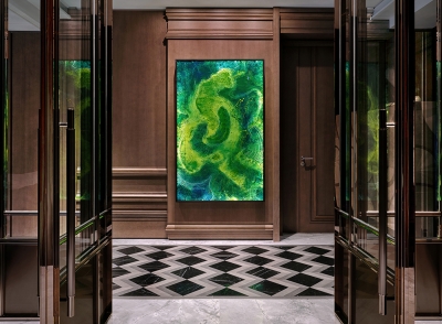 The entrance unveils an expansive, art-adorned foyer, anchored by a striking French bronze door. This interactive art installation beckons, mirroring the awe of the hotel arrival. It's a deliberate effort to recreate that initial 'wow' experienced.