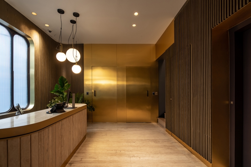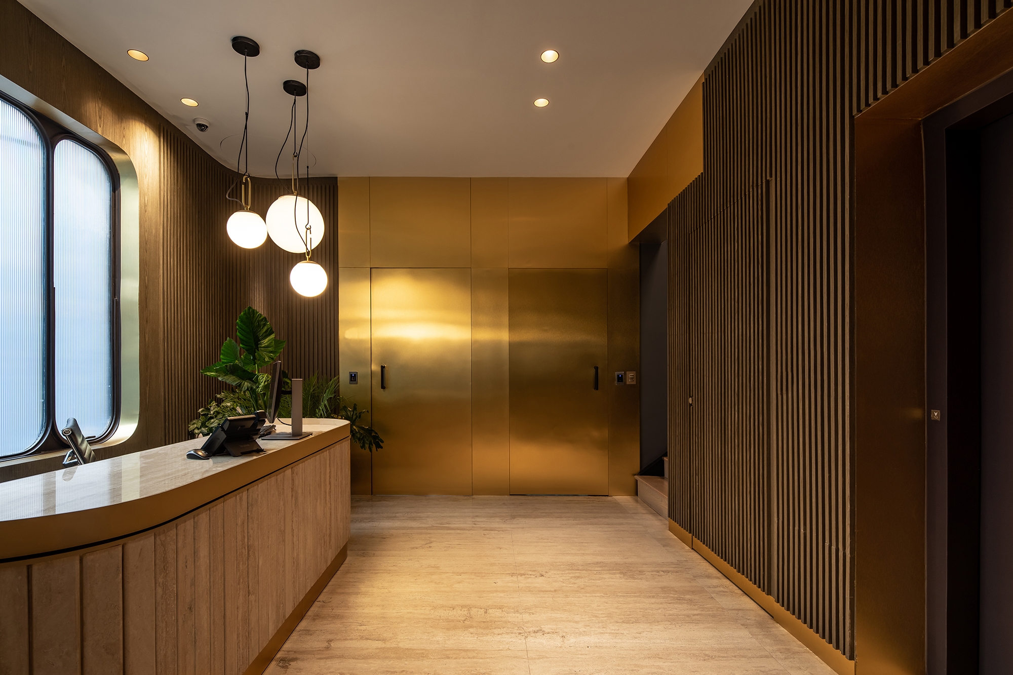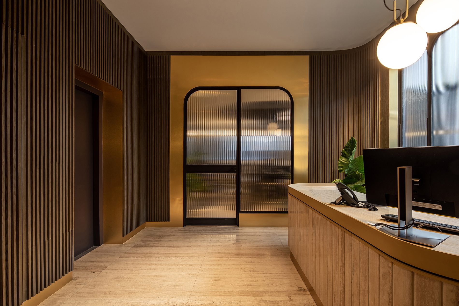 The lobby full of a retro vibe, is the preamble for this space of contrasts. Metallic walls in a golden tone complement the scene, where a striped travertine marble desk, is framed by plants and crowned by three spheric lamps, that make us travel to the past, without losing our awareness for the present.