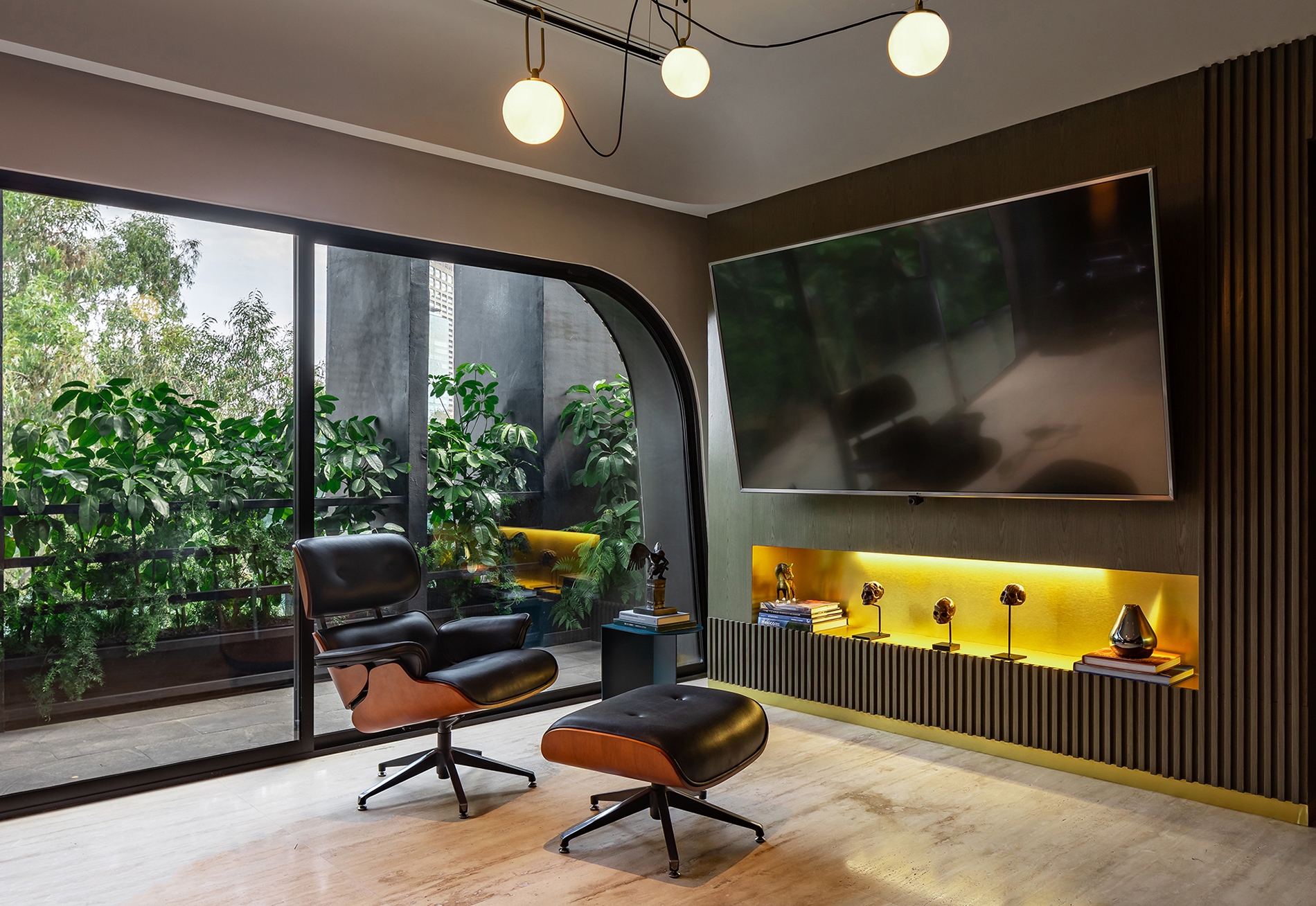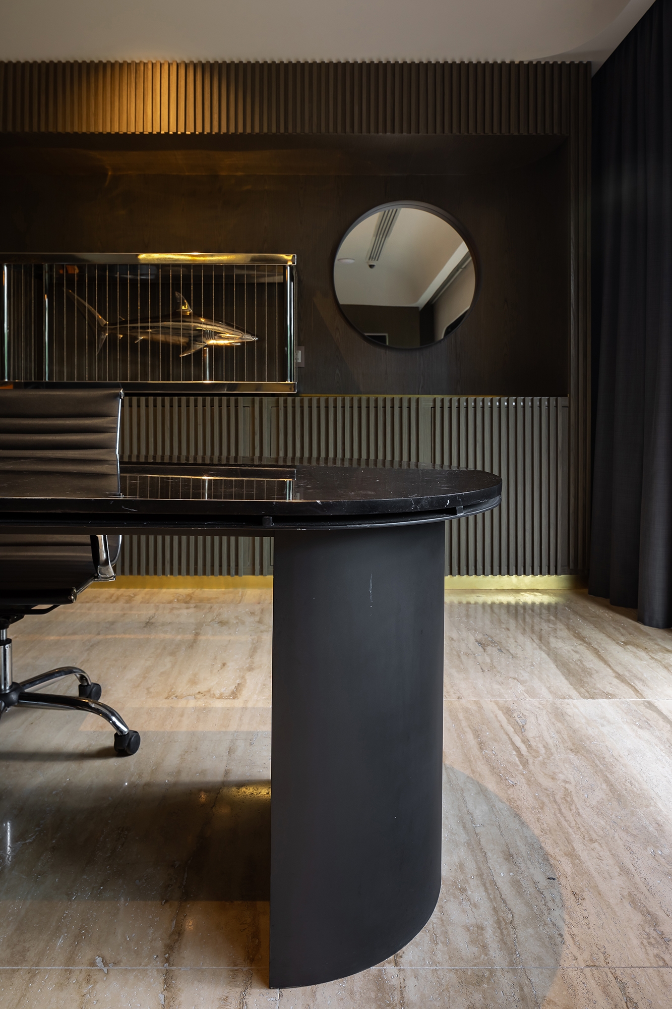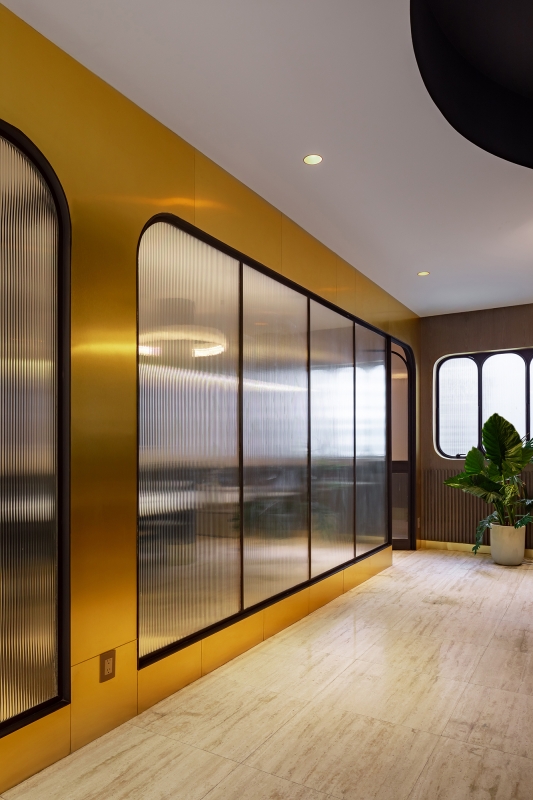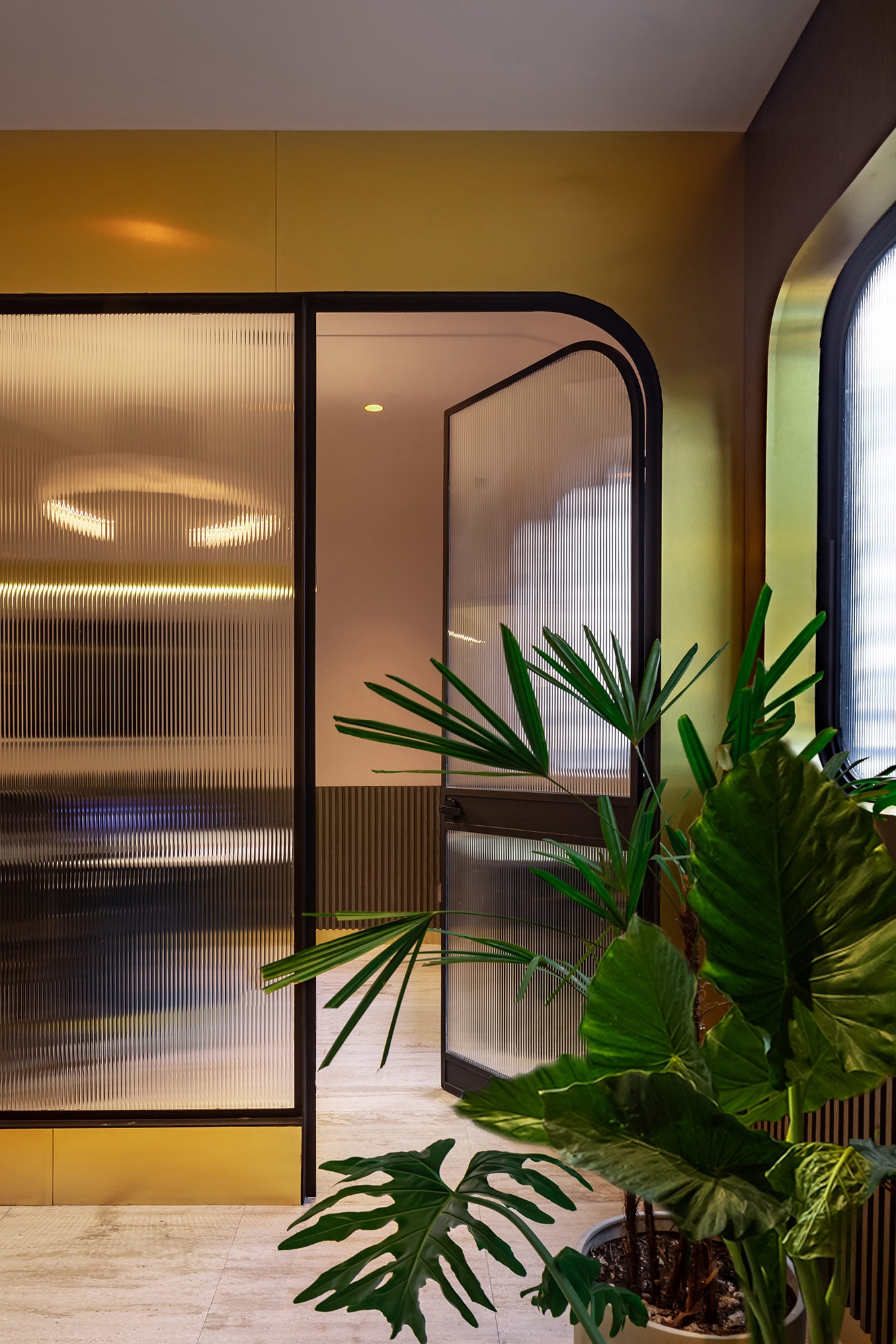 The lobby full of a retro vibe, is the preamble for this space of contrasts. Metallic walls in a golden tone complement the scene, where a striped travertine marble desk, is framed by plants and crowned by three spheric lamps, that make us travel to the past, without losing our awareness for the present.
