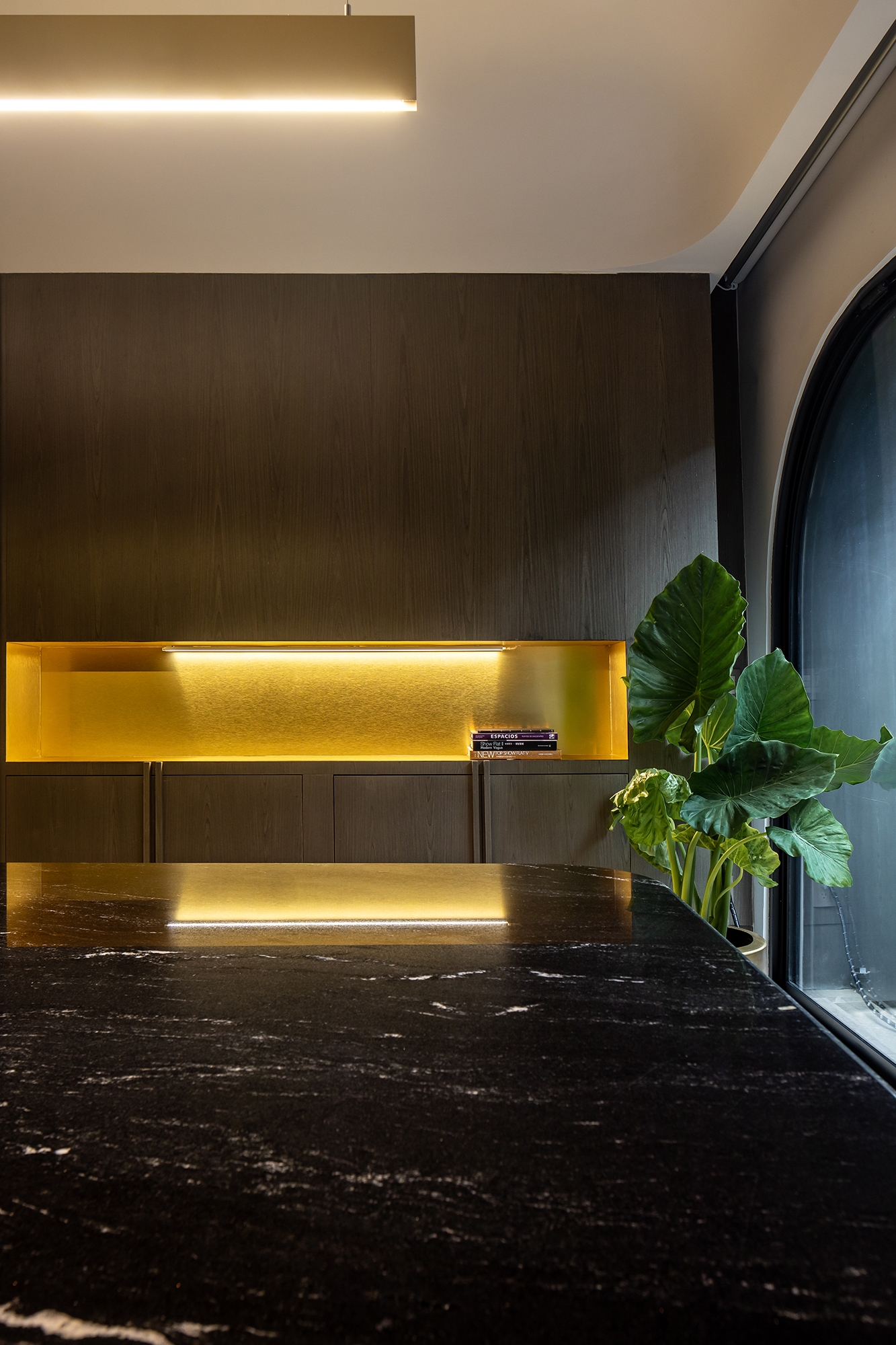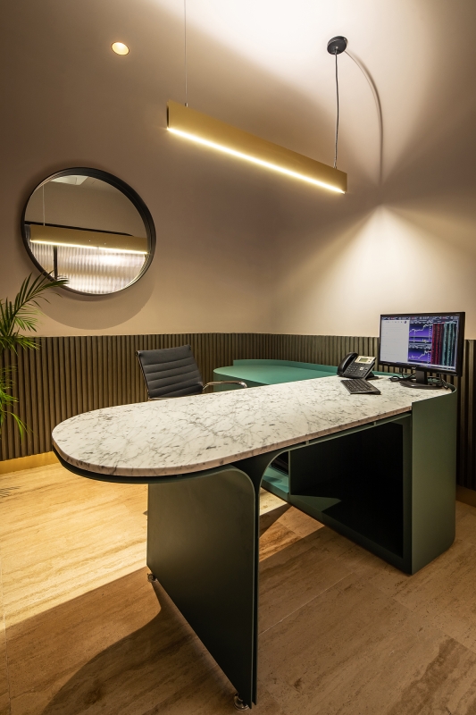 vocation of the office itself. Lightning achieves a cozy and domestic feel, ambient oriented but very punctual where it is needed, creating contrasts and shadows, because of the smart selection of materials.