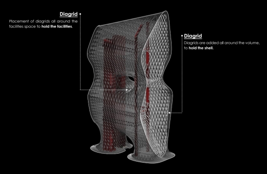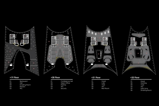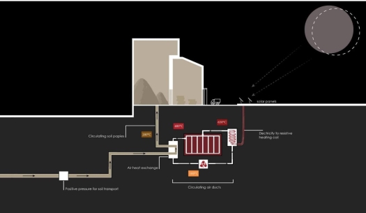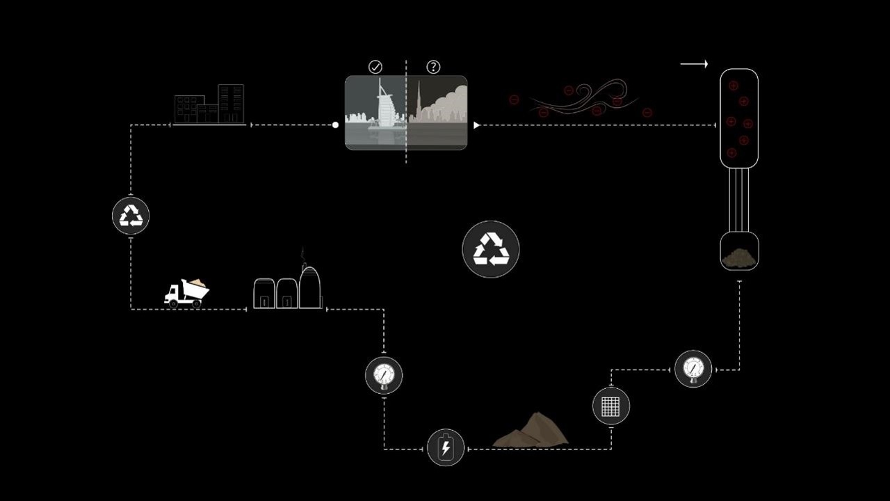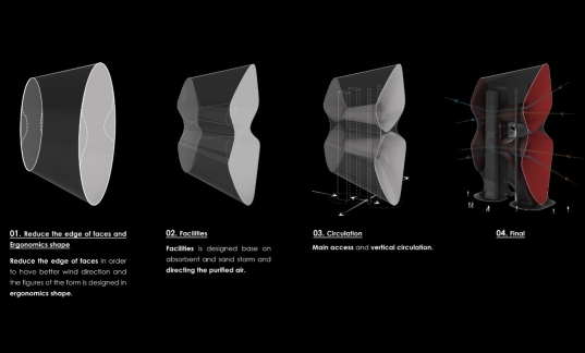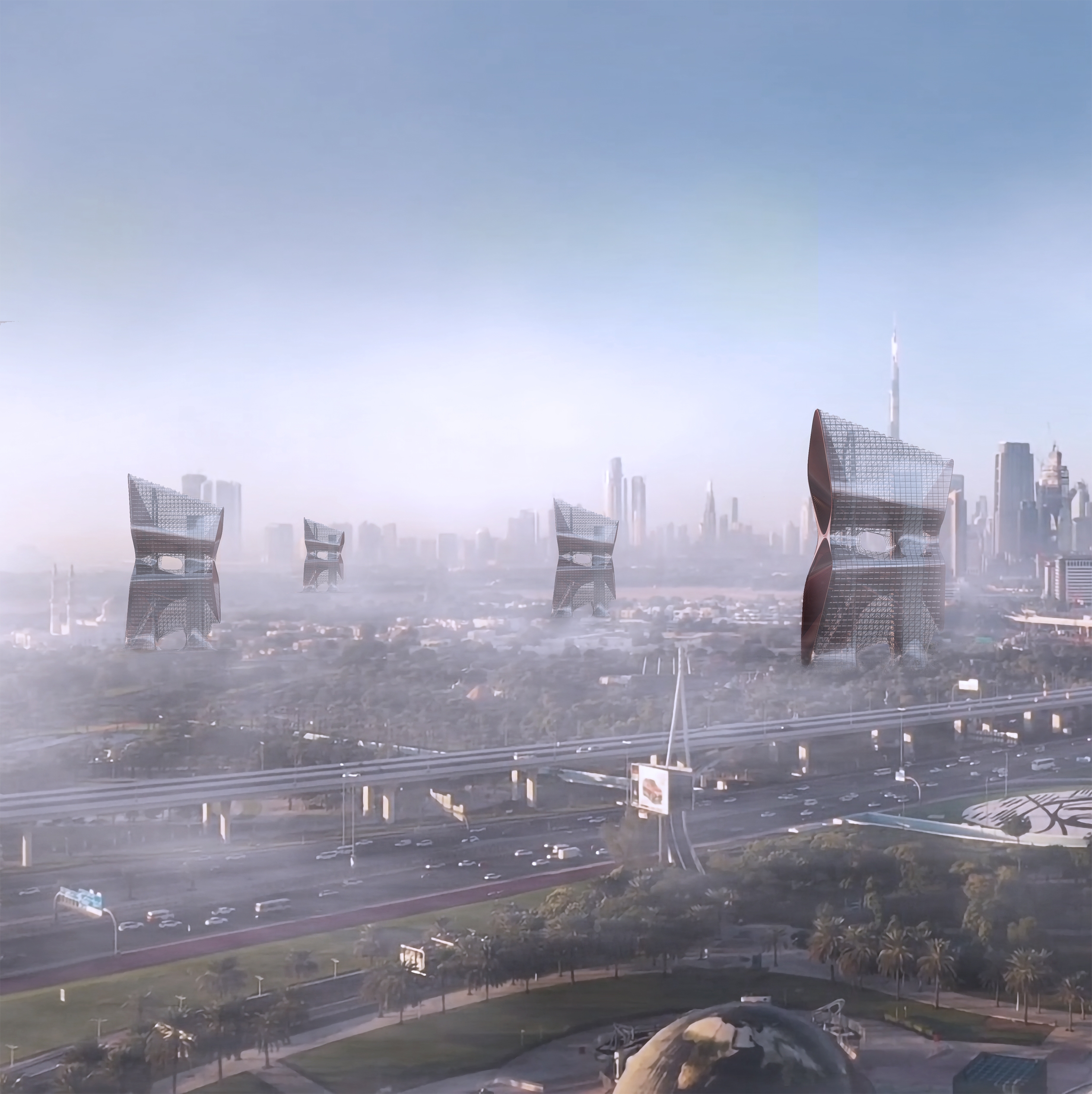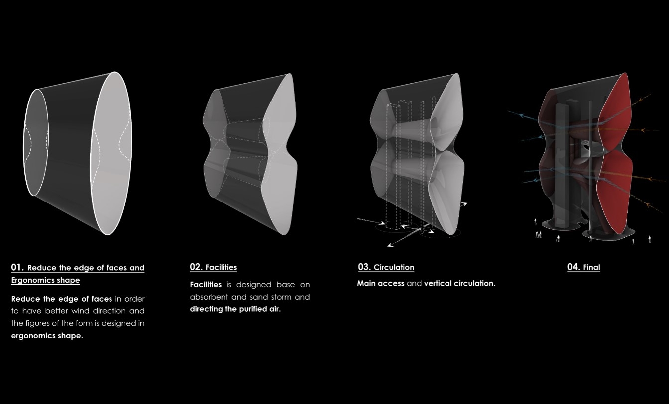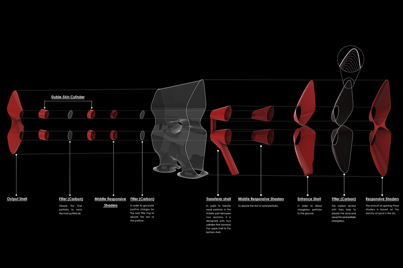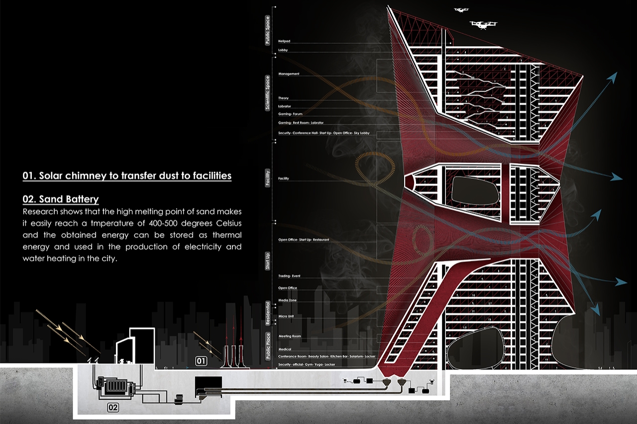 These 25 towers, located precisely by Dubai’s main route, are made of glass structure that rises from the ground and covers the facilities that form the central part of the skyscraper. Inspired by its function, the towers have two functionally accurate cavities to absorb soil particles in artificial magnetic fields accompanied by windpipes, designed to provide the shortest possible length to maintain the comfort of the residents as well as the optimal pressure and suction. The final form is in a state of balance with the highest level of safety followed by a sustainable cycle. In this cycle, the sandstorm loses its electrical charge upon entering the building's facilities, transferring to the soil purification section and then into the isolated silos made of steel and heat-transferring pipes located at the base of the towers. These heat-transferring pipes charged with solar energy from solar panels increase the collected sand’s temperature to 600 degrees Celsius, creating thermal batteries that store and provide the necessary power for the tower and neighboring buildings to function without electricity for a few months.