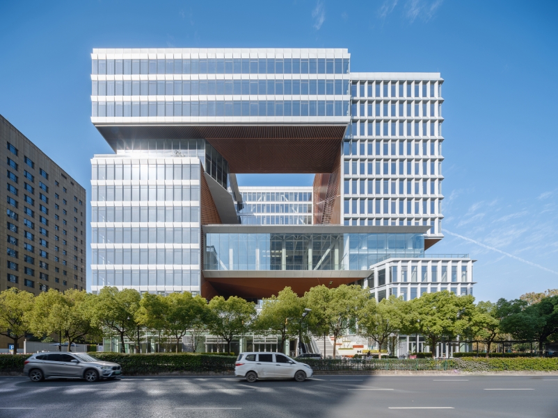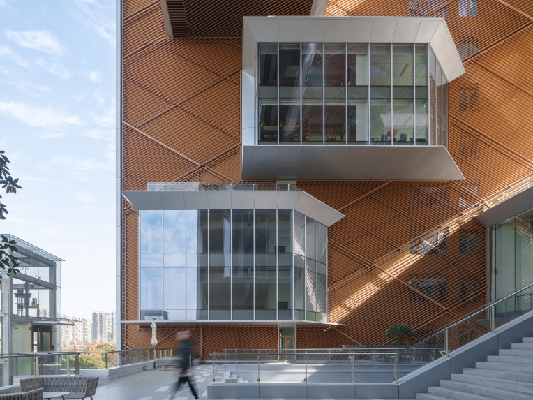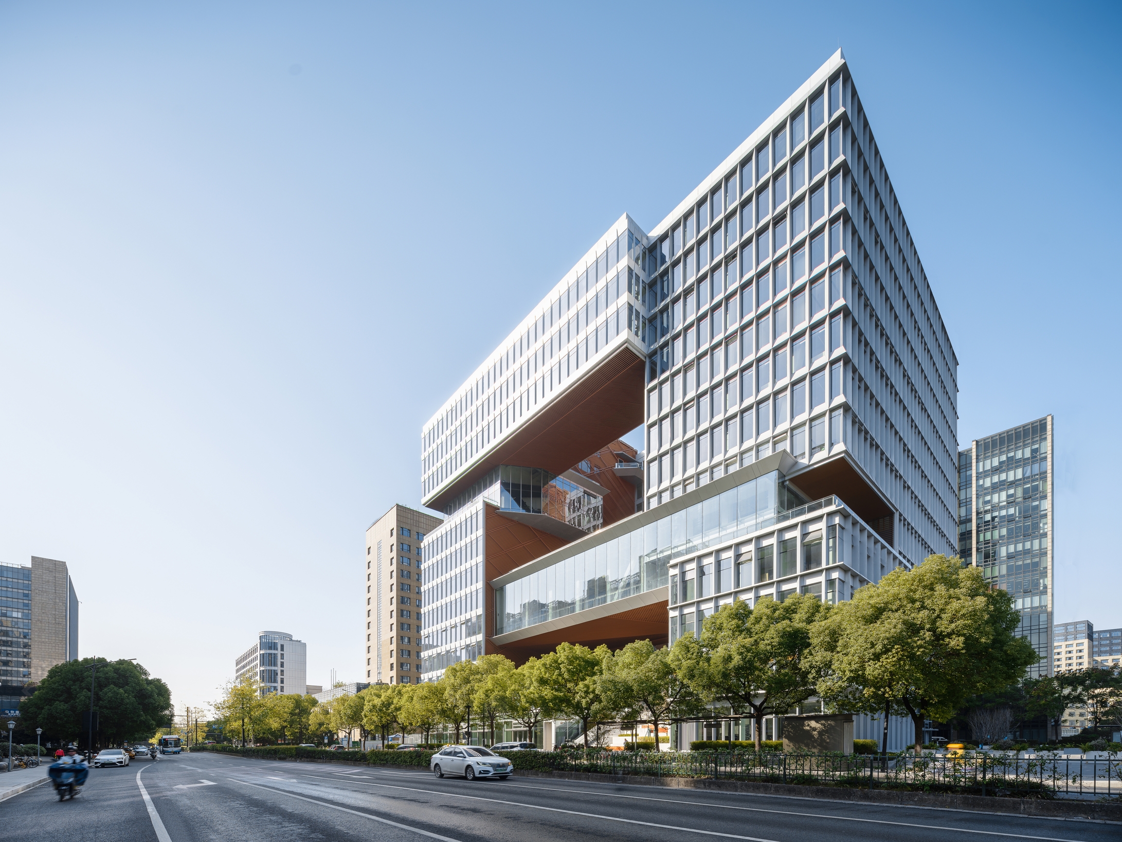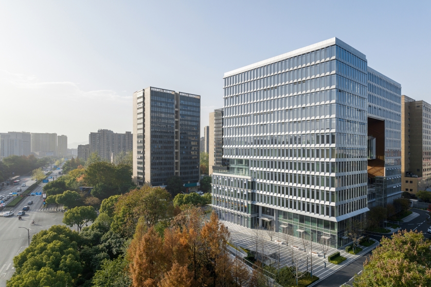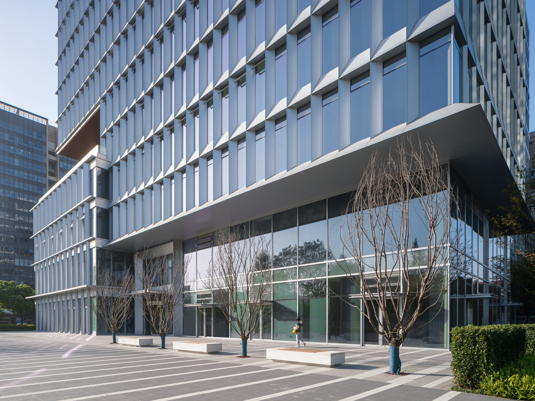 Hangzhou KAI Innovation Office Complex is situated at the gateway of neighboring Zhejiang University. It was designed as a social melting pot for office conglomerate, serving corporate headquarters, mid-size enterprises, start-ups and co-working space. Interlocking masses open up a central courtyard, allow natural light and cross ventilation for both indoor and outdoor space. A communal stairs penetrate through the courtyard and interconnect programs from L1 to L5, providing multi-dimensional event spaces, while ancillary programs are juxtaposed as boxes, enhancing connectivity for all users. Window wall system is adopted for facade design, responding to view angles and sun path for better energy performance. The vertical sun shading blade and the horizontal spandrel reverses its angle for different orientation, creates unique identities for occupants in the stacking masses. This landmark has become a 24/7 social place for entrepreneurs, university students and communities, and redefines new office typology in Asia.