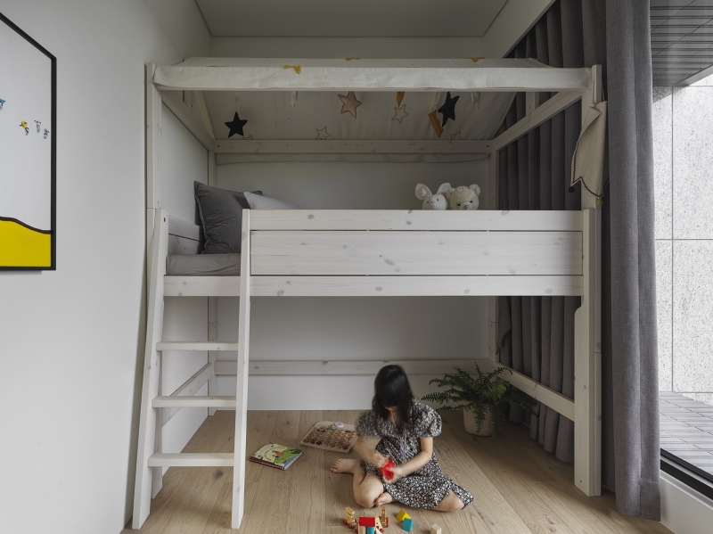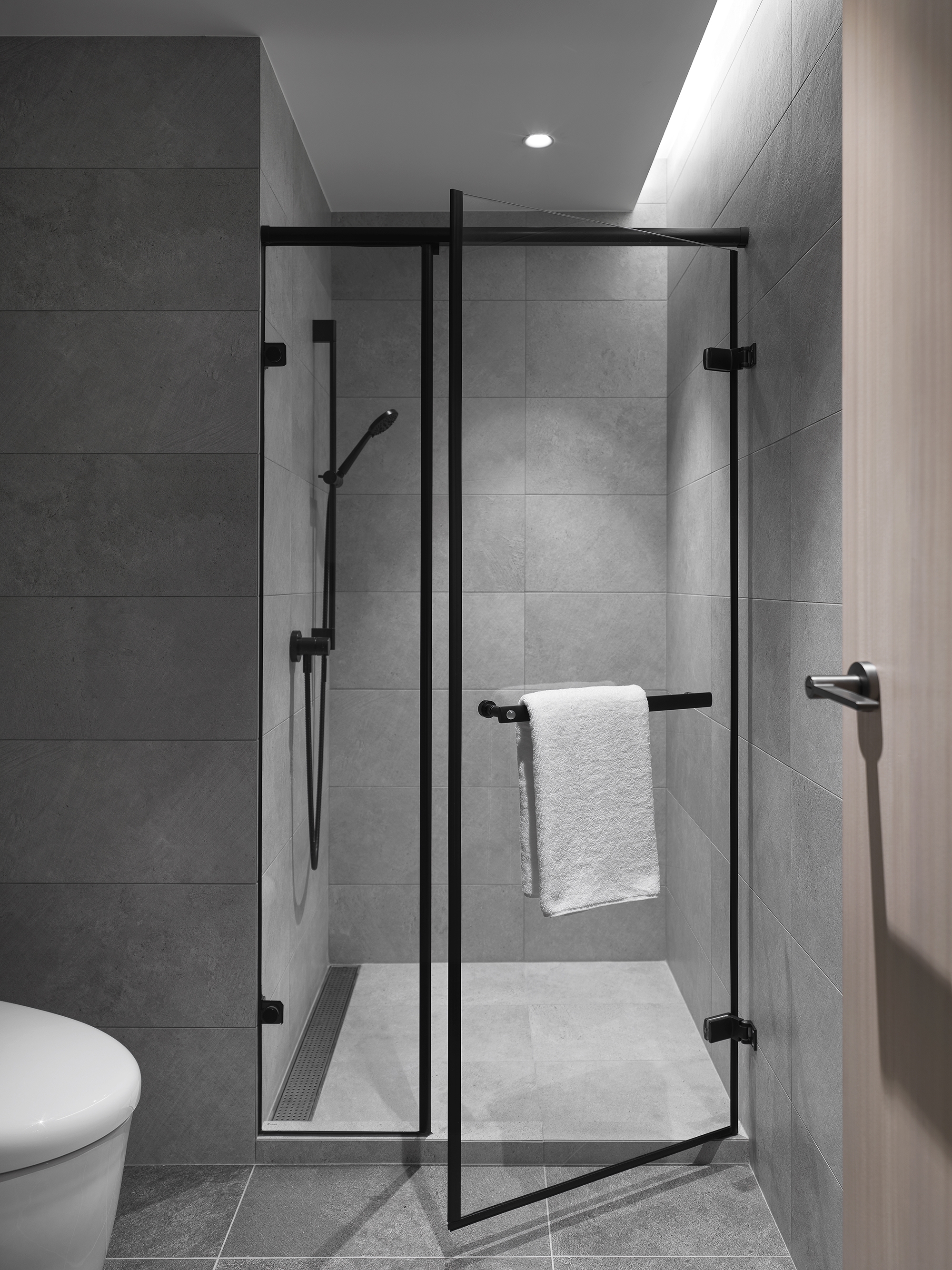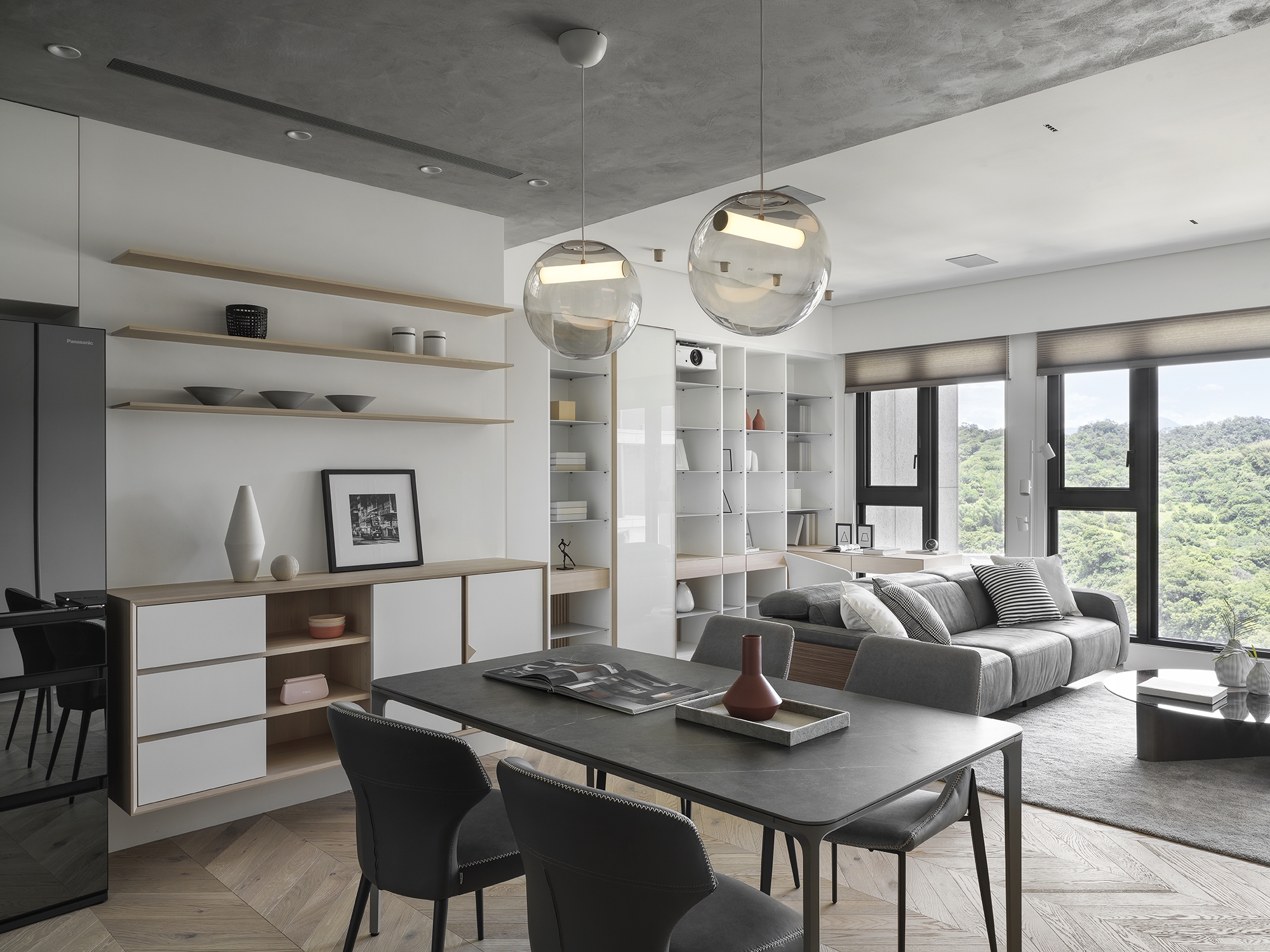 Upon entering the residence, one will immediately notice the strategic relocation of the guest bathroom, which has allowed for a more expansive common area. The entrance, dining room, living room, and study have all been thoughtfully aligned on a single axis, allowing for natural light and greenery to filter through the floor-to-ceiling windows situated adjacent to the living room. This design has not only created a more spacious feel to the home, but has also brought in the beauty of nature, resulting in a warm and inviting ambiance.