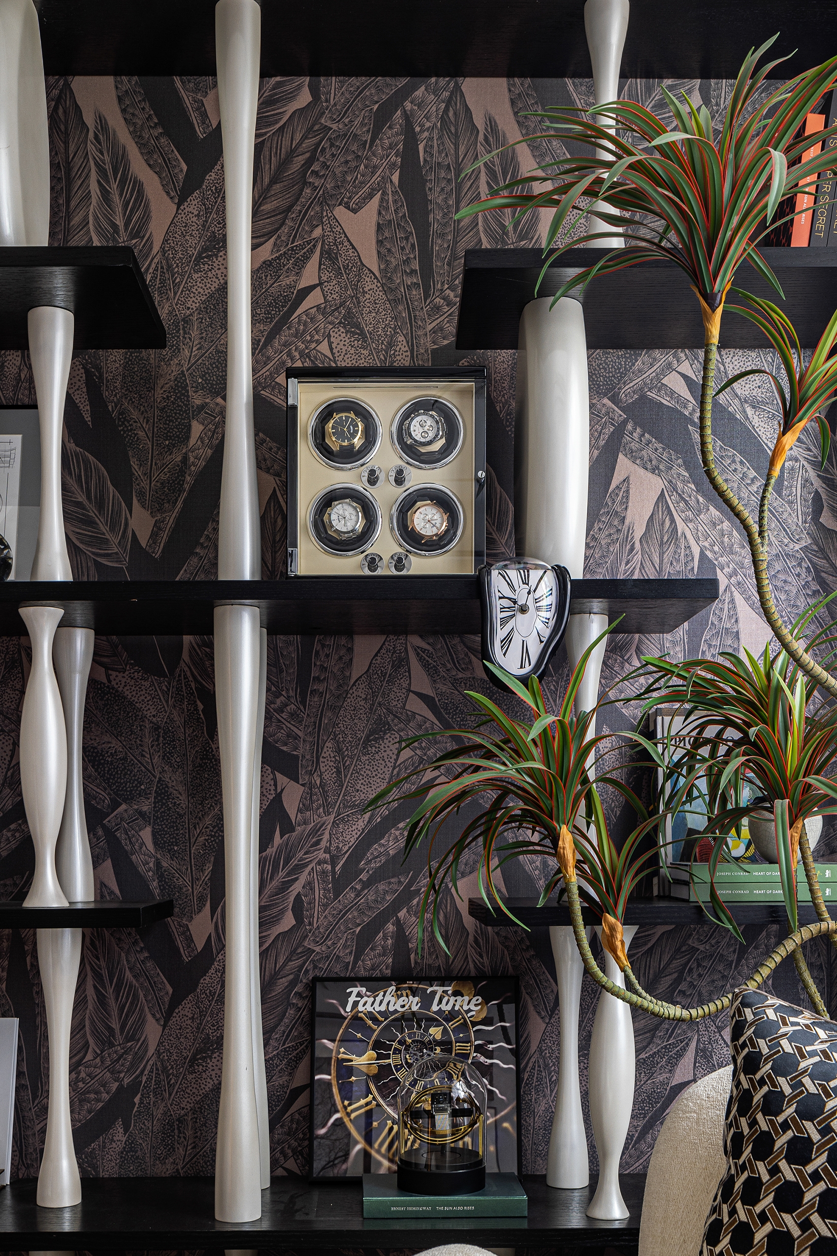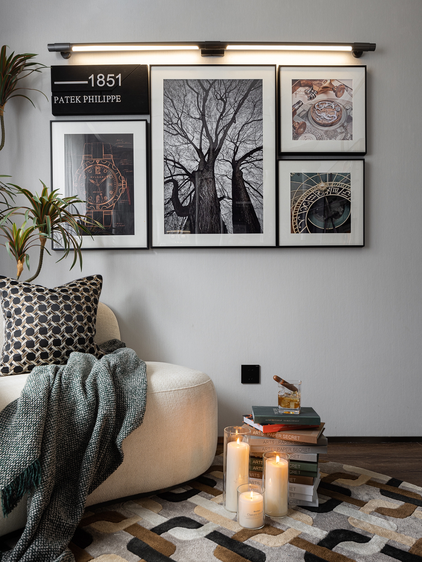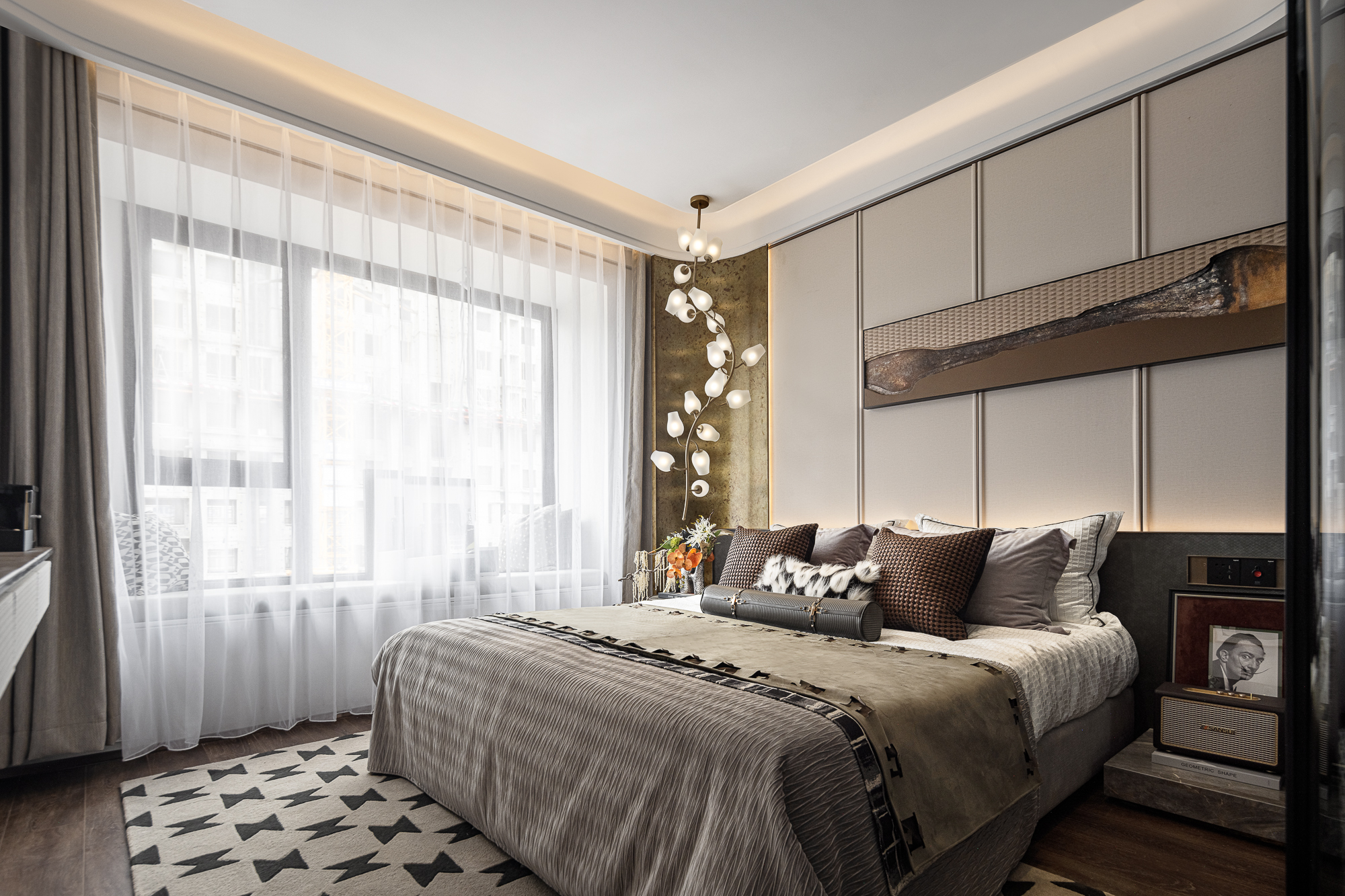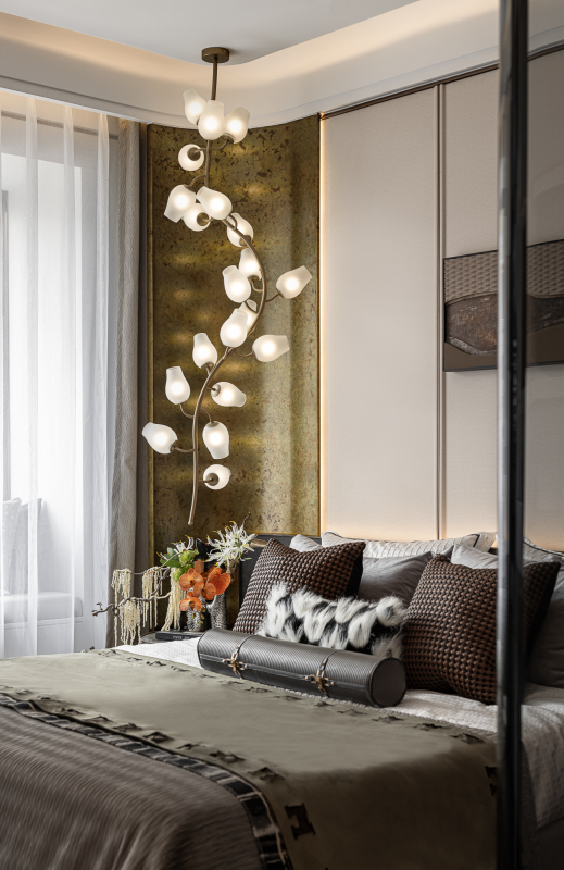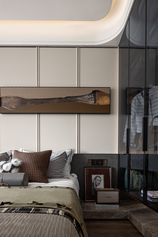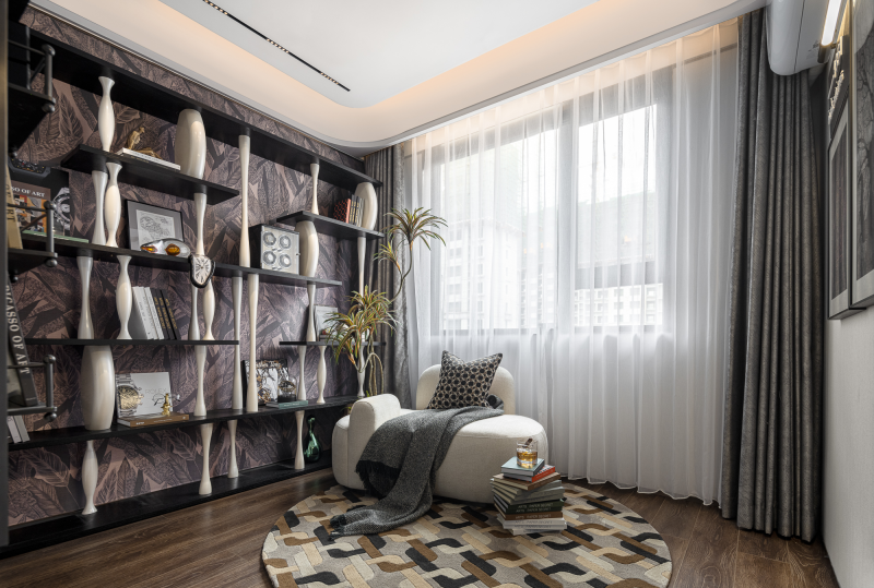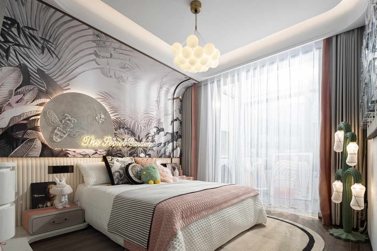 In addition, the flower-shaped lamp, the gorgeous artwork, the clean cloakroom and the bathroom all contribute to the cosy ambiance of the bedroom. The study is adorned with a paper wall that resembles a dense forest and displays a variety of collections and watches. It serves as a badge of honor, and a comforting spiritual experience. In the girl's room, a flower-paved path links the actual world to fairy tales, enhancing the romantic and fantastical elements.
