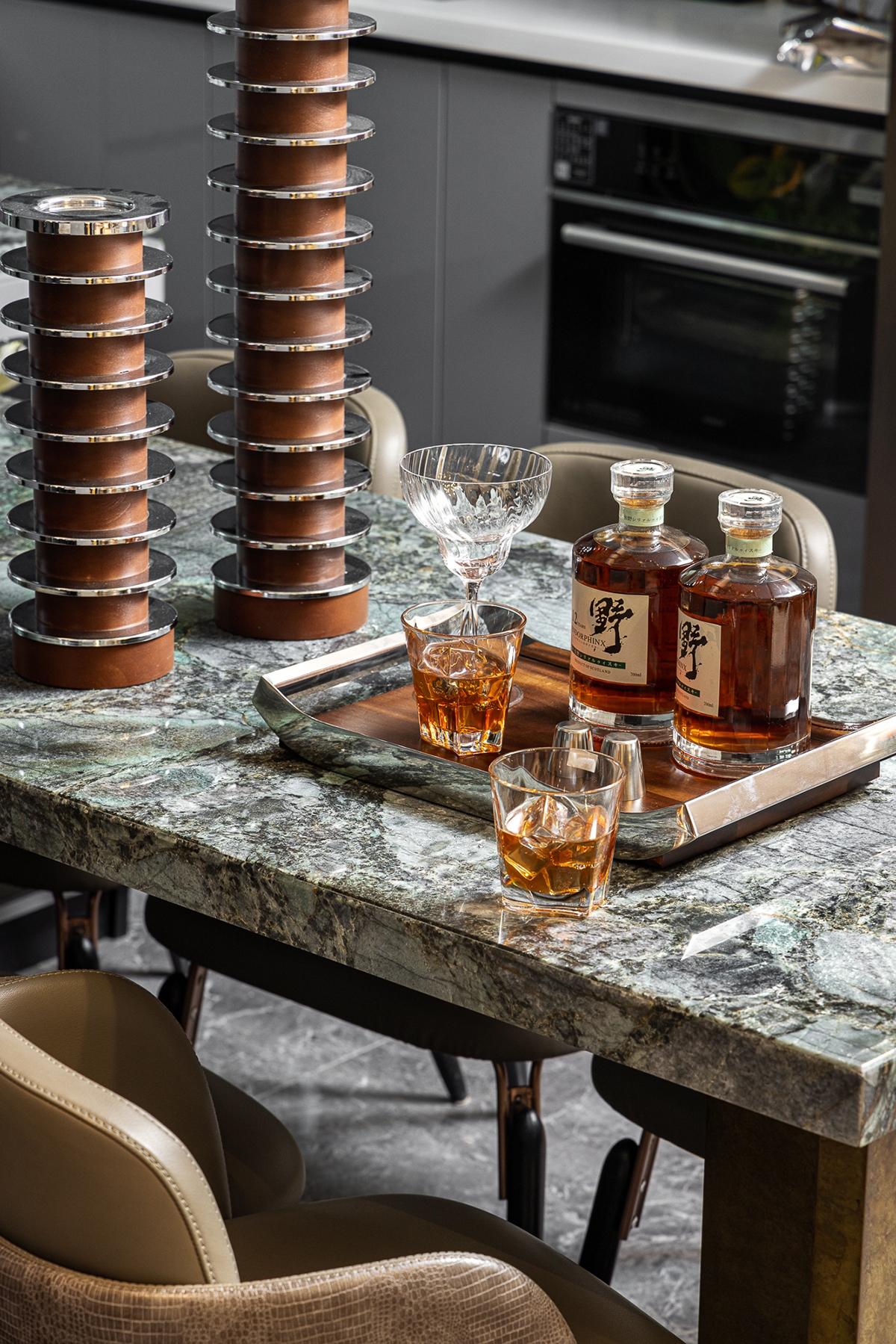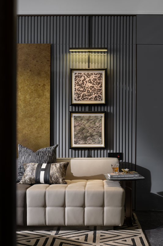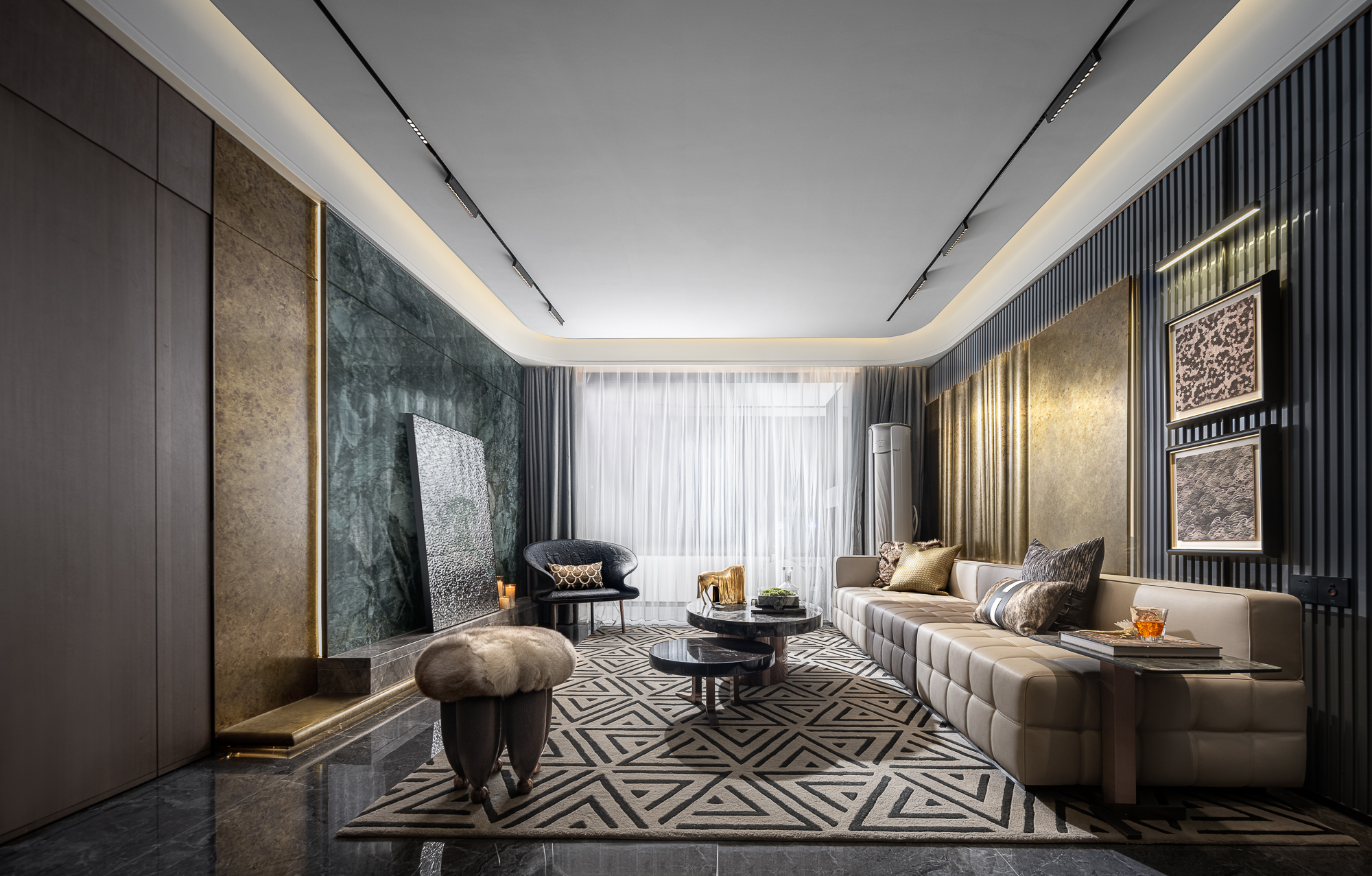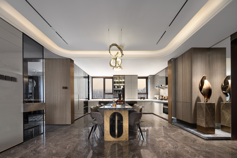 The project is located in Cangzhou, Hebei, China, with an area of 125 sq.m. The living area has a luxurious and elegant feel thanks to the carefully chosen materials, including the jade green stone, metal, wood veneer, and Holly Hunt brand textile. Besides, the spacious structure makes the environment open. Cabinets and transparent glass windows are cleverly combined to achieve perfect storage for daily use.