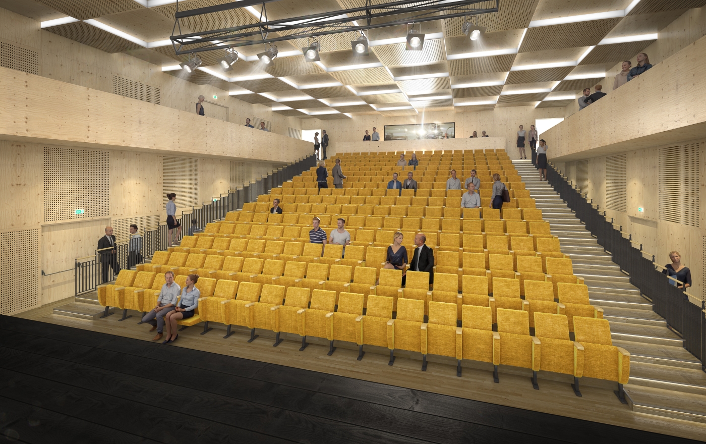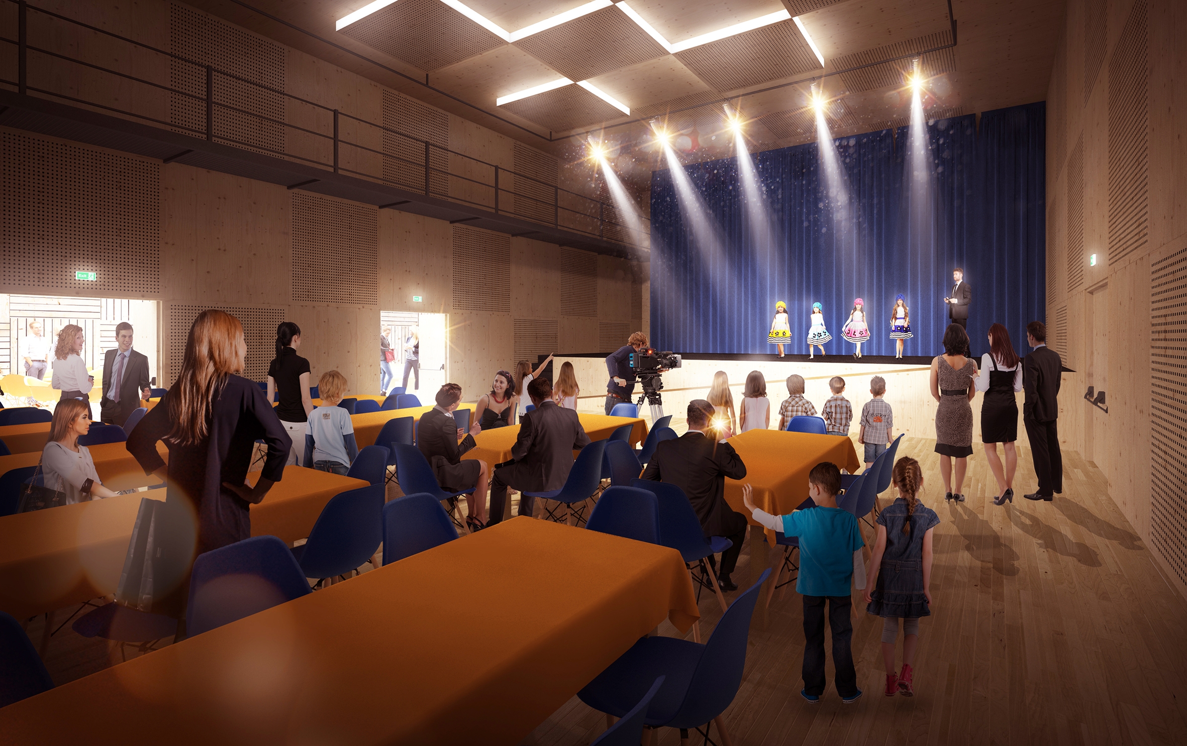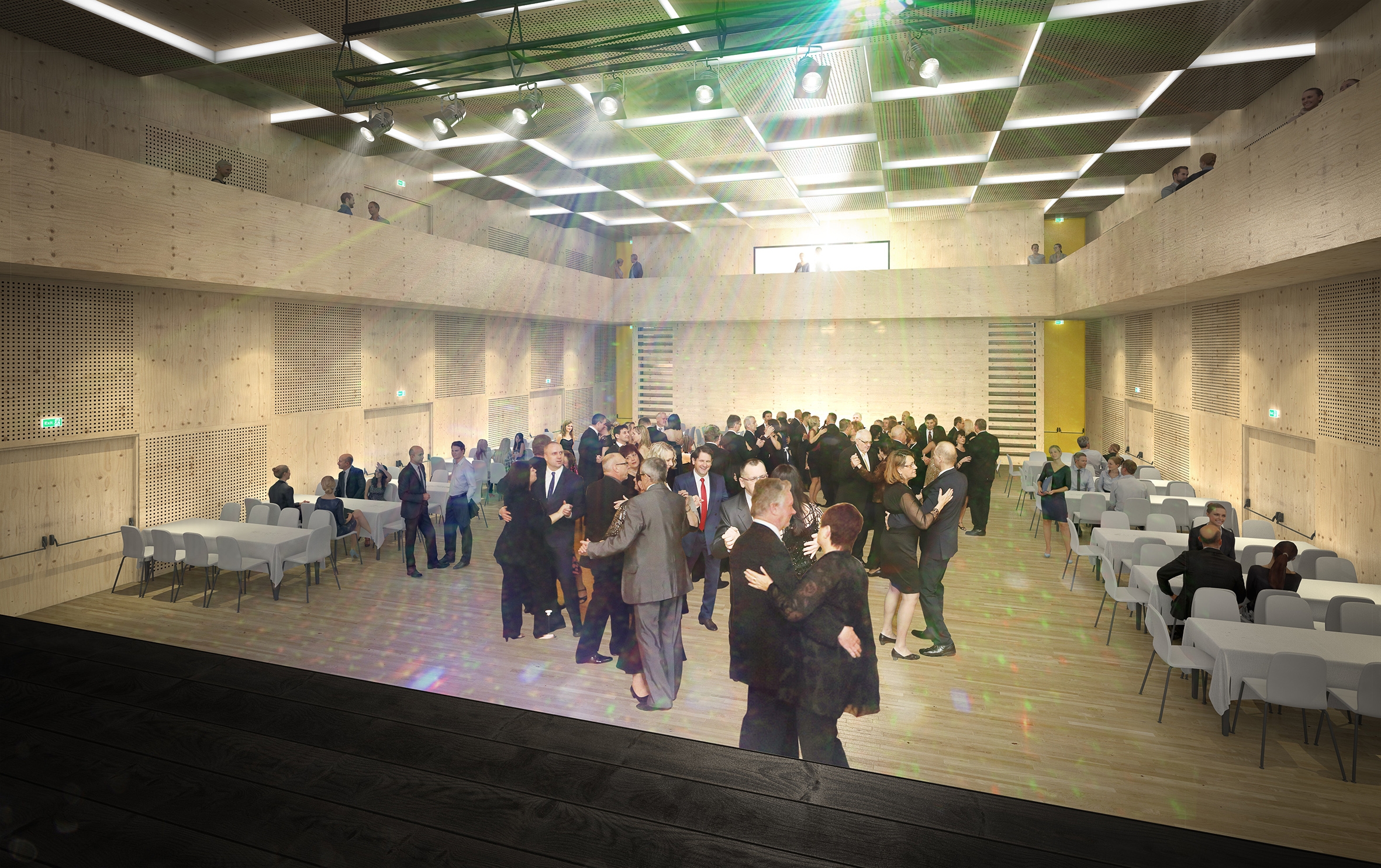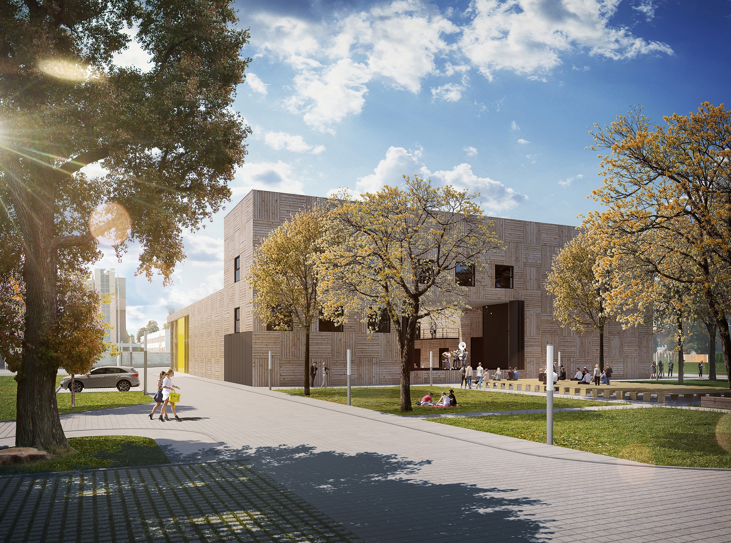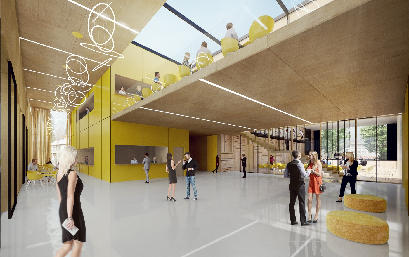 Town in the foothills. Continuation of the local tradition of timber-framed buildings for which the town of Rožnov is famous. Inspiration from the architecture of the foothills of Switzerland or Finland, where wooden structures for public buildings are an example of ecological construction. Creating a landmark by simple and modest means. The composition of the building mass and facades is based on functional units and is conceived in a strict modular four-metre outlineTwo halls in the central wing and an outdoor atrium in the centre, offering space for cultural life. The atrium as a third hall with an outdoor stage that can be opened into the park behind the community centre. The uniqueness of the building lies in the designed structure, which consists of solid timber frames (BSH) and solid timber panels (CLT). The wooden elements and surfaces are visual in the interior. The timber building was designed to be optimal also in terms of achieving a passive energy standard for the building. The prefabricated timber structure is quick to construct and renewable, which is in accoradance with the principles of environmental sustainability. It will be the first public wooden building in CZ