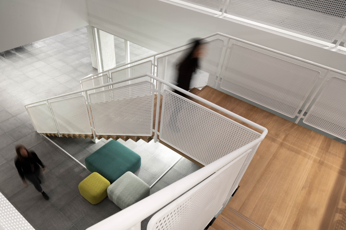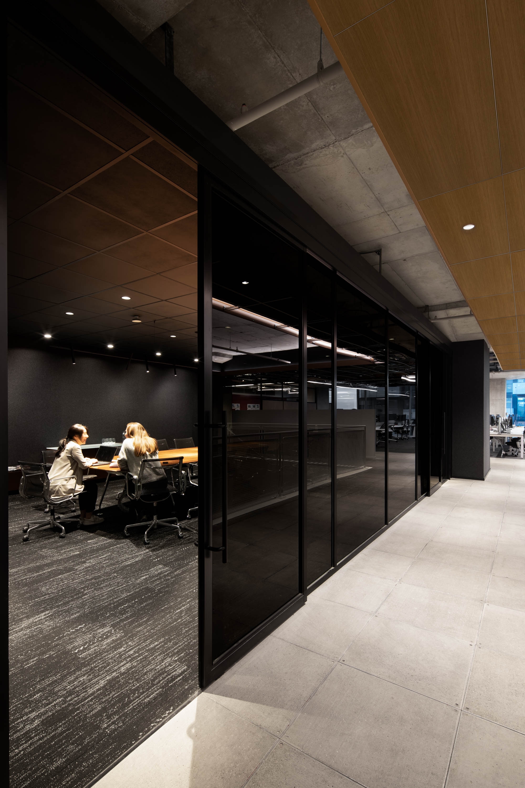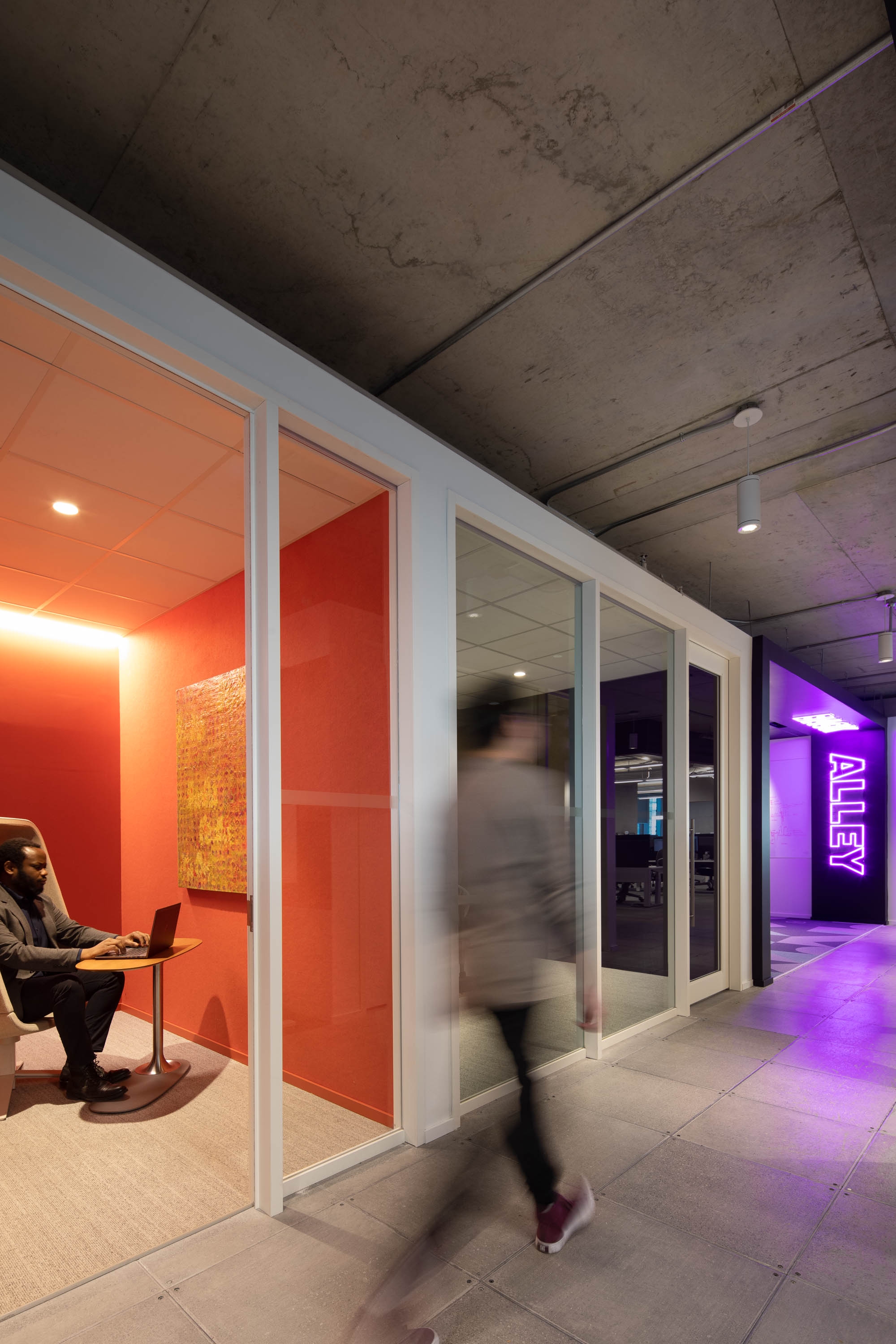Our transformative studio design seamlessly merges human-centered principles with innovation, inspiring employees to return in a post-pandemic world. The design promotes choice, space variety, democracy, adaptability, and wellness. It prioritizes behavior-focused design for a successful hybrid work setup. Versatile "neighborhoods" cater to diverse needs. From serene 'Oasis' retreats to collaborative 'Back Alley' zones and focused 'Black Box' meeting spaces, inclusivity is fostered. Corridors and clear windows dissolve hierarchy.