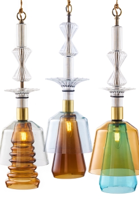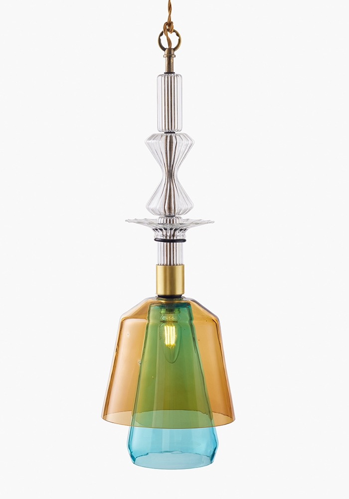 A versatile lighting aggregate with a shape developed from multiple recycled lampshades mixed together. Murano mass-colored glass elements pierced by interconnected crystal tubes with brass capped edges, each hiding a 2w tailor-made led.