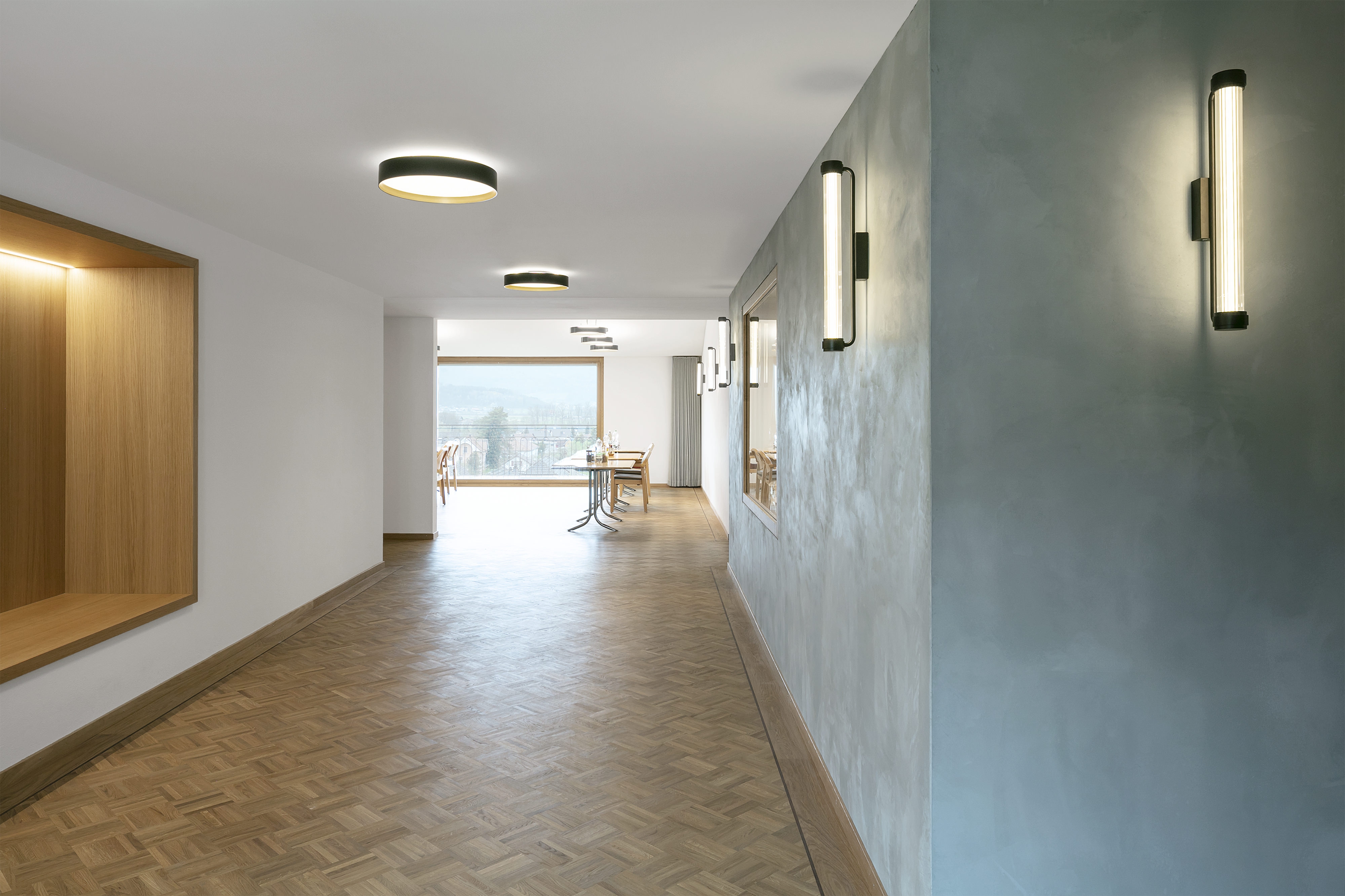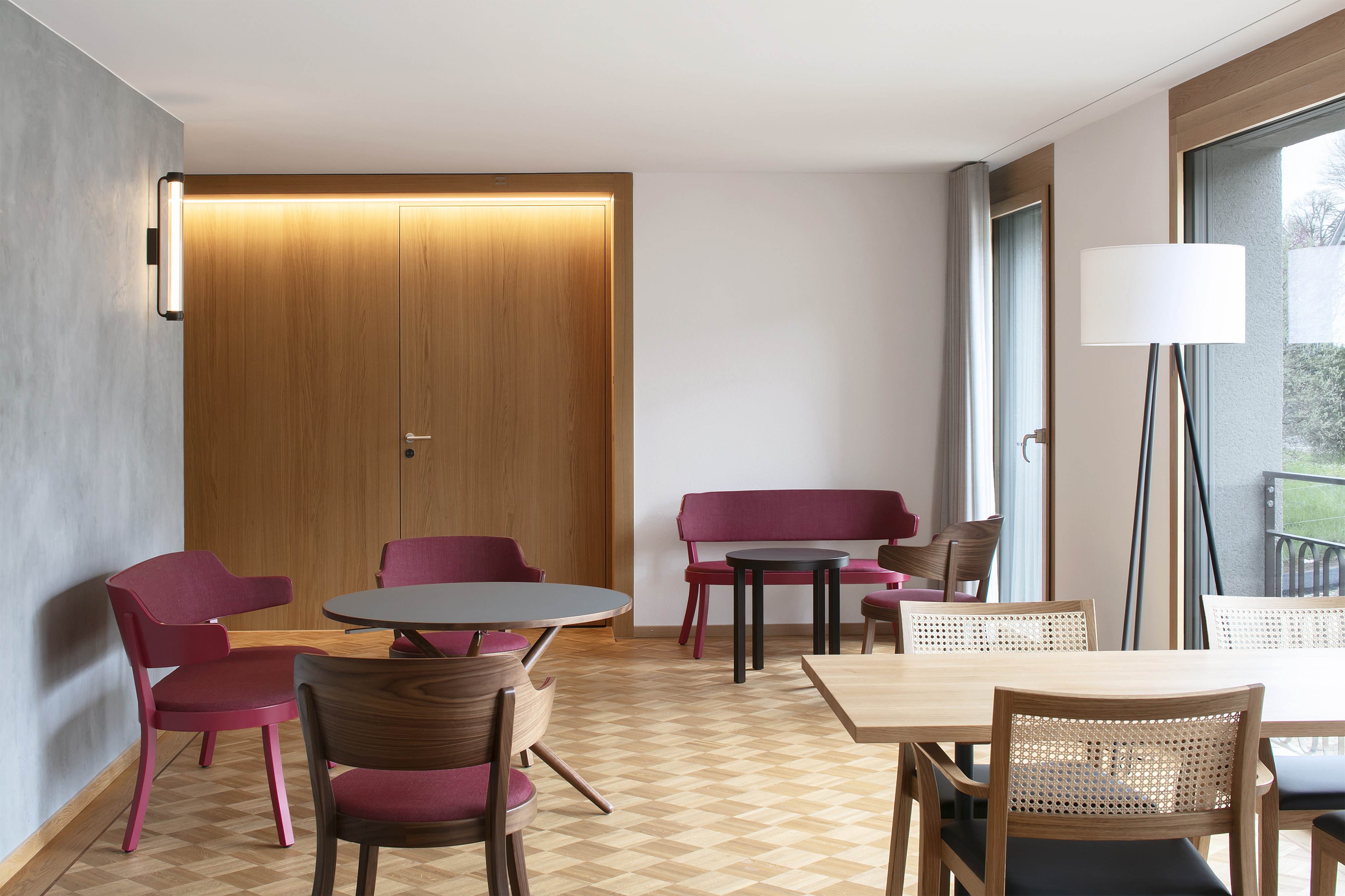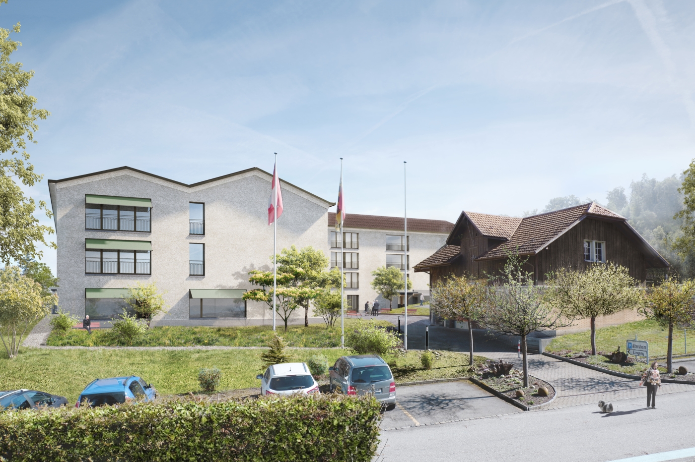 The L-shaped overall form of the retirement home in Büren an der Aaare forms a beautiful access courtyard that opens to the slope to the south and to the historic farm building to the west. The park-like surroundings up the slope, as well as the garden with the pond to the east and the various walking paths offered to the residents, create a scenic atmosphere that will be largely preserved with the extension of the home.