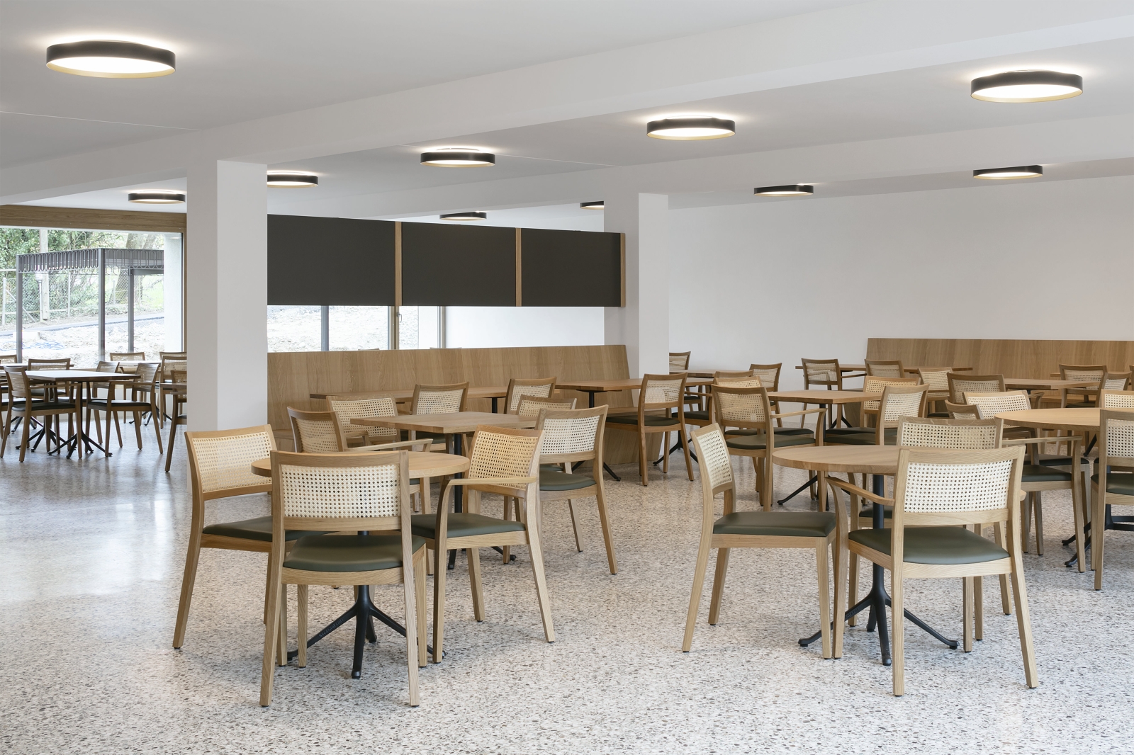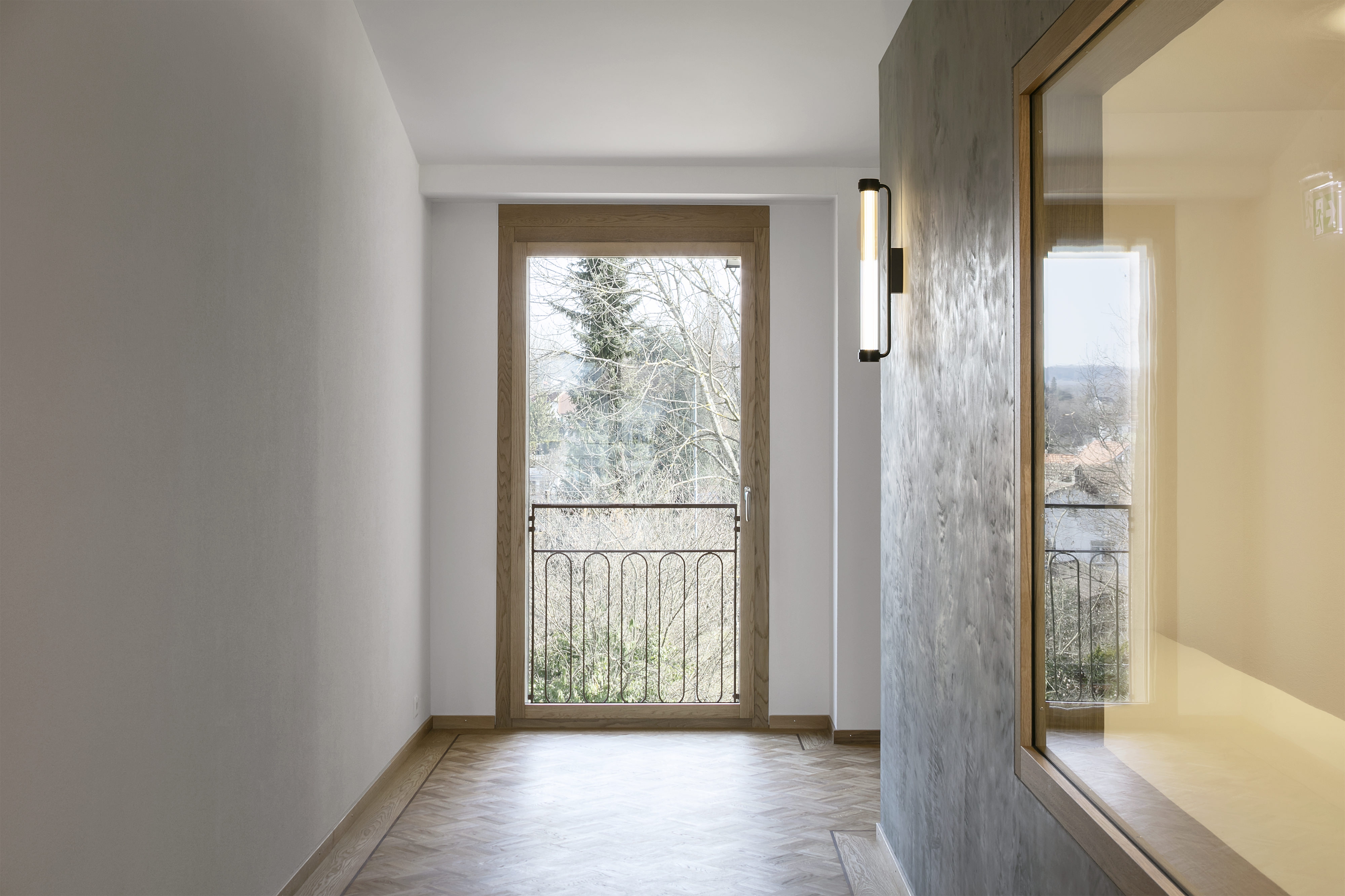 The facade design of the extensions is based on the existing building with its plastered perforated facade and metalwork.