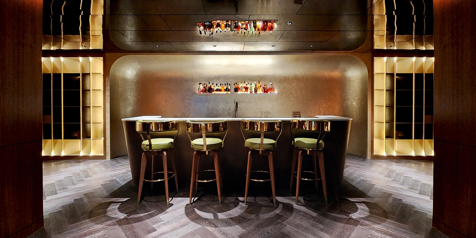 The metamorphosis of an old garage into a lavish entertainment retreat is a testament to creative design and functionality. This space has been meticulously tailored to indulge the owner's love for entertaining guests and displaying a remarkable collection of fine alcohol. Rich mahogany tones, champagne gold metal highlights, and vivid color accents harmoniously interlace to create a captivating visual tapestry.