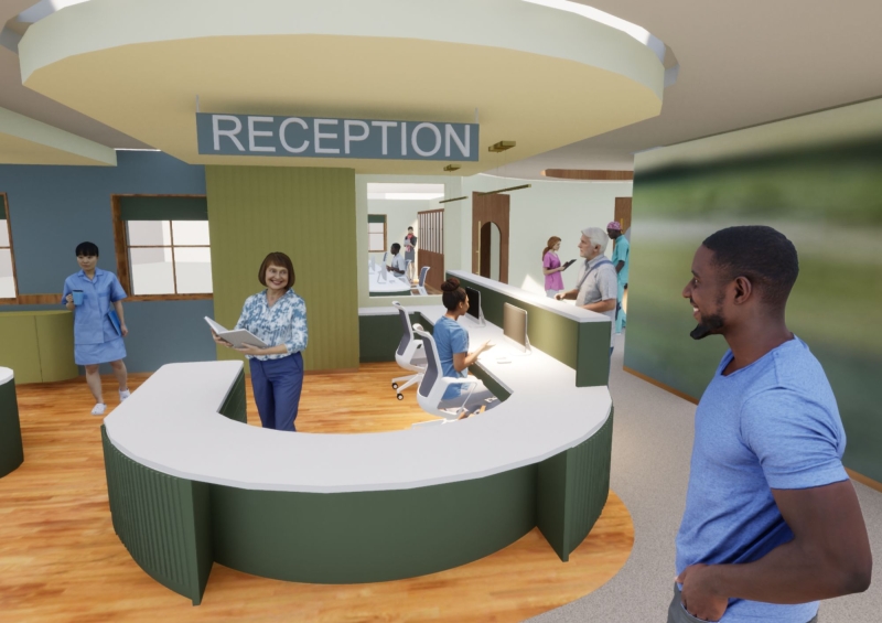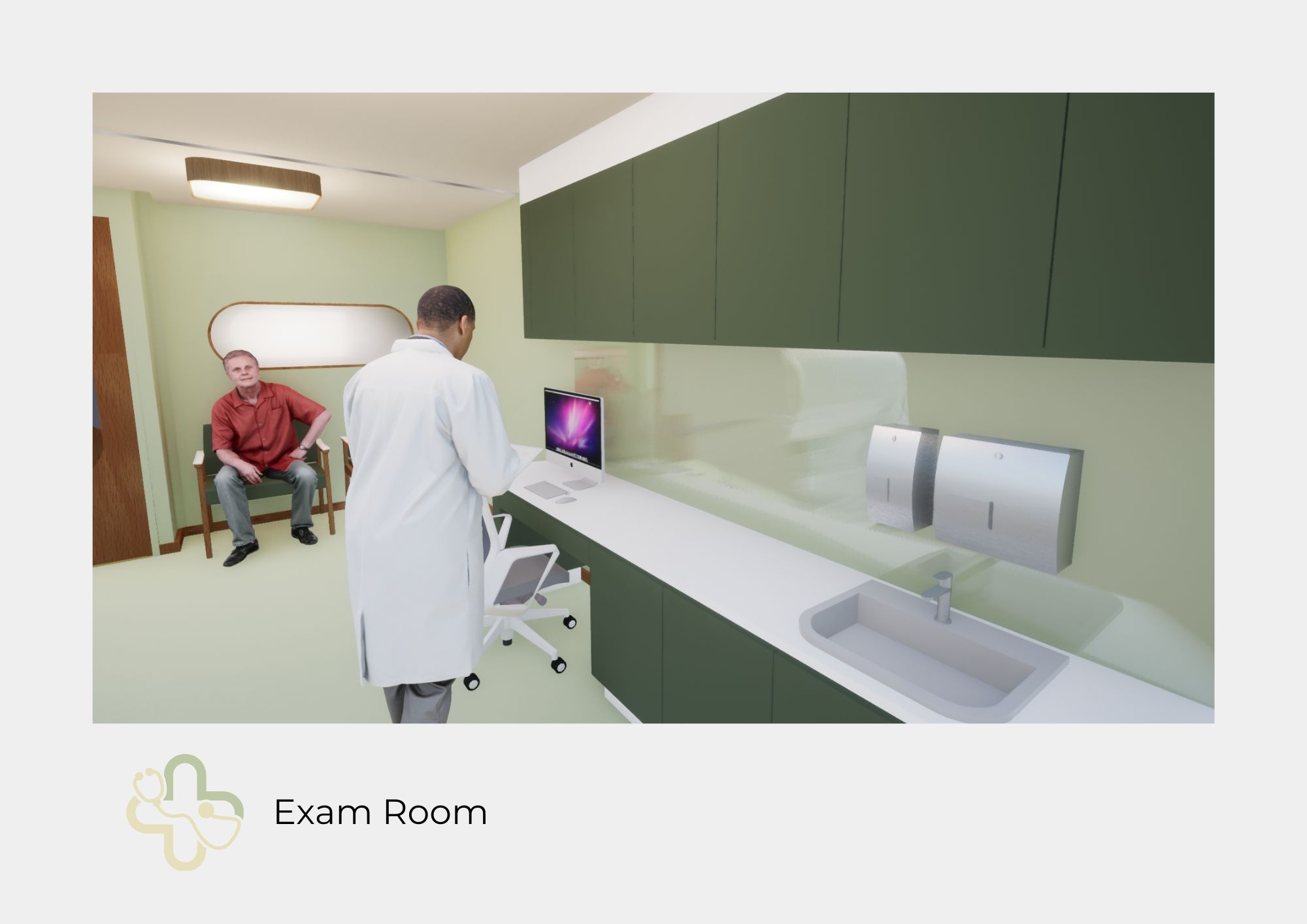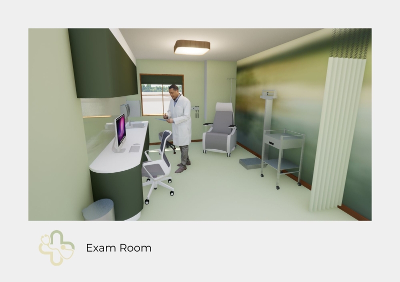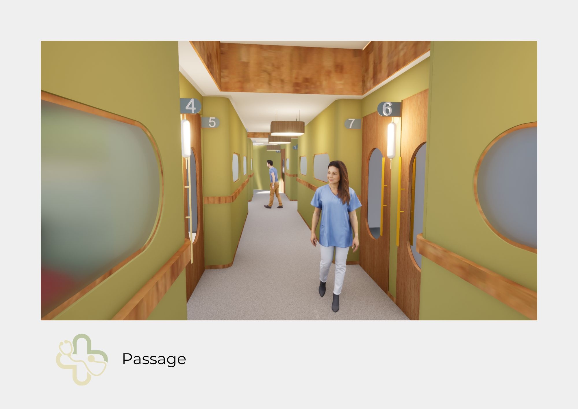 As part of my design language, I introduced curved edges and designs. In plan, these curved edges bring a soft fluidity to the walls and joinery and provide a safety measure from sharp corners to those who may be unsteady on their feet. In elevation, the windows along the passage in a pill shape break up the monotony of the long passage while providing access to daylight from the exam rooms.