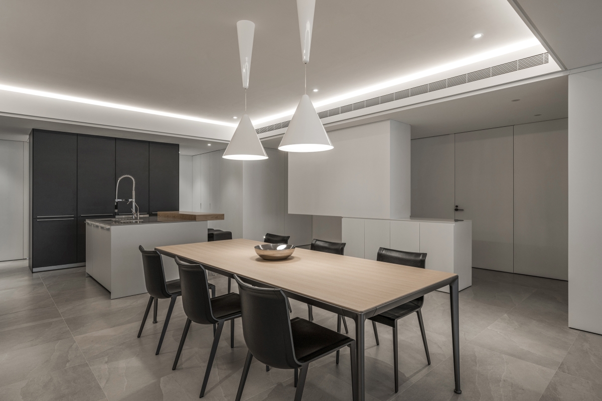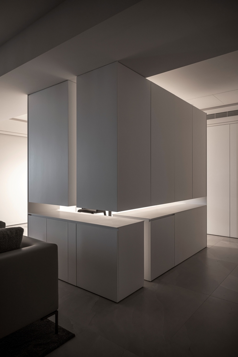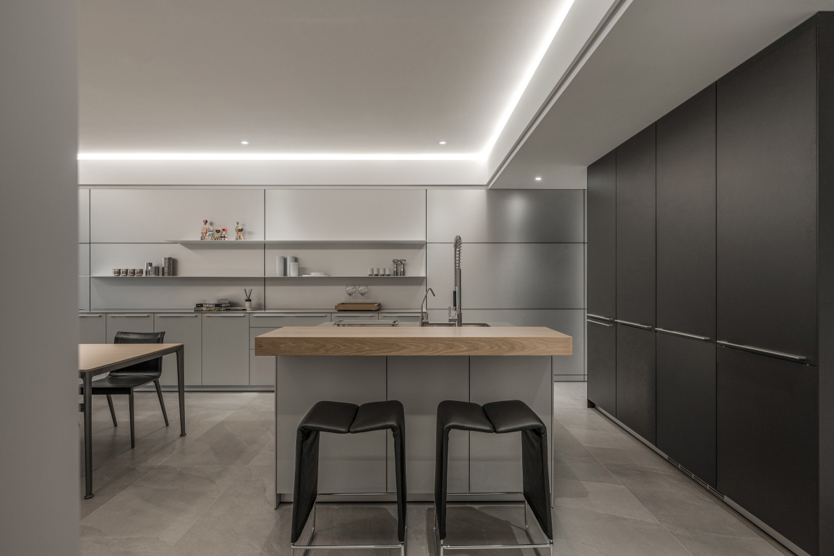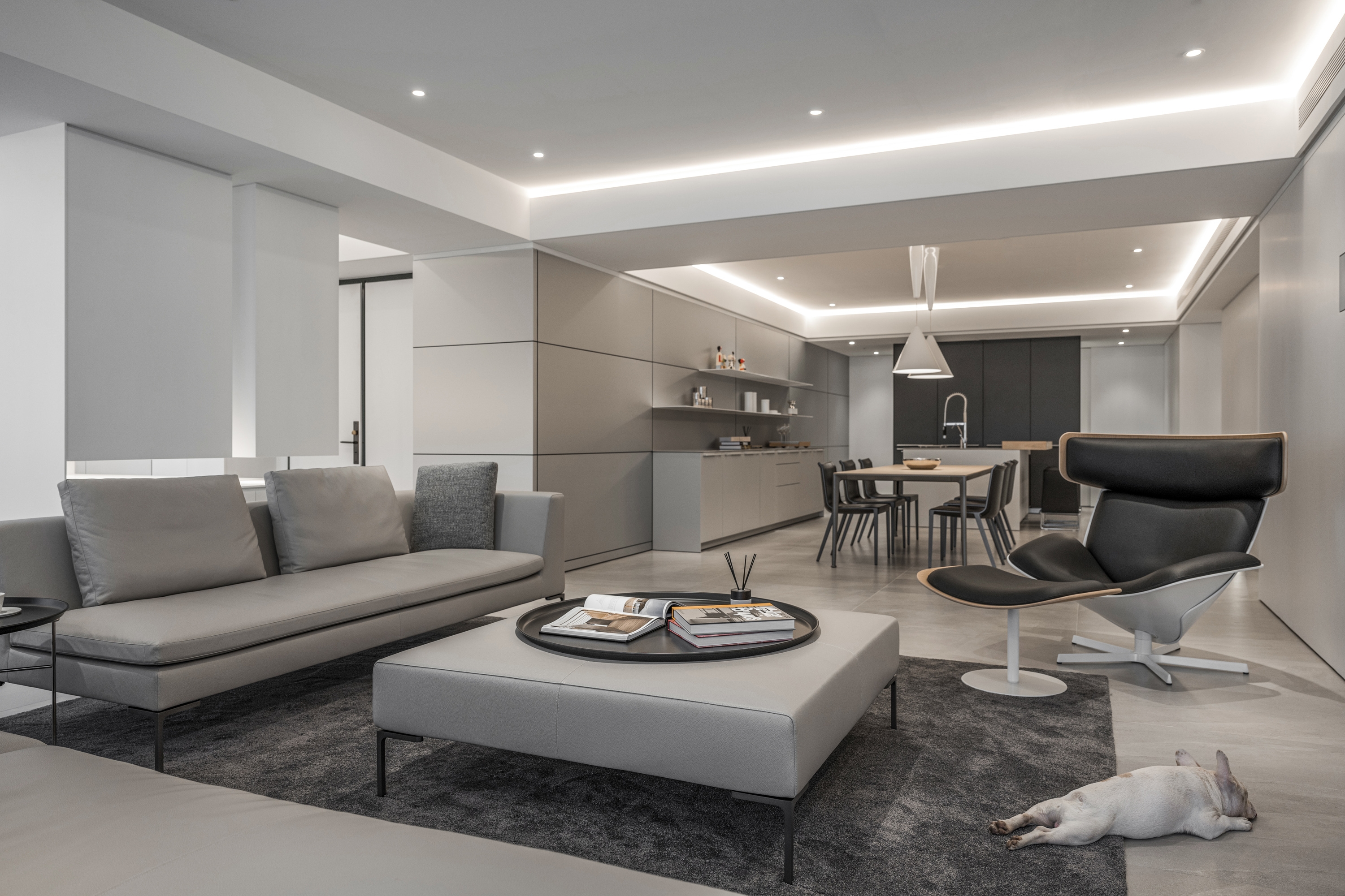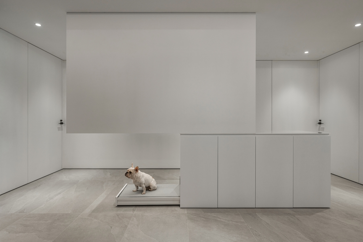 In the common space, the J-shaped cabinet features a specially tailored gap at the child's height, allowing their grandchild to interact with the occupants from the study room. On the other hand, the Z-shaped cabinet offers dual functionality, with food storage in the front and space for the dog's necessities on the side.