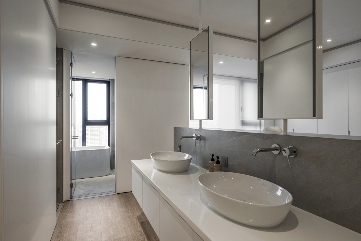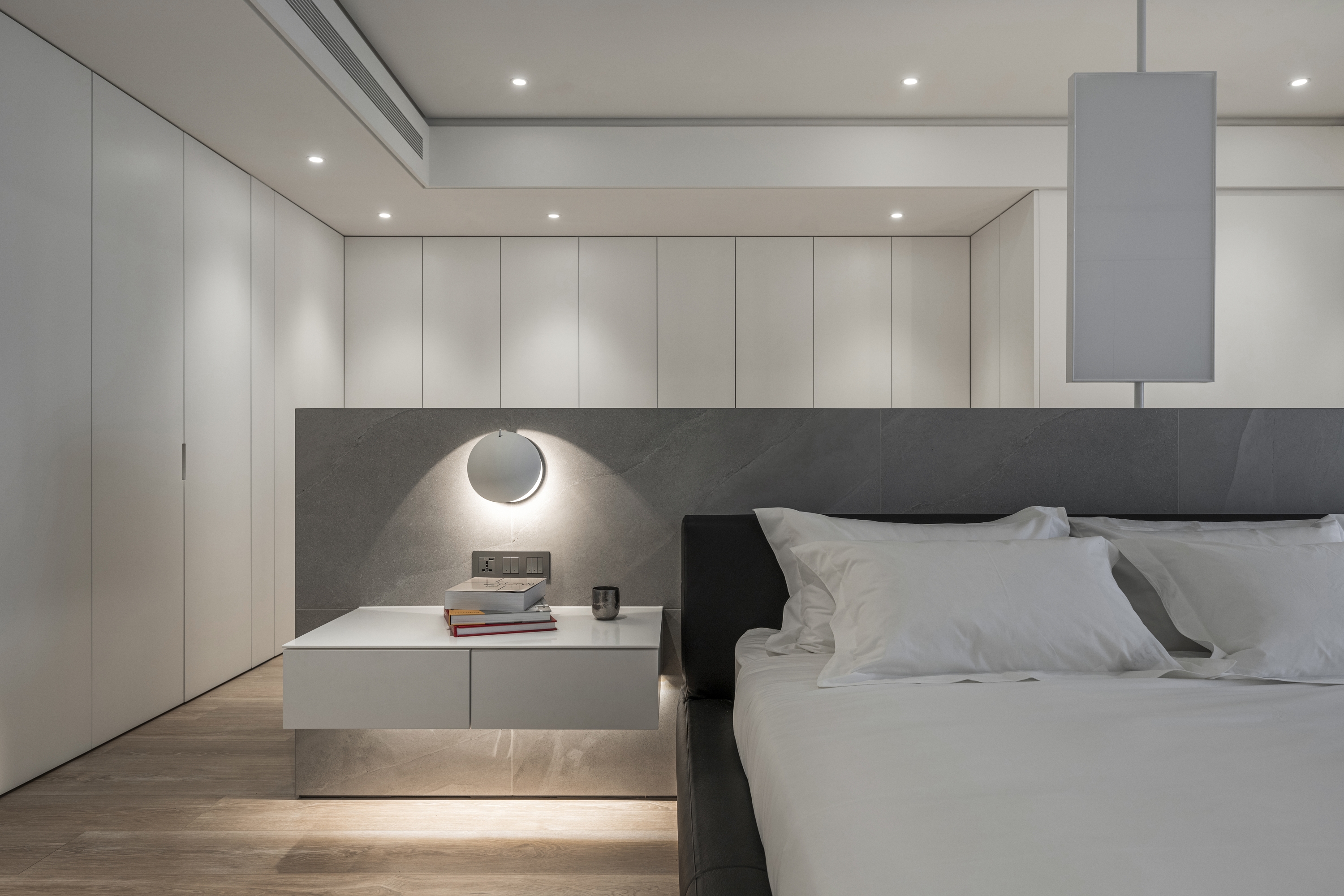 In the master bedroom, the mirrors are strategically fixed with sticks, evoking the imagery of the letter "I" cube descending in the game. A half-height stone wall serves as a partition, separating two areas within the room: one side acts as the headboard, while the other side incorporates the bathroom faucets.