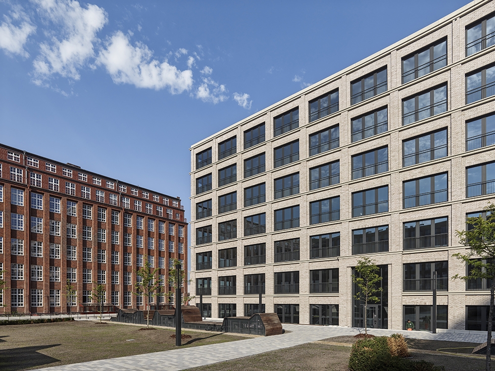 The TechnoCampus Berlin was created as a balanced ensemble of historic buildings and new constructions that pay tribute to the tradition of the location in their tranquillity, self-evidence, in their quality of craftsmanship and generous sequences of rooms. The historic existing complex was juxtaposed with a similarly closed, urban figure: an angular building with seven storeys (BT1) and another including a three-storey extension (BT2). This created two courtyards with generous green spaces that further emphasise the campus character of the project.
