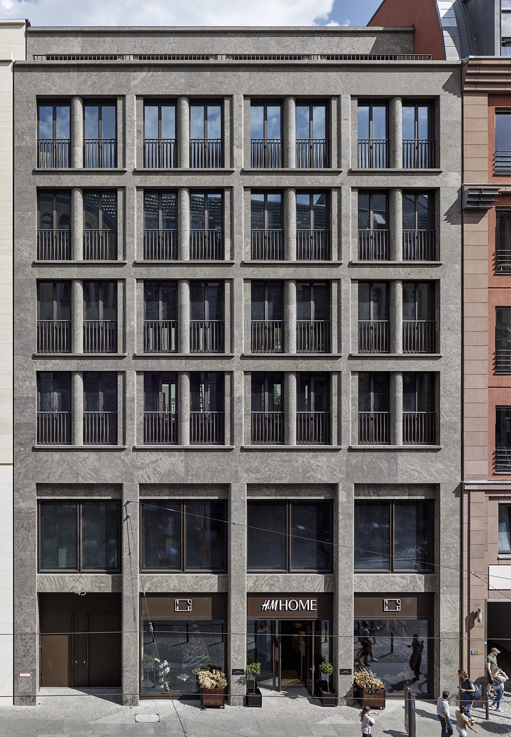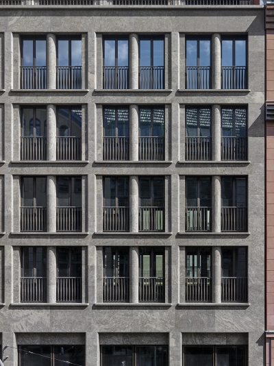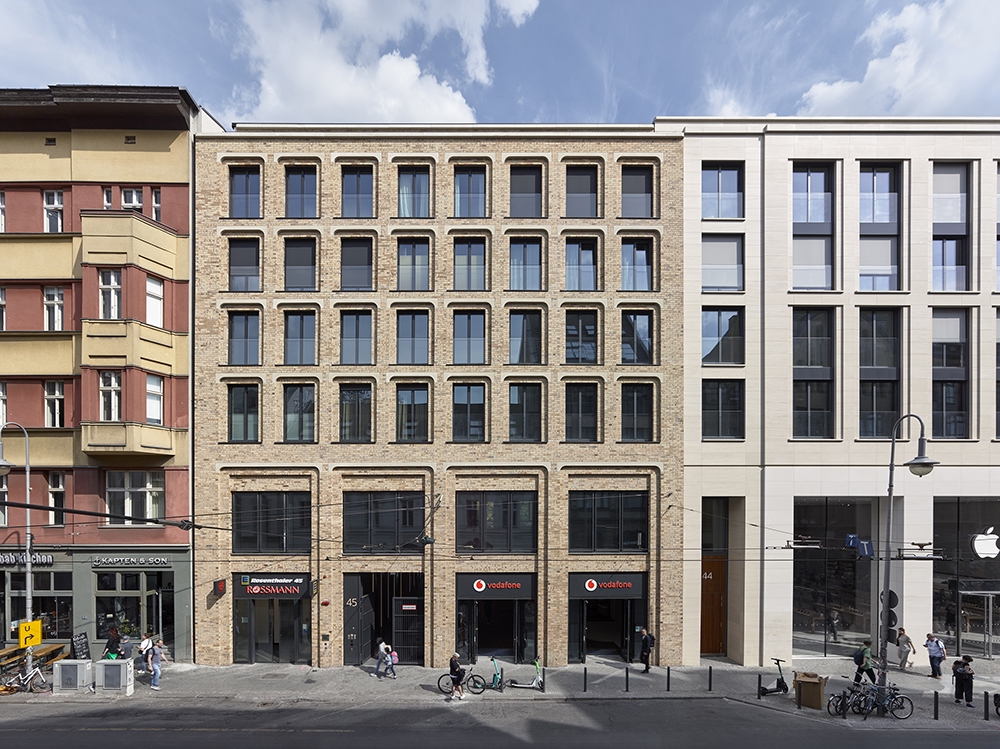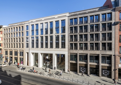 At Rosenthaler Strasse 43-45, directly opposite the Art Nouveau ensemble of the Hackesche Höfe, a modern, three-part, new building has been erected using reinforced-concrete construction. It has seven storeys above ground, two basement levels, and a gross floor area of 15,000 sqm. It picks up on and complements the surrounding neighbourhood's mix of residential, commercial, and office functions. The varied, detailed façades of the three buildings are a direct reference to the historical parcelling of the building site. Their elaborate design and high-quality materials give the entire block a completely new quality and dynamism.