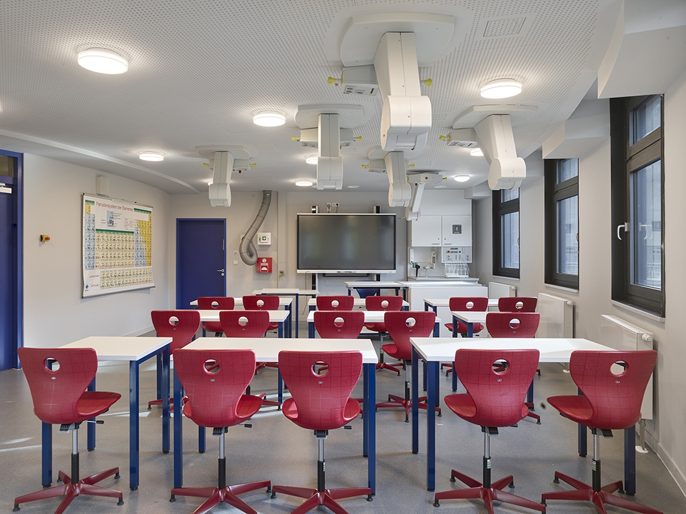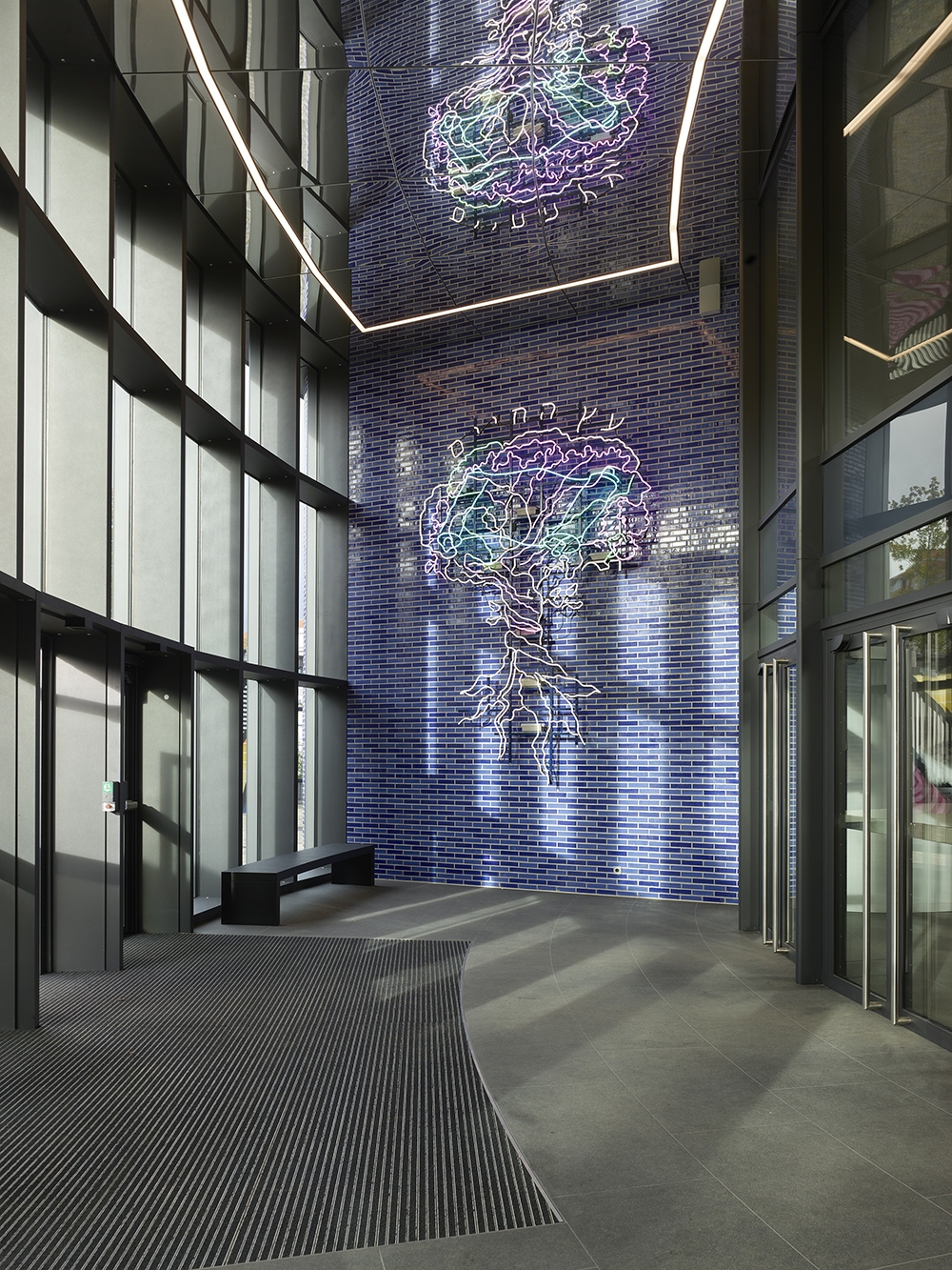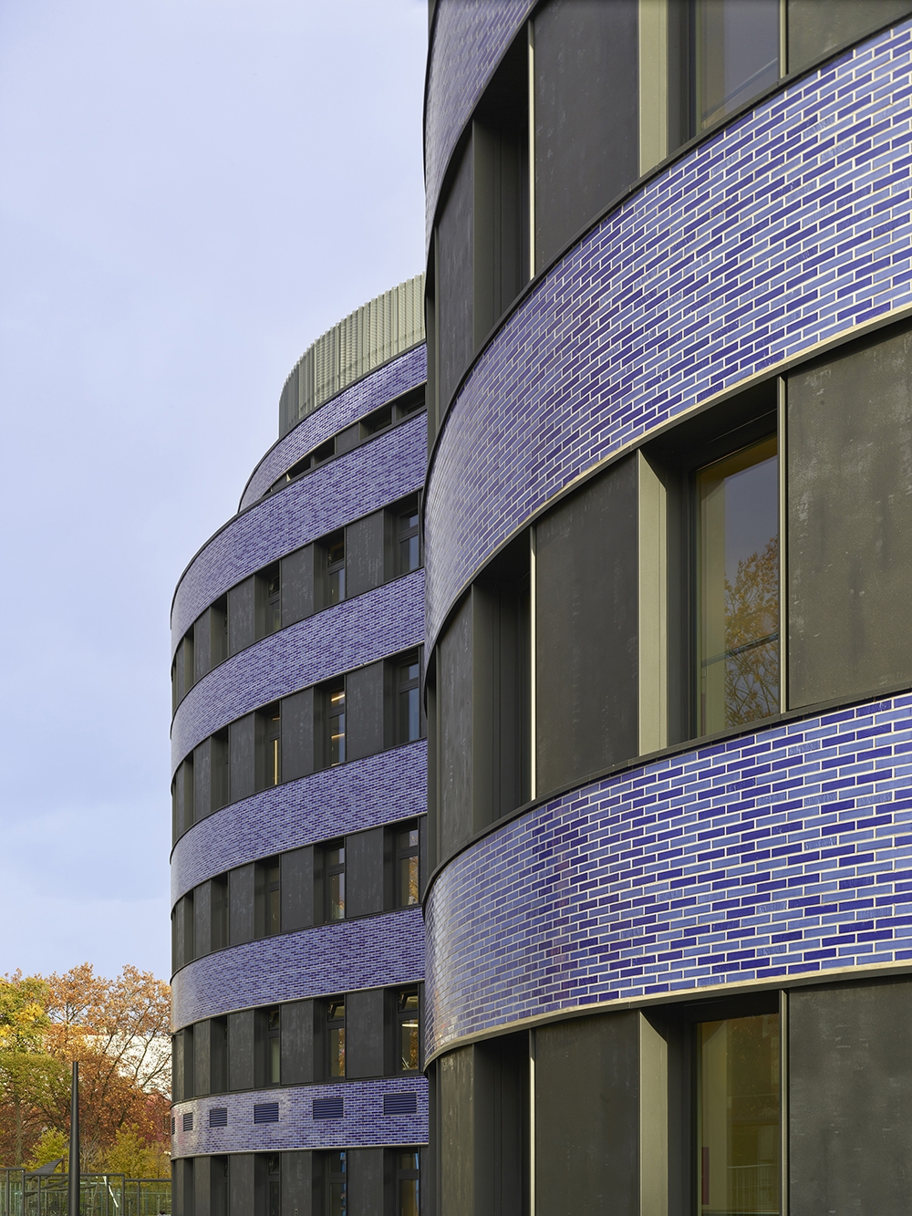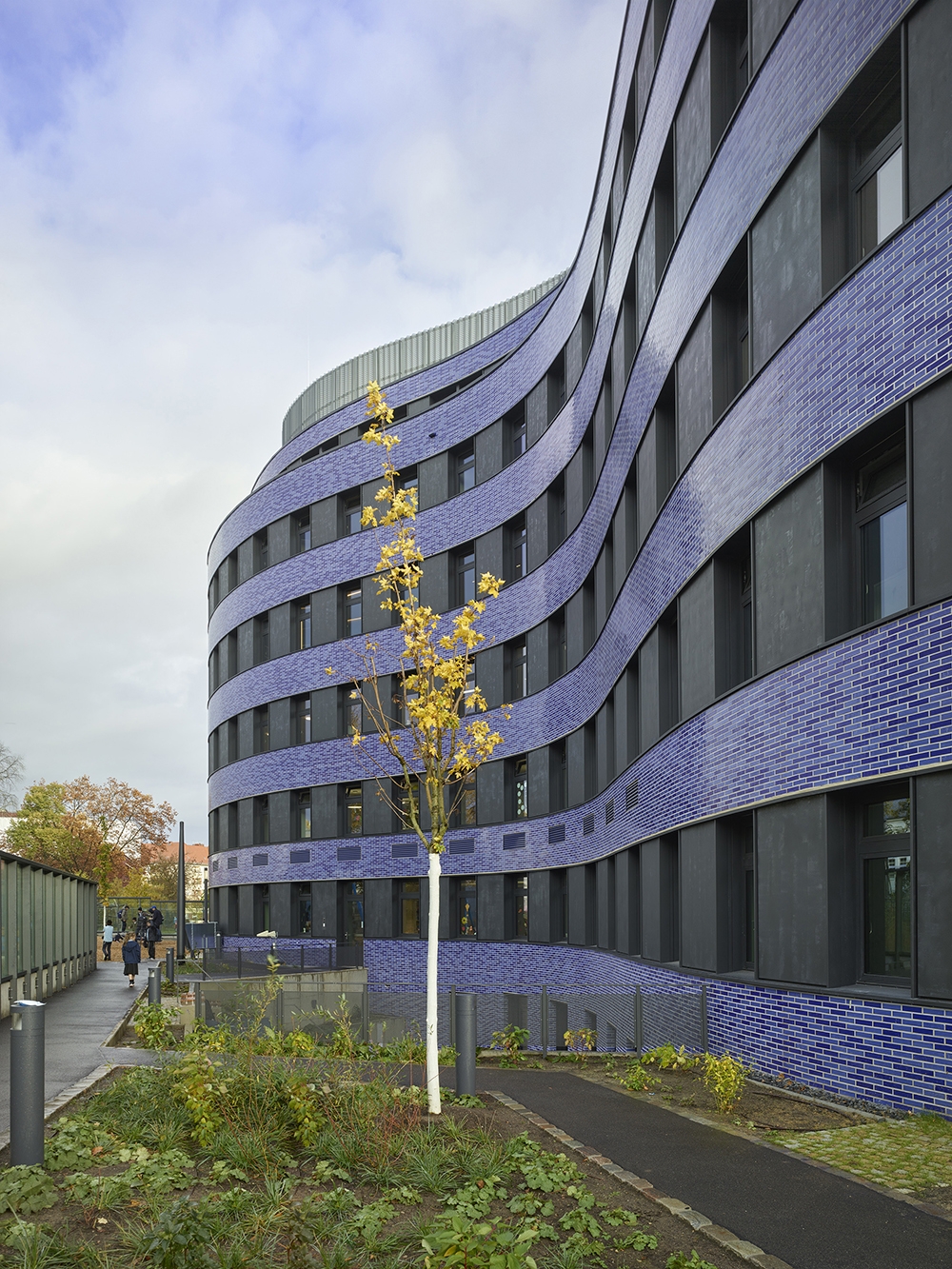 The community centre Pears Jewish Campus Berlin in Berlin-Wilmersdorf is a facility for children and young people consisting of a school, a crèche, and a kindergarten. The new school building with its organically curved form is a free-standing structure embedded in a green school garden with diverse open spaces. The two-storey multi-purpose hall on the third floor can be used flexibly for sports activities but also for cultural events. Constructed in masonry and concrete, the building immediately catches the eye with its colourfulness and materiality. The colour blue has had a special significance throughout the history of Judaism right up to the present day: reminiscent of the blue of the sky, this shade is the colour of divine revelation. The walls of the main entrance are adorned with two kabbalistic trees of life – light installations by the artist Anna Nezhnaya. They symbolize the two countries Germany and Israel. The two-storey entrance hall has a mirrored ceiling as a special design element. From the adjacent staircase, all floors are wheelchair-accessible via at least one lift. The concrete wall on the street side shows graffiti by the Berlin street artist TOBO.