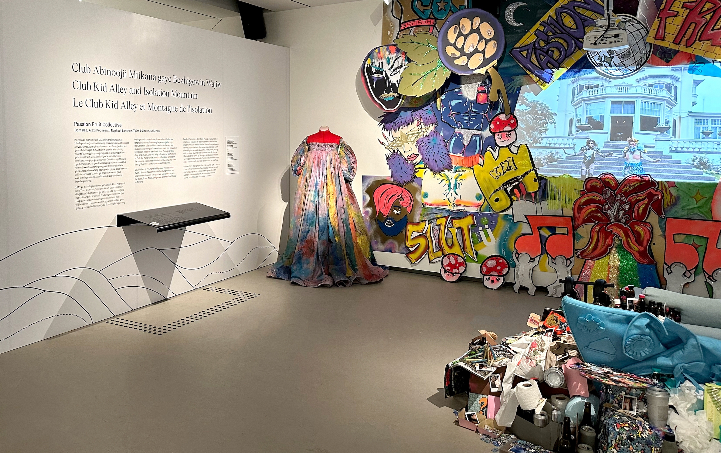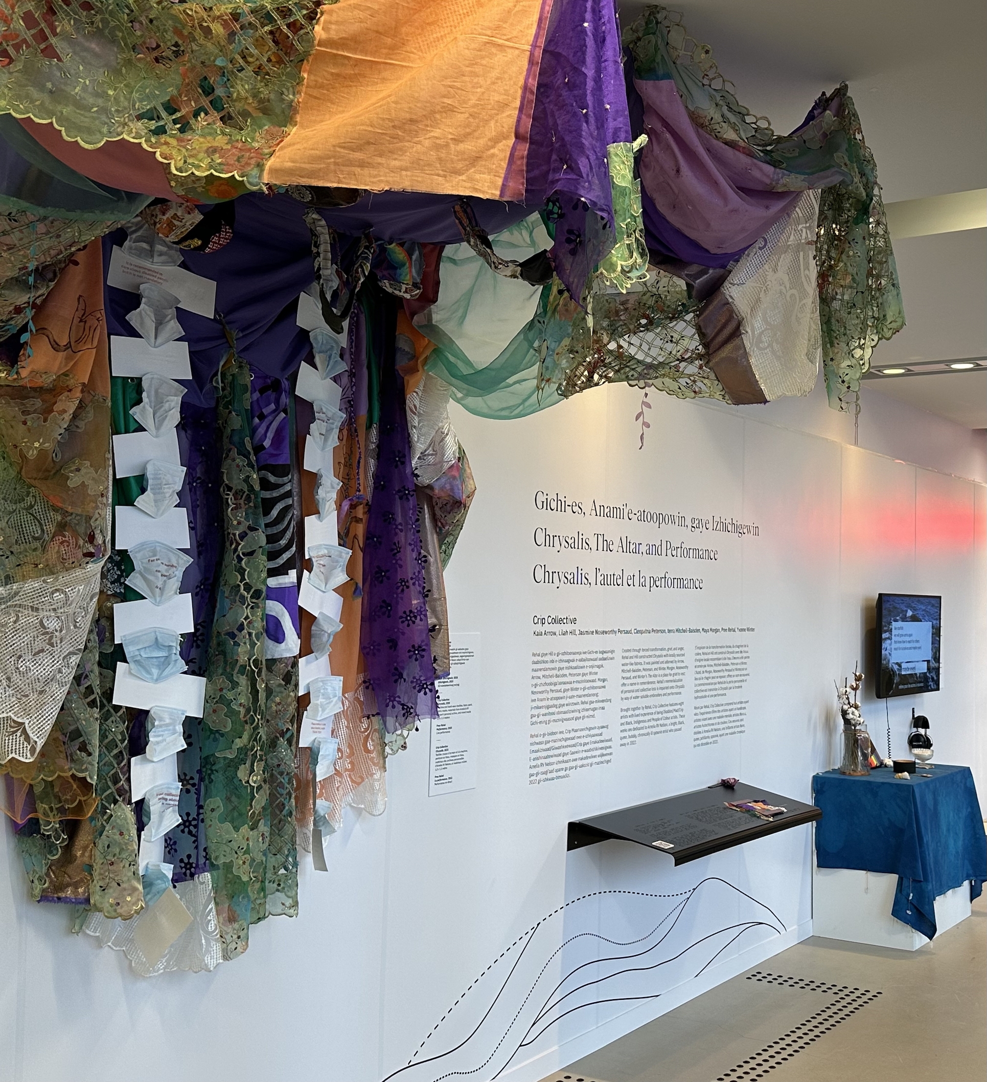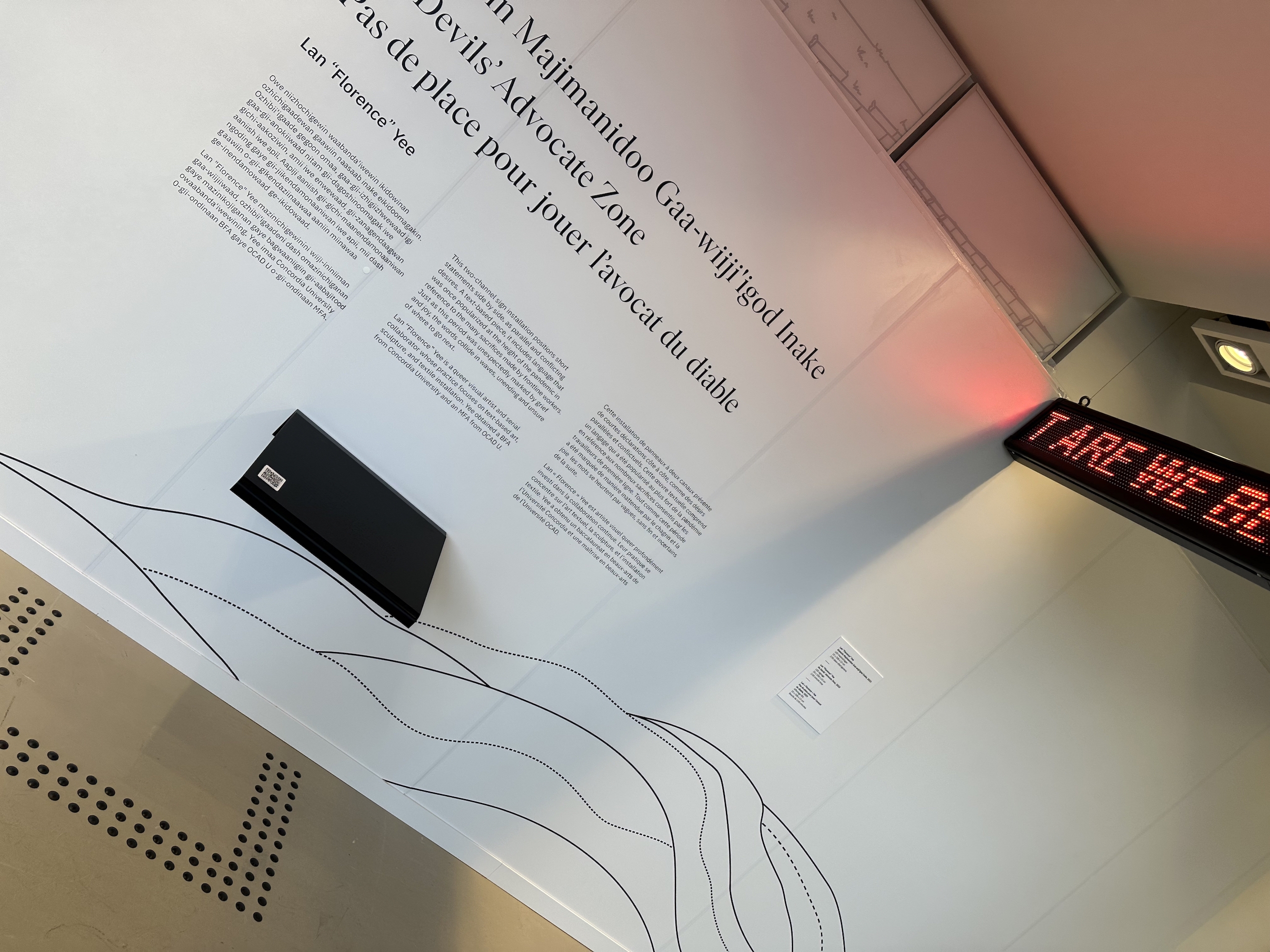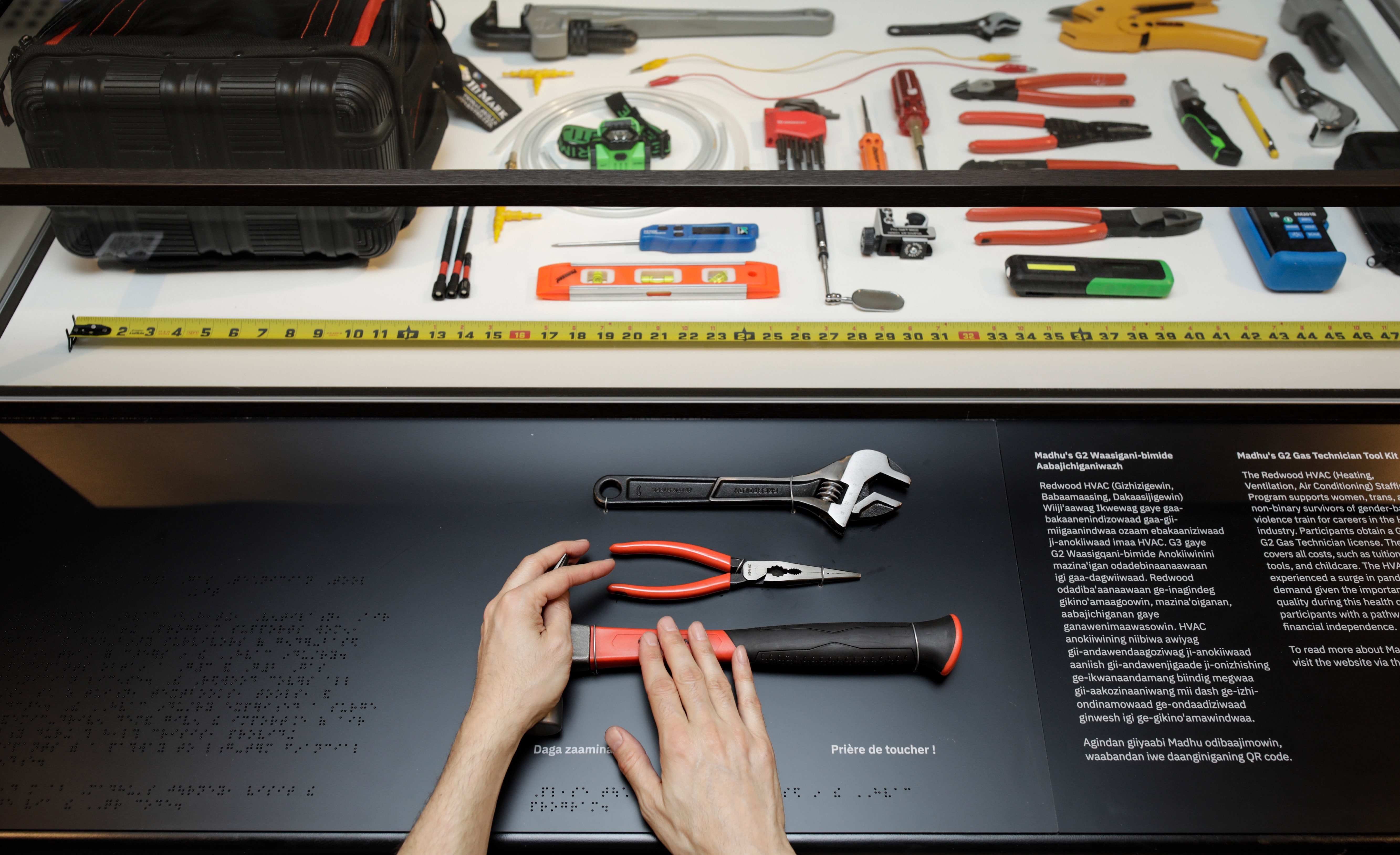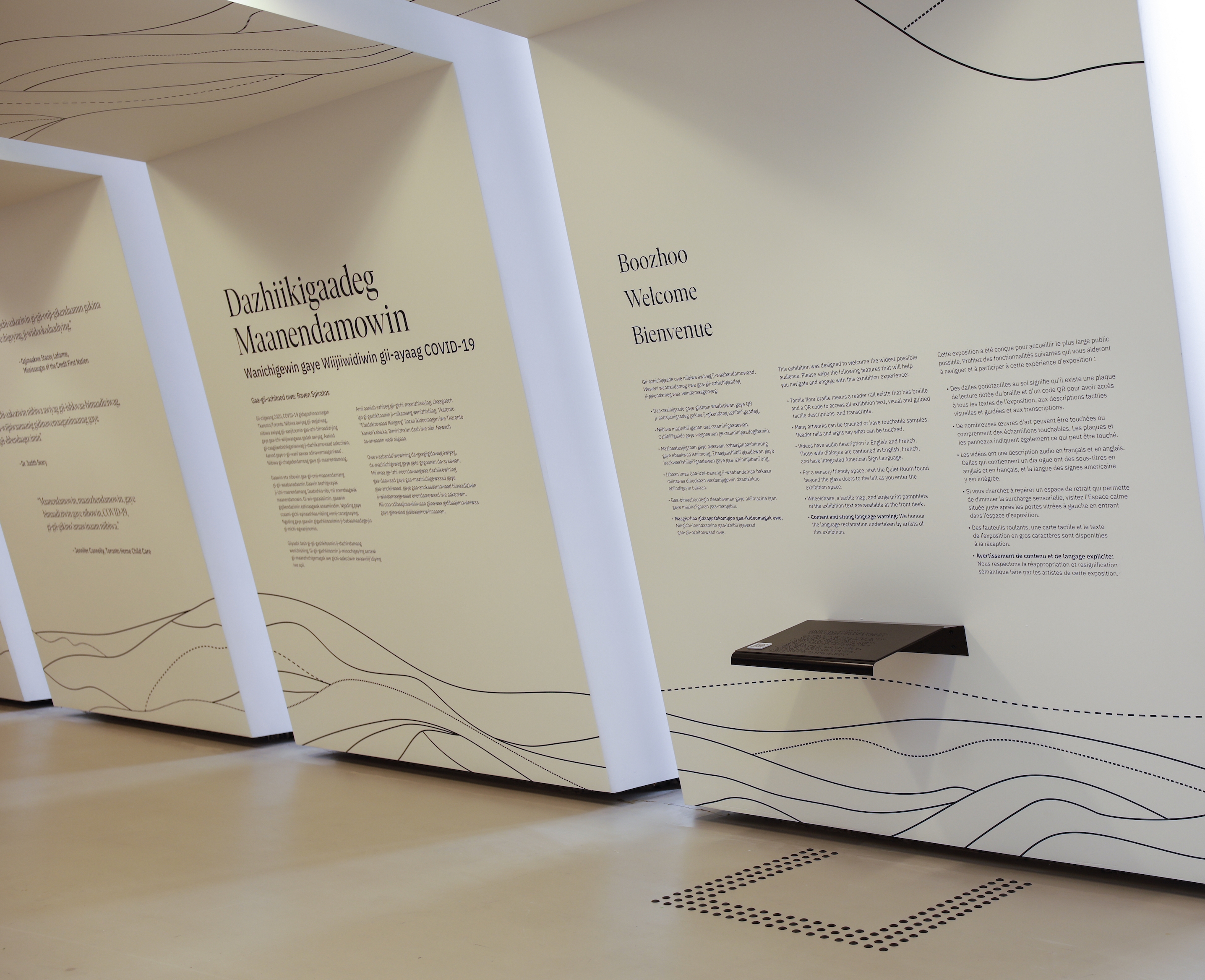 The content (its reading level, its inferred dwell time, concepts being transliterated in Anishinaabemowin and vice-versa back to English and French), the content's presentation – graphic design (in situ, online, and in collateral), size-to-distance considerations, viewing angles, visual hierarchies, colour and contrast ratios, artefact touch affordances, braille at each text panel, high contrast graphics, tactile maps, ASL, captions, AD, text-to-speech, zoom, and more ensure inclusive access for all.