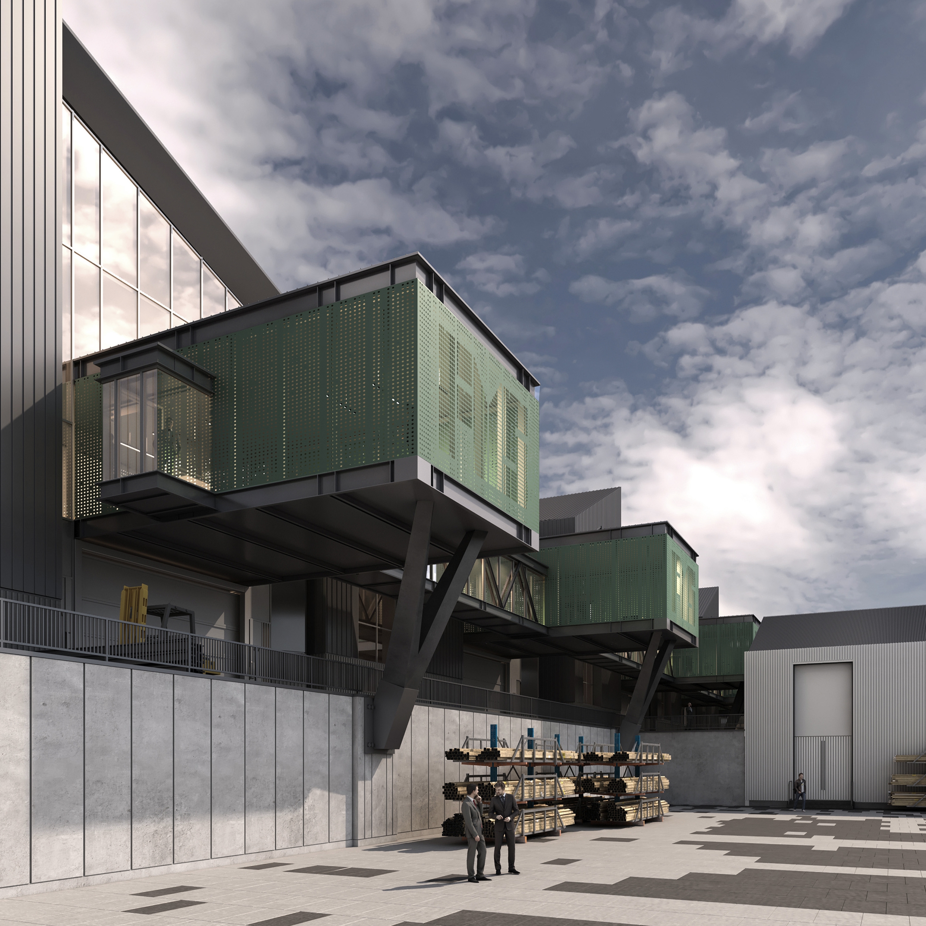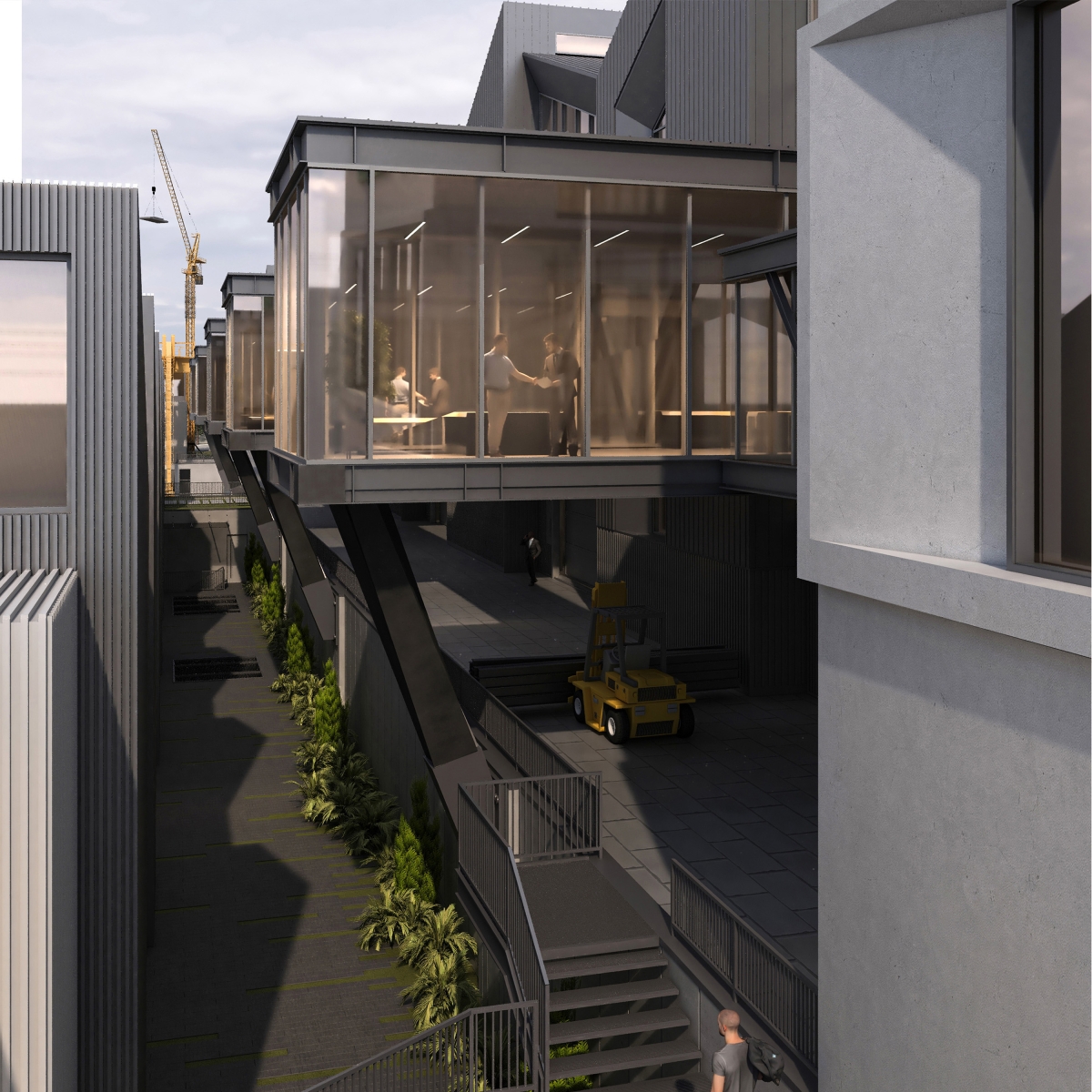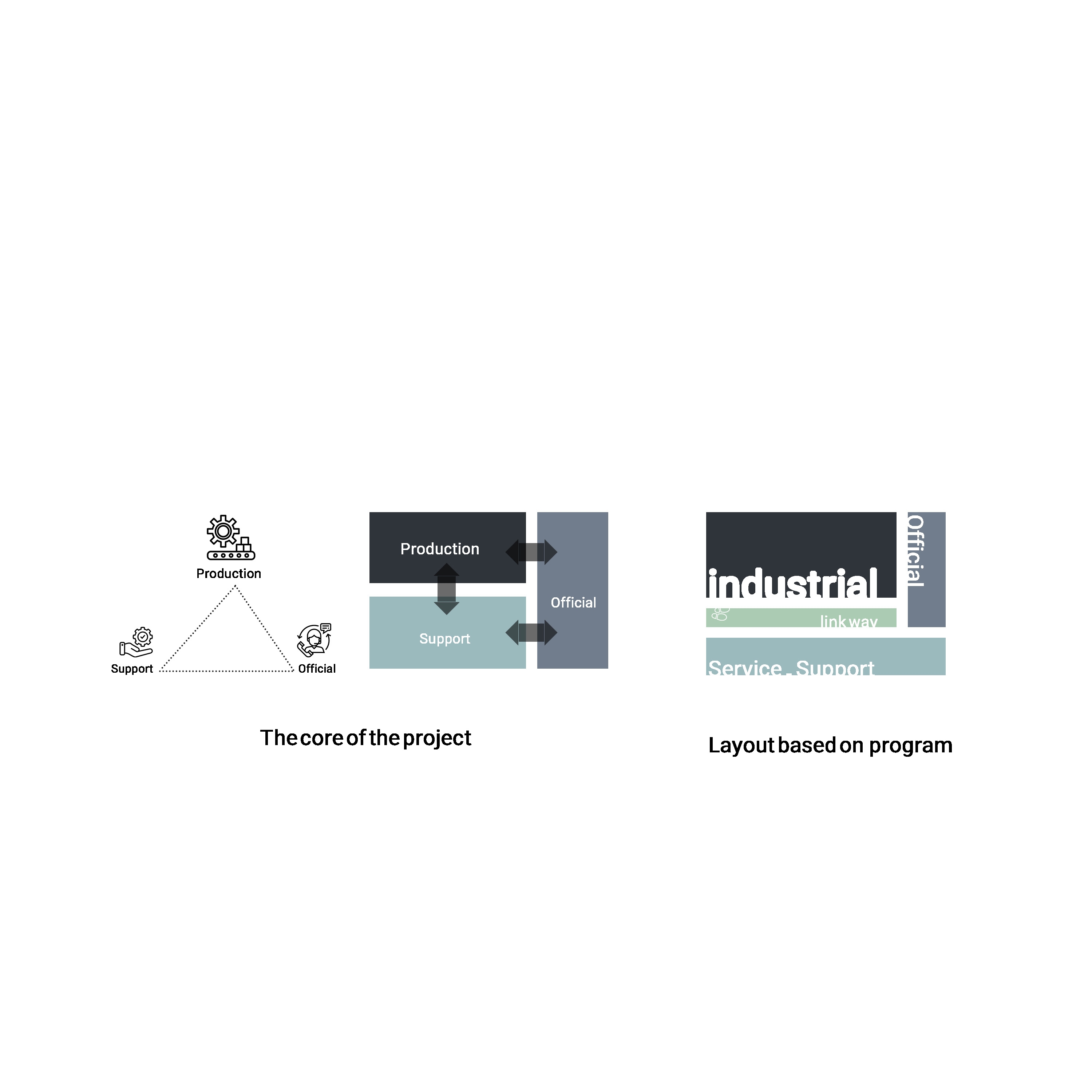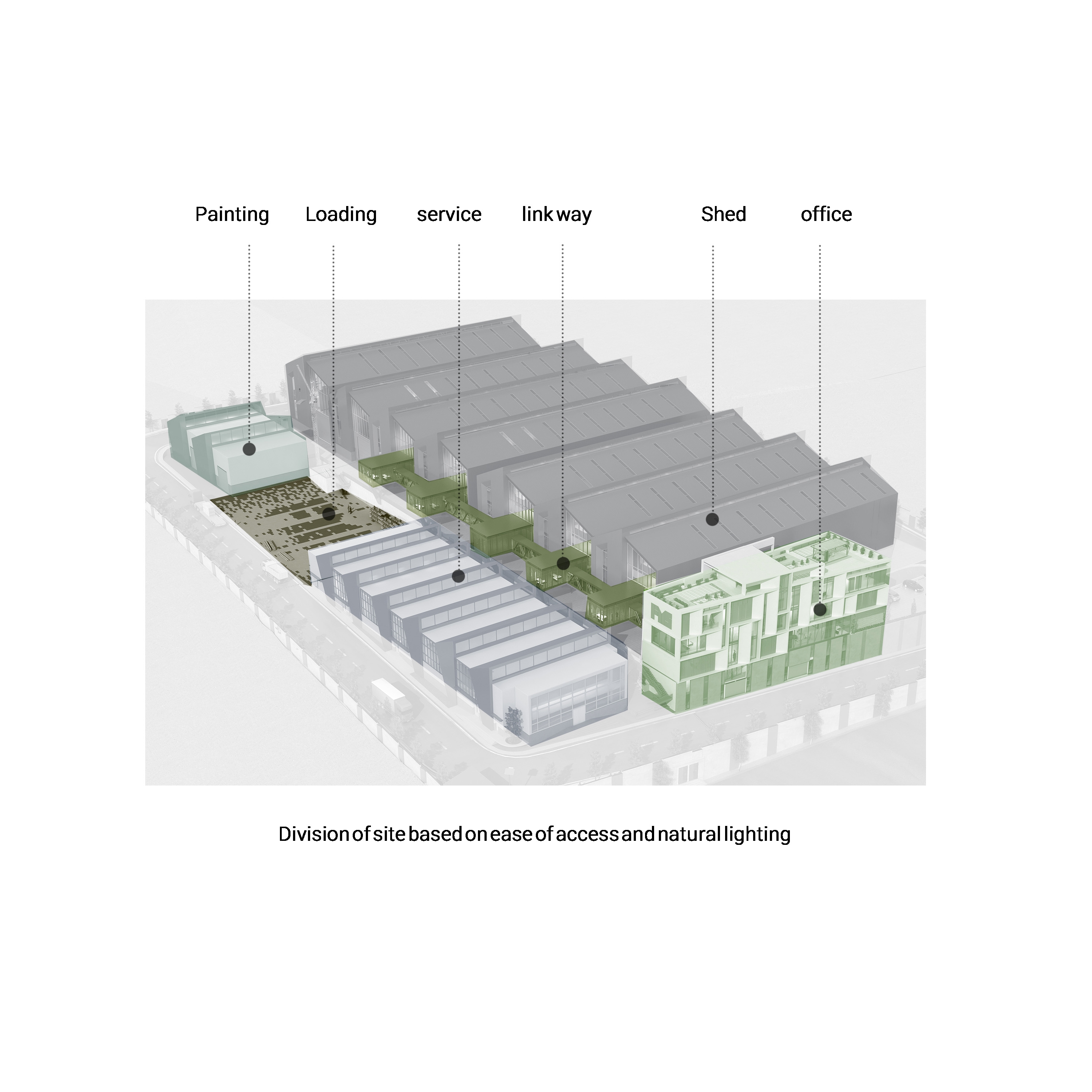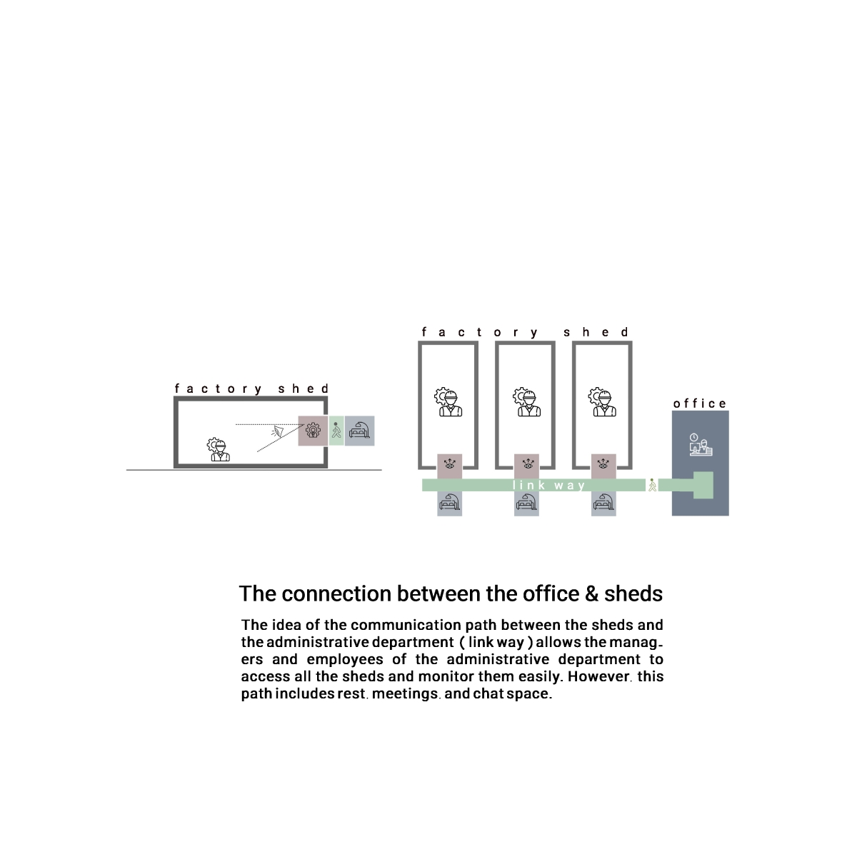 The idea of a communication path between the sheds and the administrative department (link way) allows managers and employees of the administrative department to easily access and monitor all the sheds. However, this path includes space for rest and conversation.