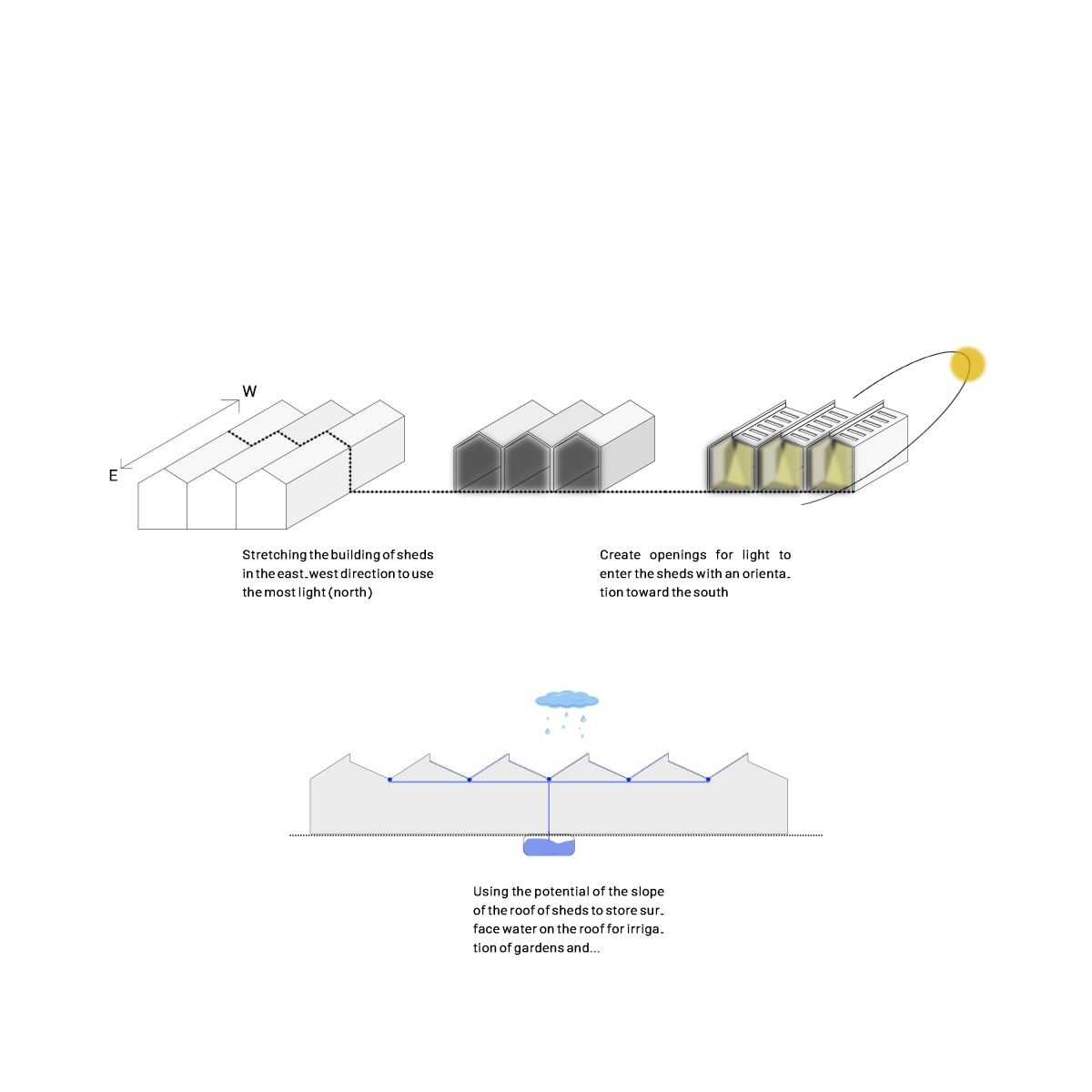 Inspired by the structure of the CPU, we were able to achieve a design strategy that can establish an optimal and efficient connection between the administrative unit and the sheds, so that all the sheds can be managed with a common path, and at the same time, this path has new capacities.