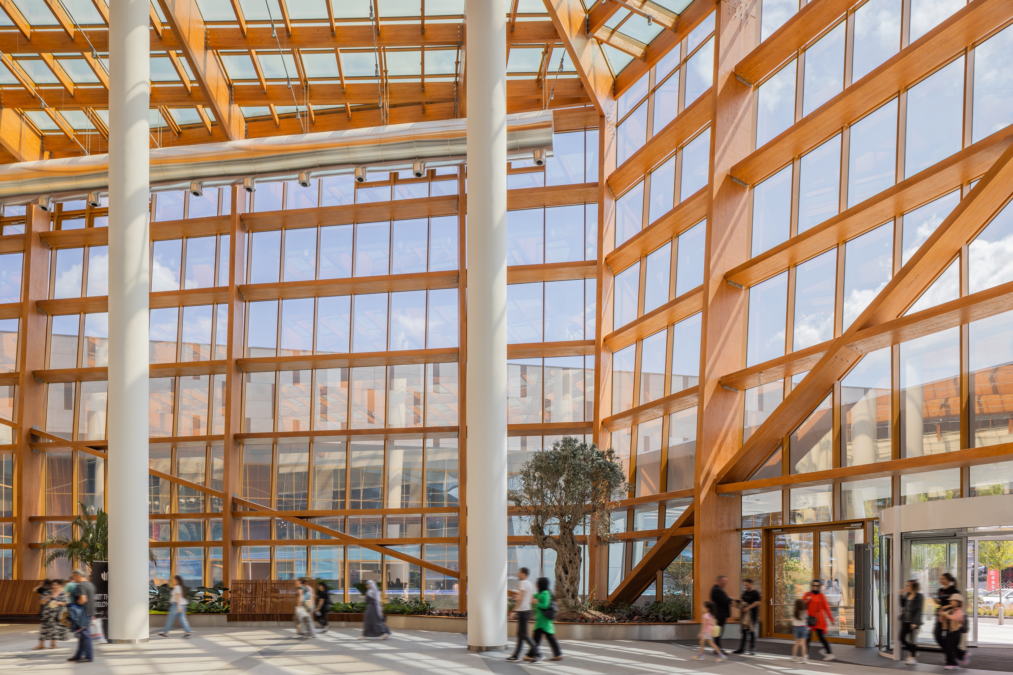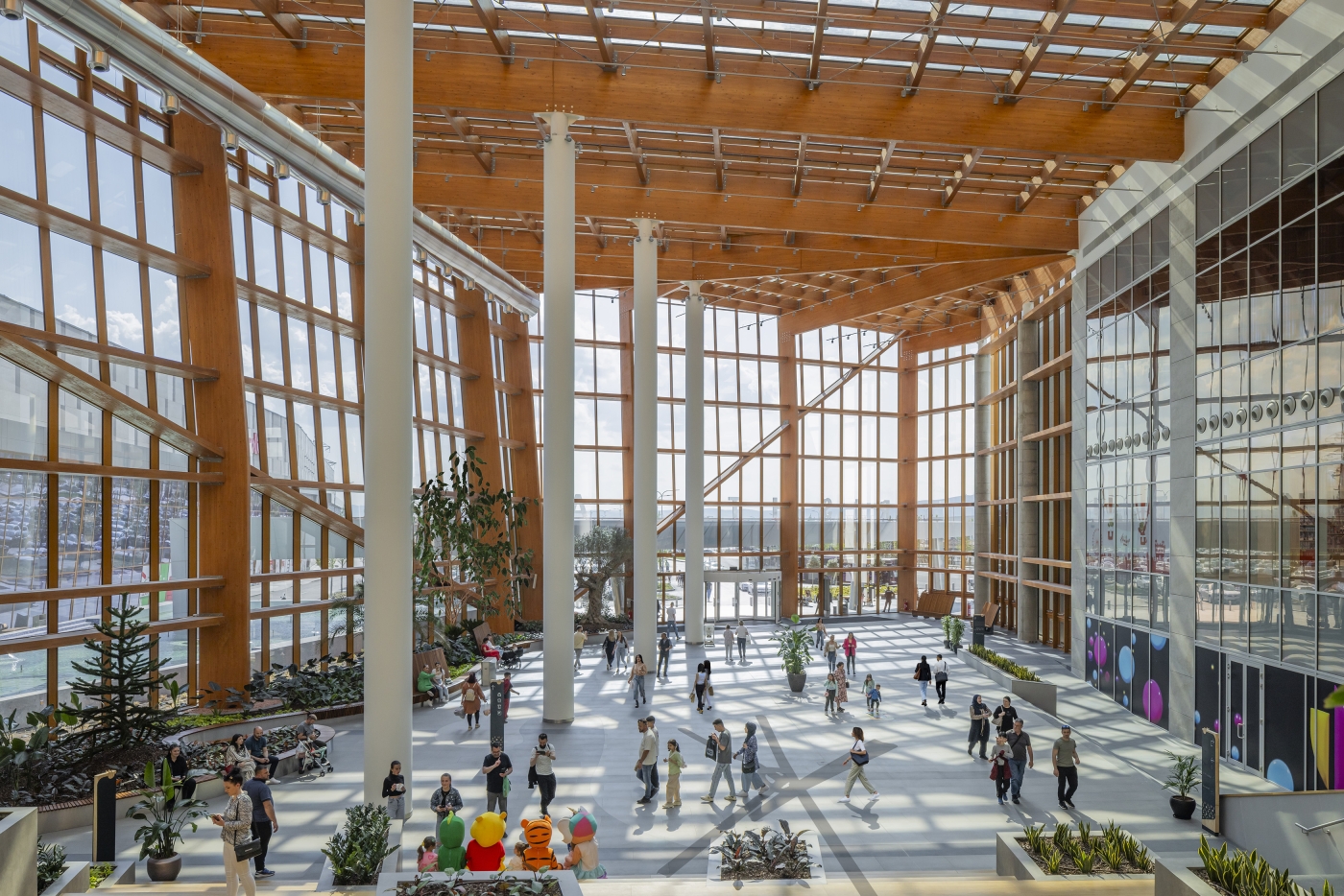 The design draws inspiration from nature, with 4 key elements shaping its architecture: the majestic mountain, lush forest, serene valley, and captivating water. The mountain is embodied in an iconic tower at the entrance, while the forest is represented by atriums with glulam timber frames. The valley is echoed in clerestory glazing, and water is symbolized by active fountains at the entrances.