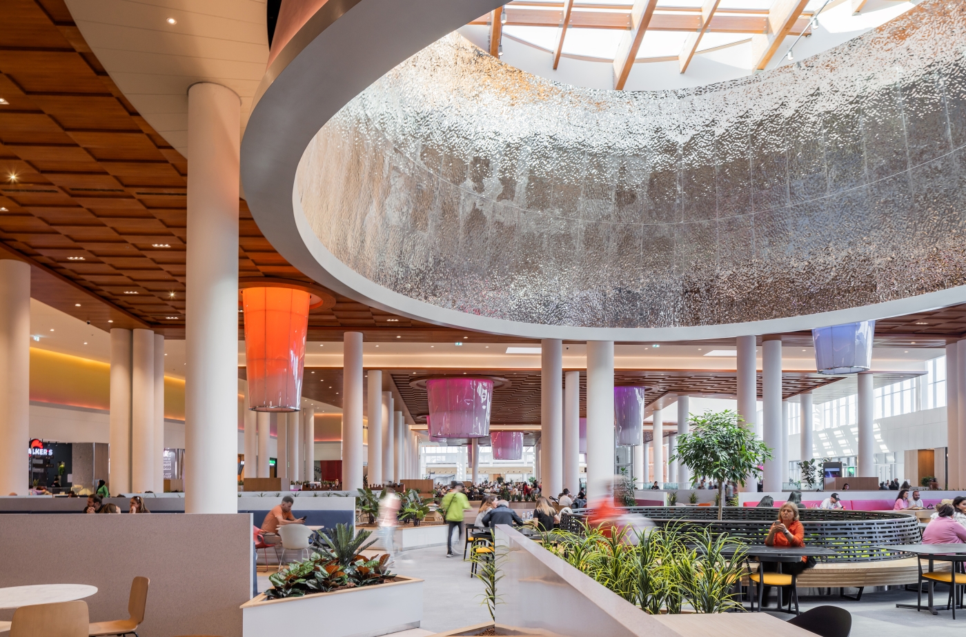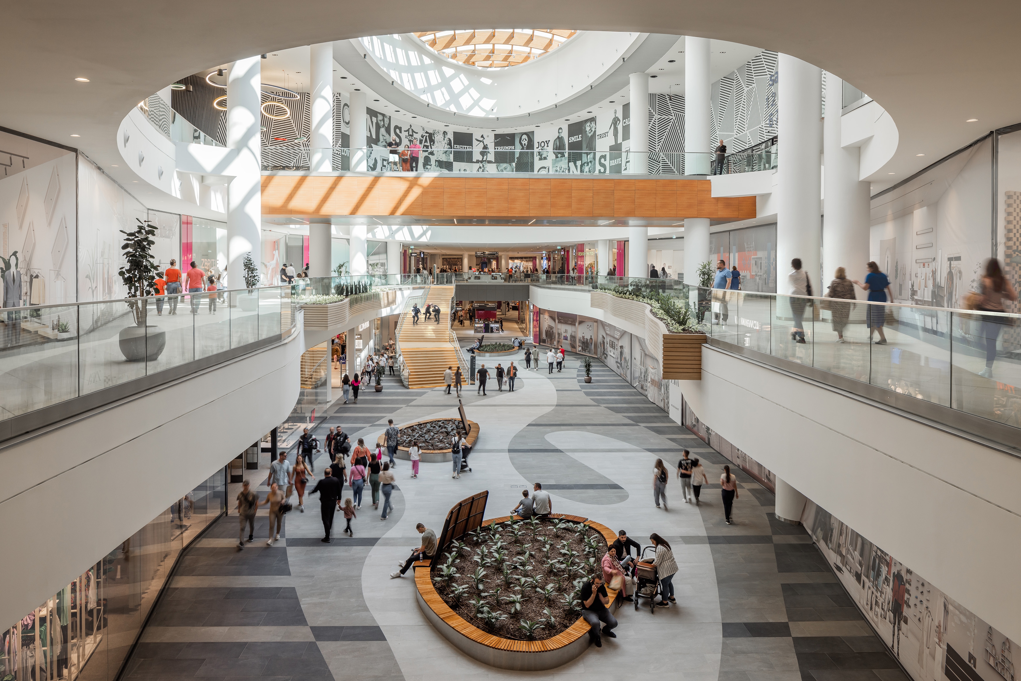 Natural materials like wood and stone create a warm, tranquil atmosphere. Metal and porcelain panels add visual interest, and thematic colors define different areas. Local materials connect the mall to its surroundings, enhancing its sense of place.