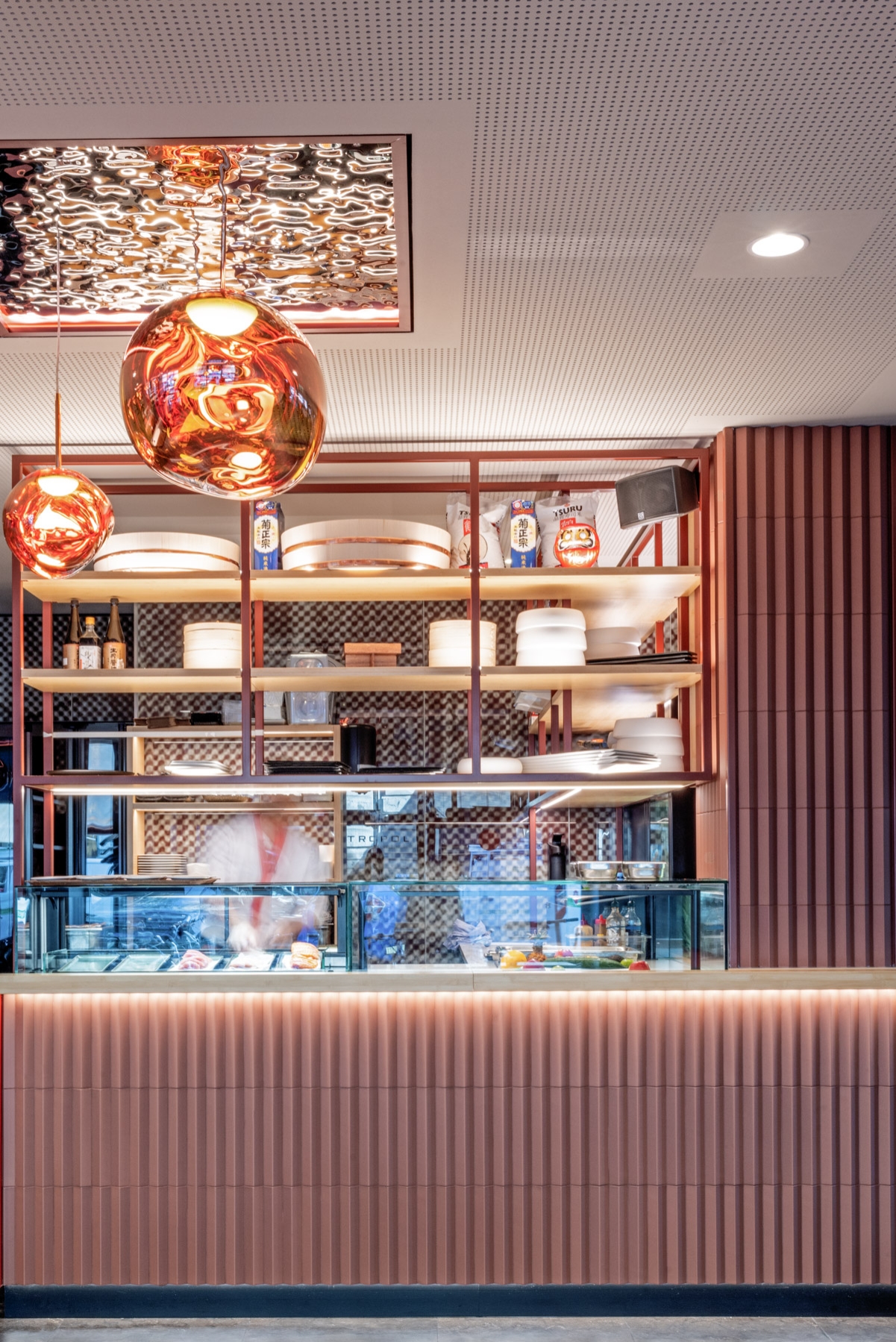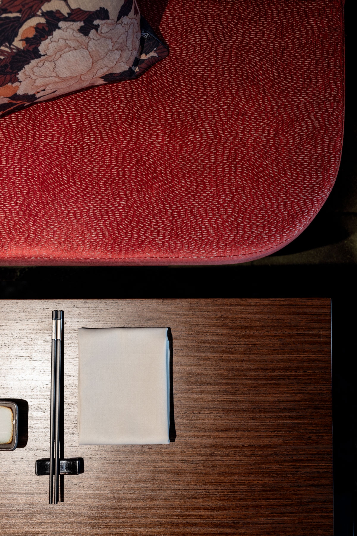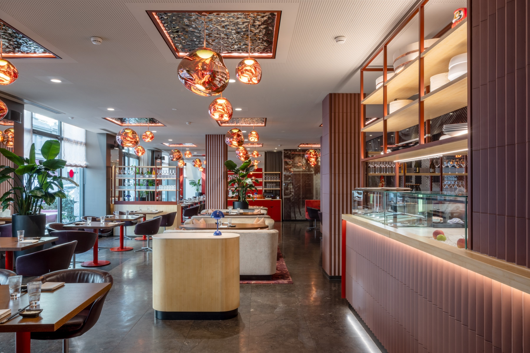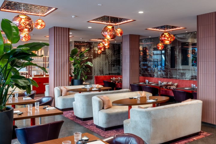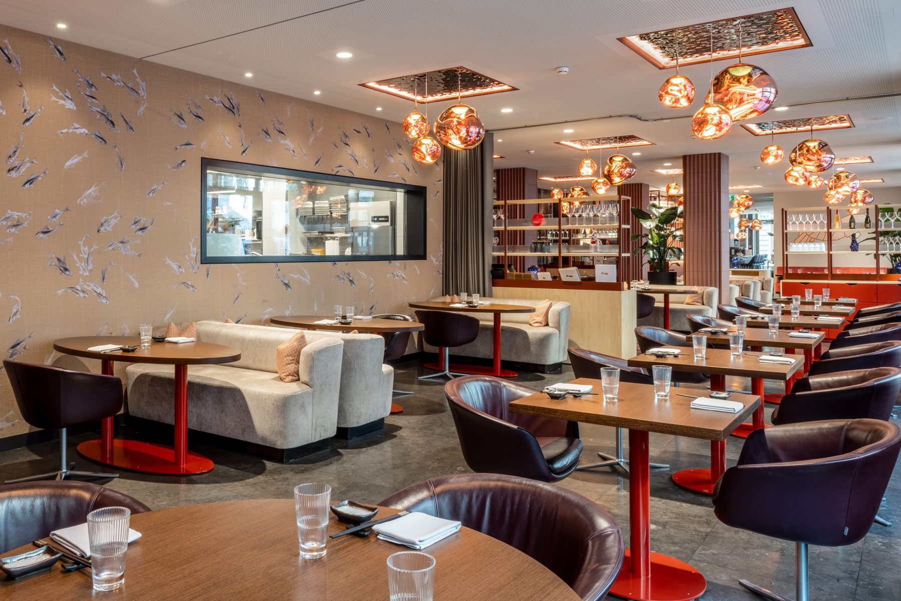 The recently redesigned Asian restaurant Metropol in Zürich has undergone a striking transformation. The centerpiece is the new sushi counter, where a skilled chef prepares fresh sushi, adding a captivating culinary spectacle.