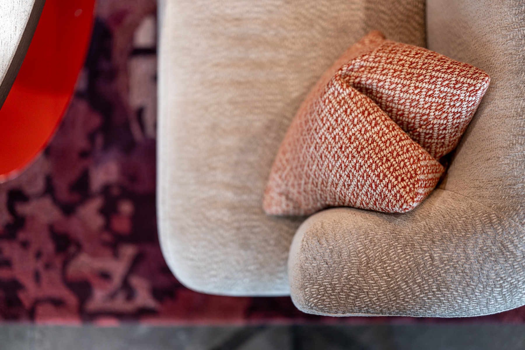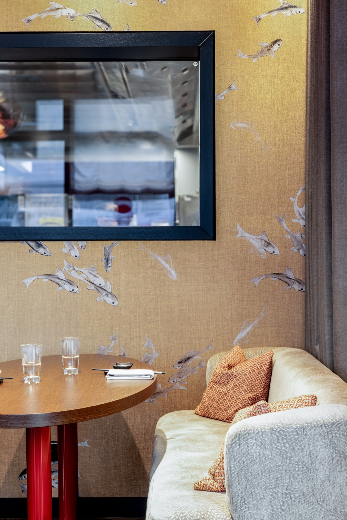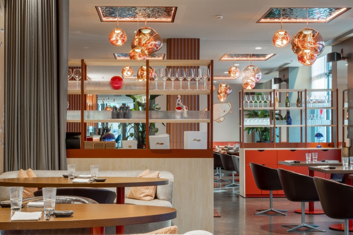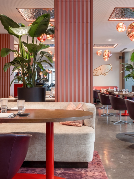Copper lights, resembling glowing bubbles, grace the interior, casting a warm and inviting ambiance in earthy red tones. A large window provides a glimpse into our bustling kitchen, connecting diners to the culinary process.To enhance comfort, we’ve introduced a long banquette seat with sofas reupholstered in a seagrass-inspired fabric, evoking a sense of coastal serenity.These features combine to create an elegant yet relaxed dining experience, where the art of cuisine and design come together seamlessly. Come and savor the flavors in this captivating environment.