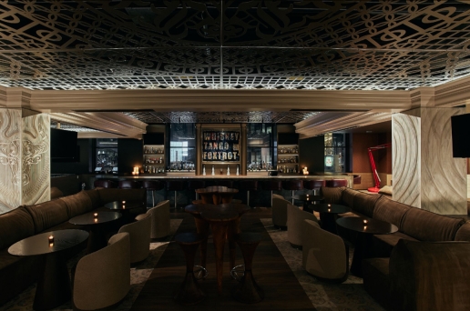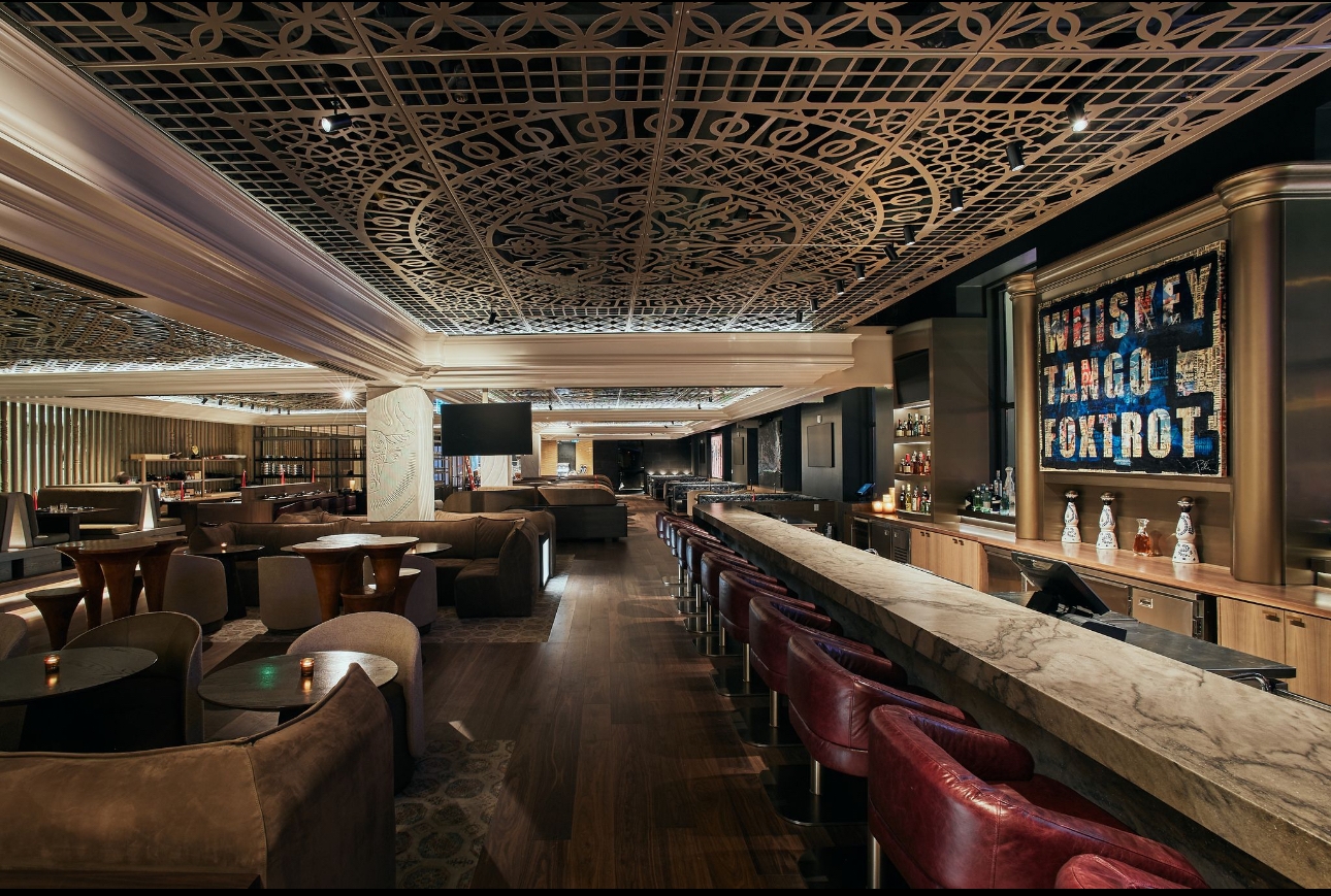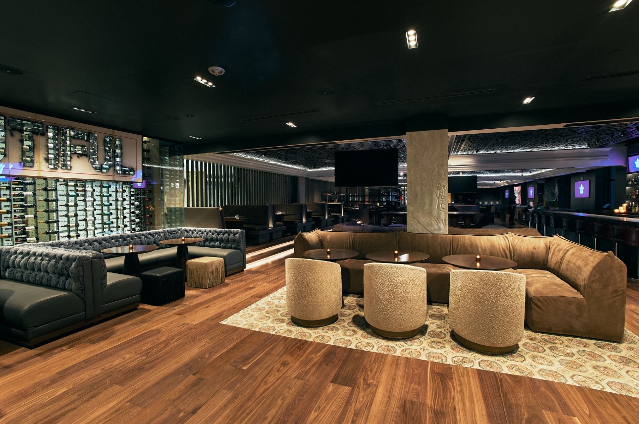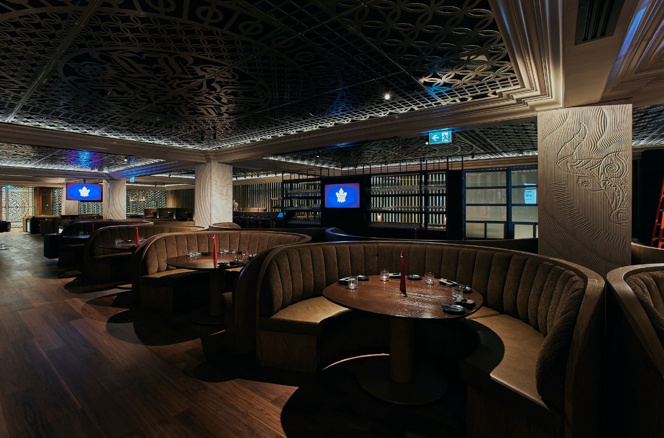 The design of Blue Bovine incorporates modernity, and traditional beaux-arts detailing to seamlessly meld with Union Station’s significant renovations and updates in recent years while preserving its historic elements. The design approach is a fusion of various inspirations blending sleek modernism with classic industrial design elements. This intersection becomes a testament to the unique narrative within Union station’s landmark architectural fabric. Rich woods, natural stone, and bold sculptural detailing create an atmosphere that resonate with character and distinction. The symmetrical design of the ornate detailing on the ceiling panels, the marble clad grand entrance, and classical crown moulding is inspired by Union station’s Beaux-Arts architectural style, popular during the late 19th and early 20th centuries. Our curated art pieces bring a sexy street-style to the space. Intentionally commissioned works by Mr Brainwash, Mr Pinkbrush, Peter Tunney, and local Toronto artist Peter Triantos add colour, vibrancy and character to the monochromatic space. This street art reflects modern culture, and the vibrancy of the urban neighborhood of the location of the restaurant.