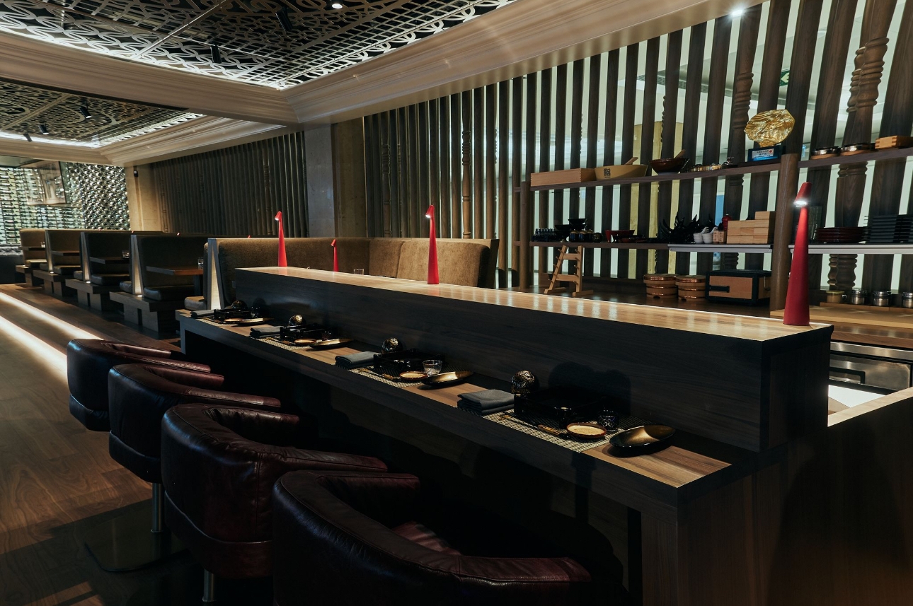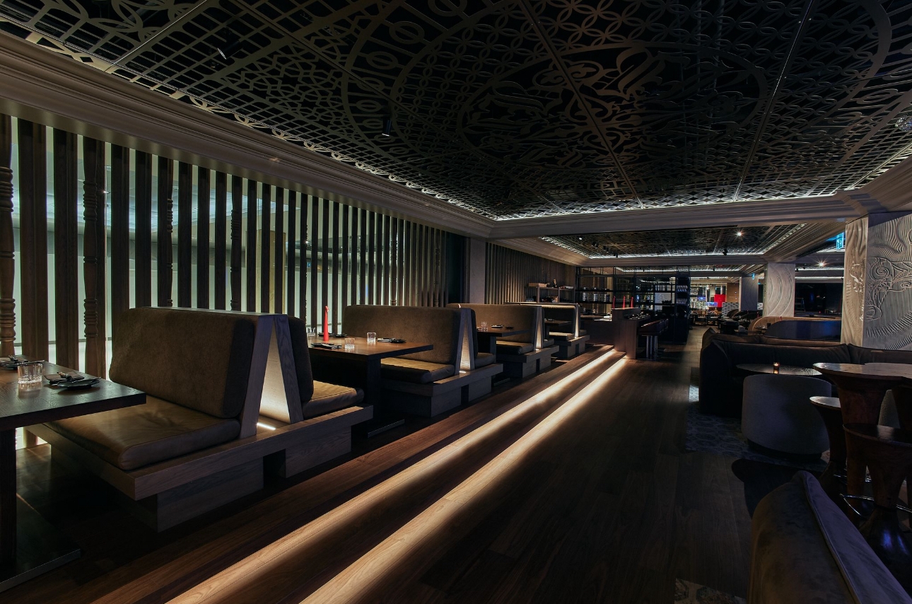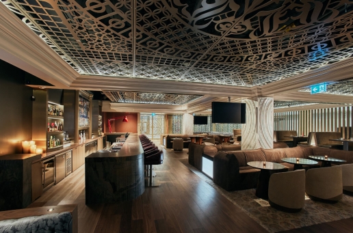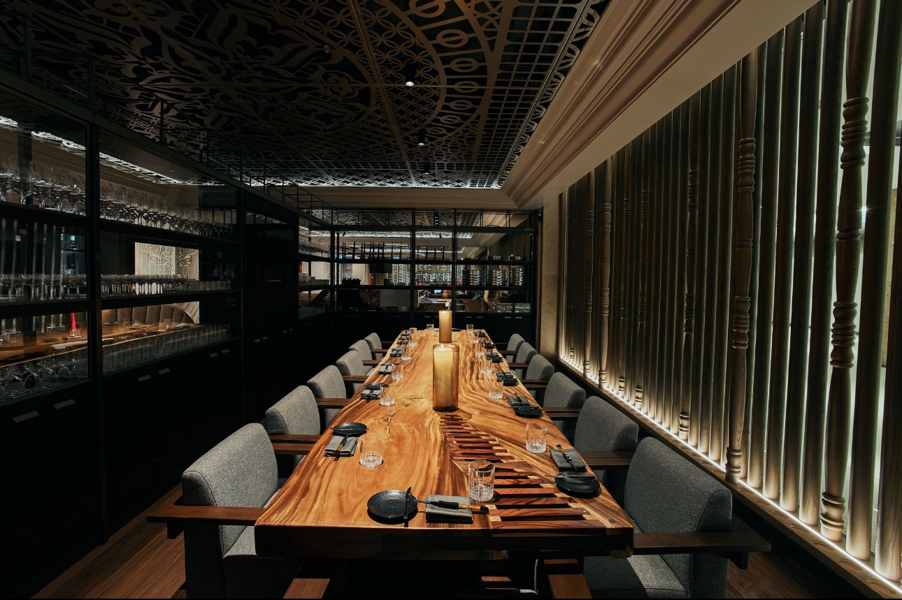 The design of Blue Bovine incorporates modernity, and traditional beaux-arts detailing to seamlessly meld with Union Station’s significant renovations and updates in recent years while preserving its historic elements. The design approach is a fusion of various inspirations blending sleek modernism with classic industrial design elements. This intersection becomes a testament to the unique narrative within Union station’s landmark architectural fabric. Rich woods, natural stone, and bold sculptural detailing create an atmosphere that resonate with character and distinction. The symmetrical design of the ornate detailing on the ceiling panels, the marble clad grand entrance, and classical crown moulding is inspired by Union station’s Beaux-Arts architectural style, popular during the late 19th and early 20th centuries. Our curated art pieces bring a sexy street-style to the space. Intentionally commissioned works by Mr Brainwash, Mr Pinkbrush, Peter Tunney, and local Toronto artist Peter Triantos add colour, vibrancy and character to the monochromatic space. This street art reflects modern culture, and the vibrancy of the urban neighborhood of the location of the restaurant.