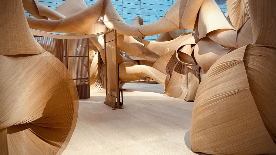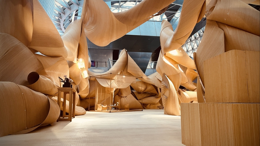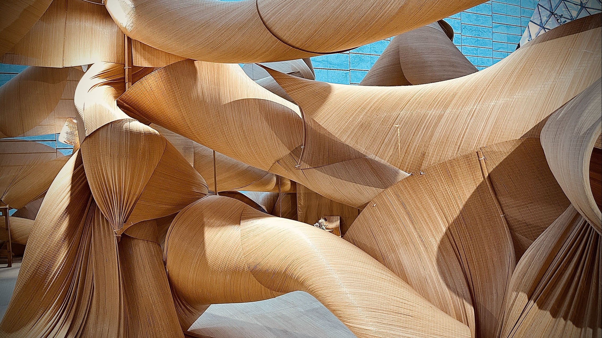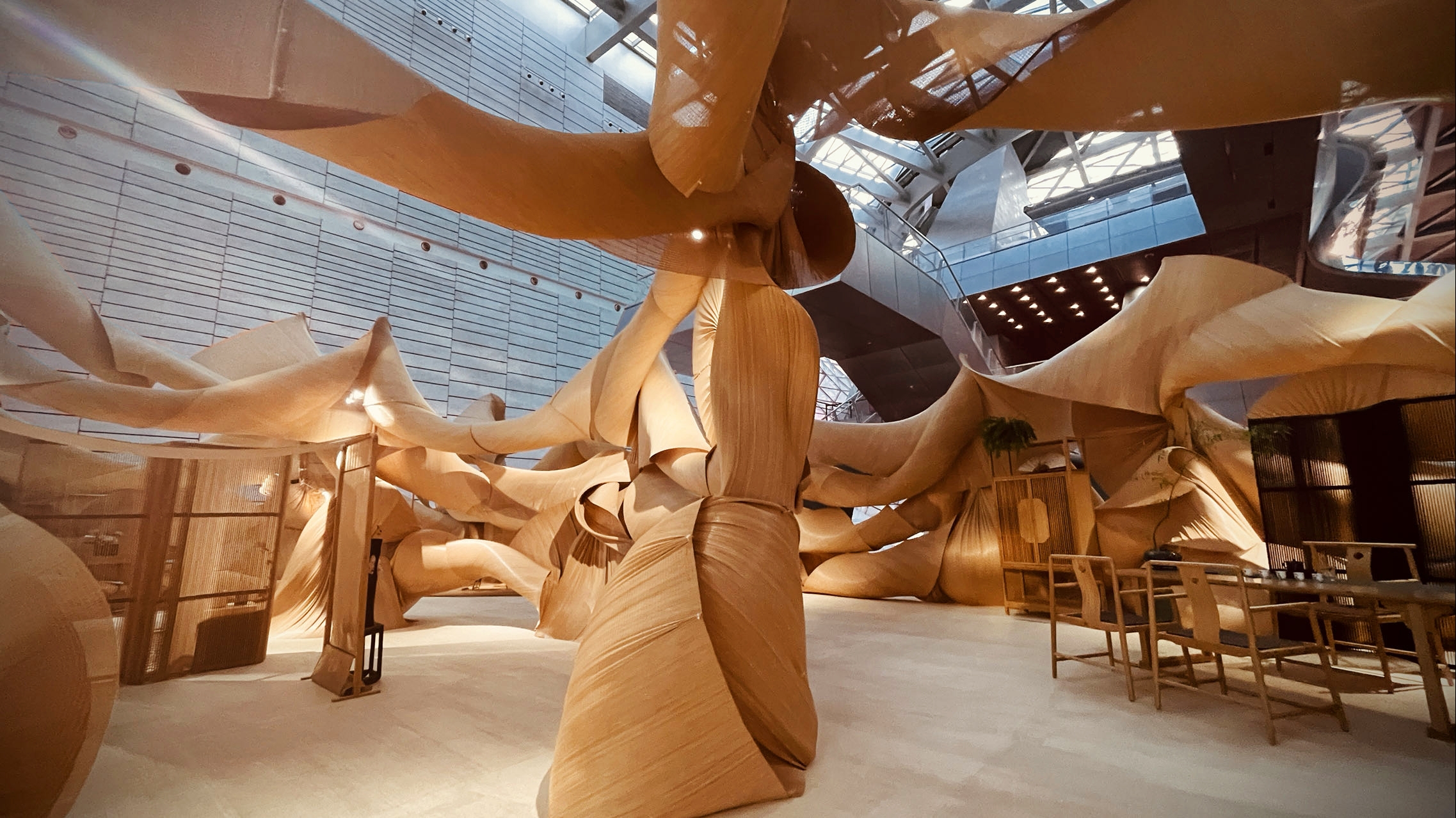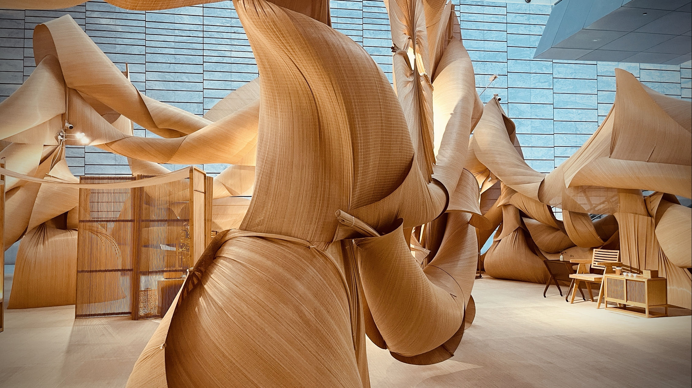 It is built upon a sturdy pine wood frame, while the space within the installation is crafted with intricately woven Chinese bamboo curtains. This flexible structure exhibits dynamic stretching and fluidity, reminiscent of the rhythm and flow of traditional Chinese cursive calligraphy. The bamboo curtains utilized in its structure are all crafted from natural Chinese bamboo and are entirely reusable. They transcend the conventional use of bamboo materials and are presented as a form of contemporary art installation.