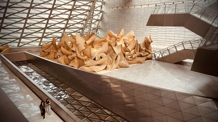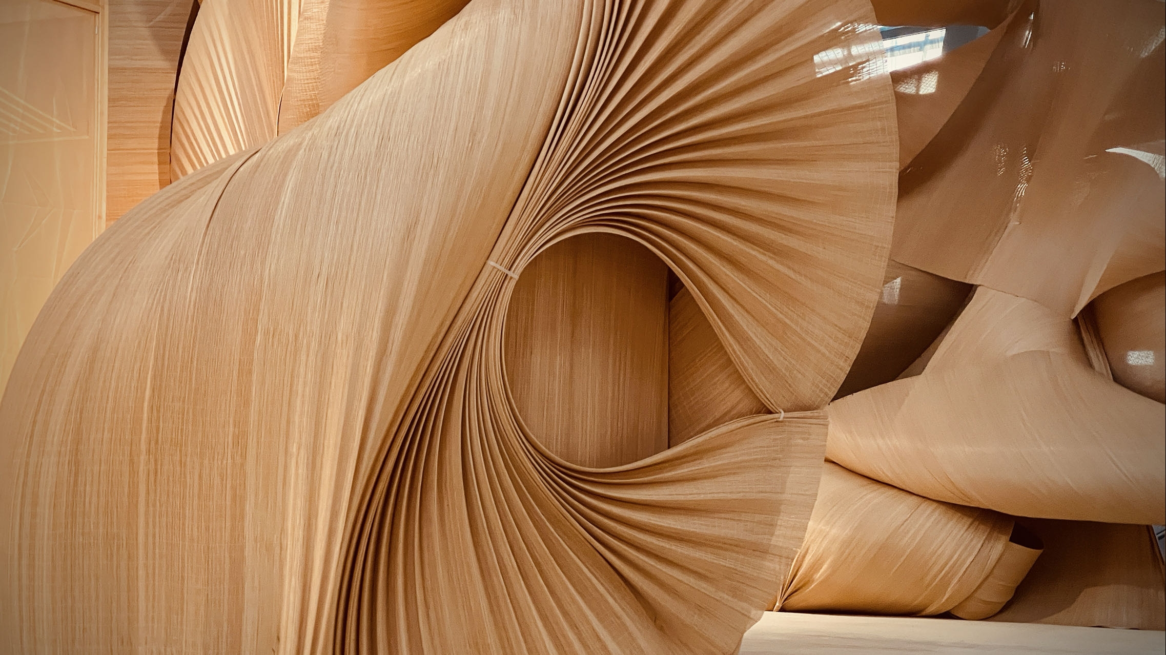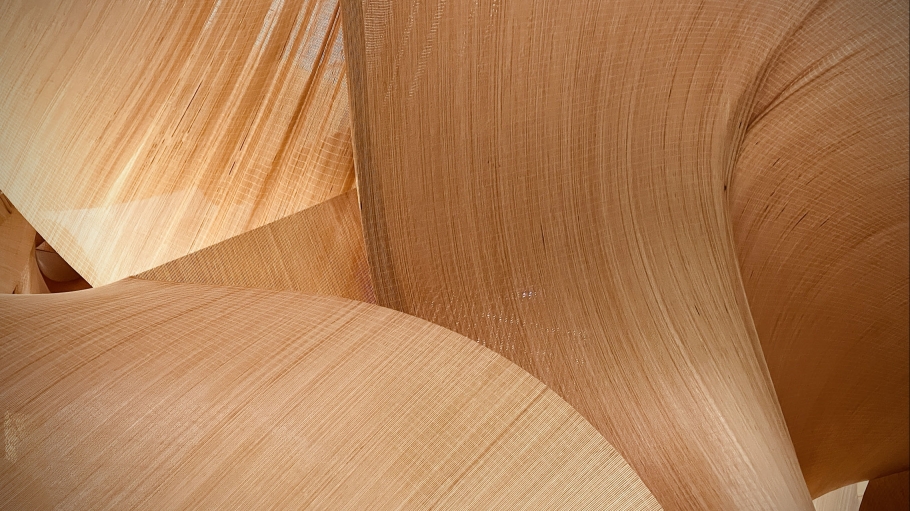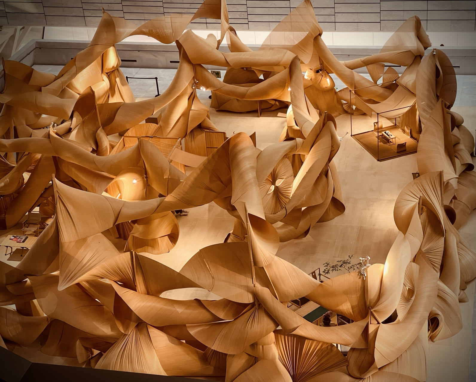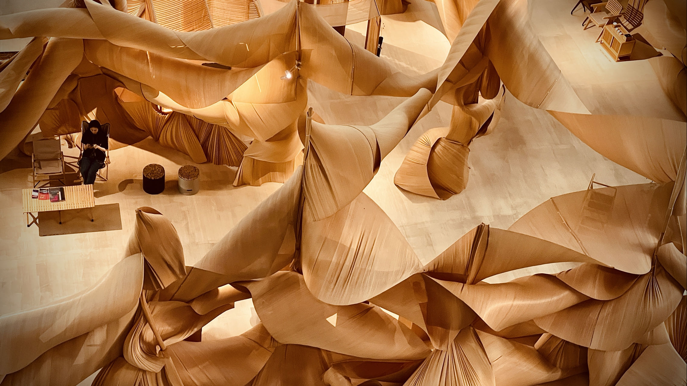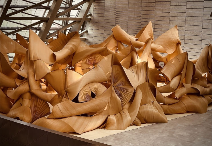 It is built upon a sturdy pine wood frame, while the space within the installation is crafted with intricately woven Chinese bamboo curtains. This flexible structure exhibits dynamic stretching and fluidity, reminiscent of the rhythm and flow of traditional Chinese cursive calligraphy. The bamboo curtains utilized in its structure are all crafted from natural Chinese bamboo and are entirely reusable. They transcend the conventional use of bamboo materials and are presented as a form of contemporary art installation.